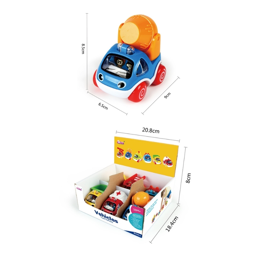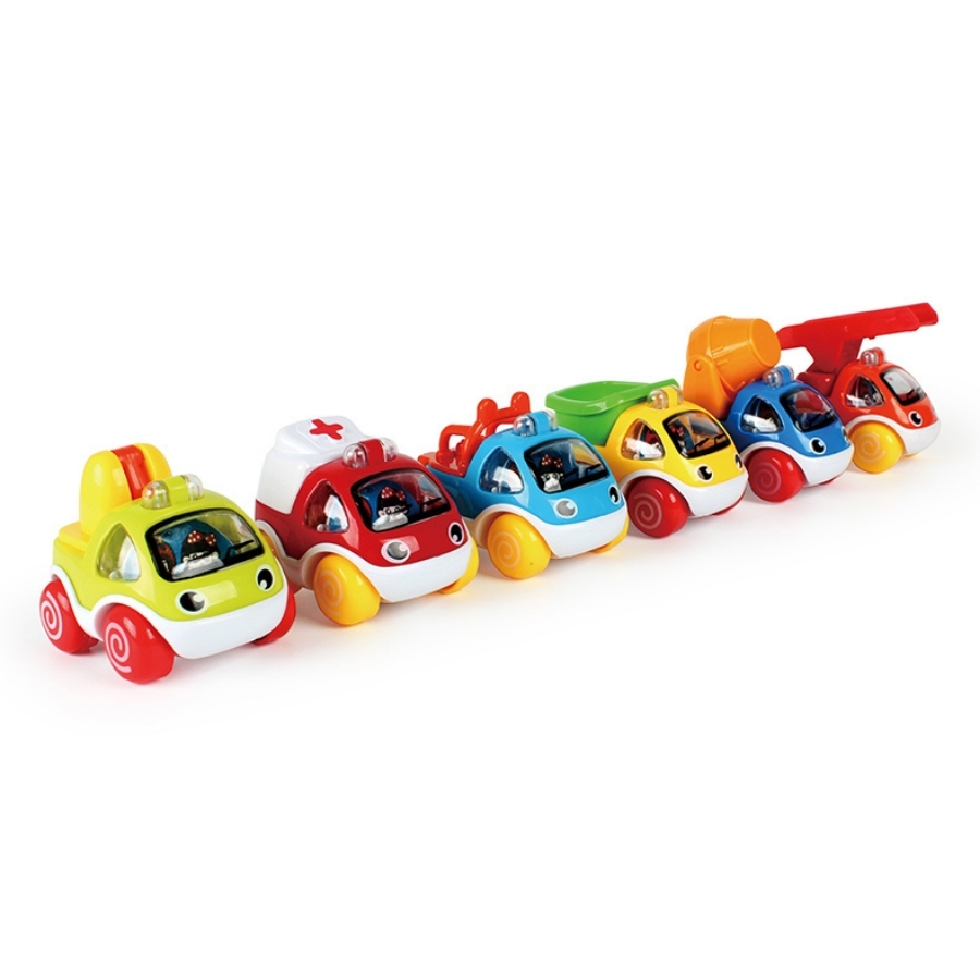 Bộ 6 chiếc xe siêu dễ thương với nhân vật lái vui nhộn: cứu hộ, cứu thương, cứu hỏa, xe ben, xe trộn, xe cần cẩu.