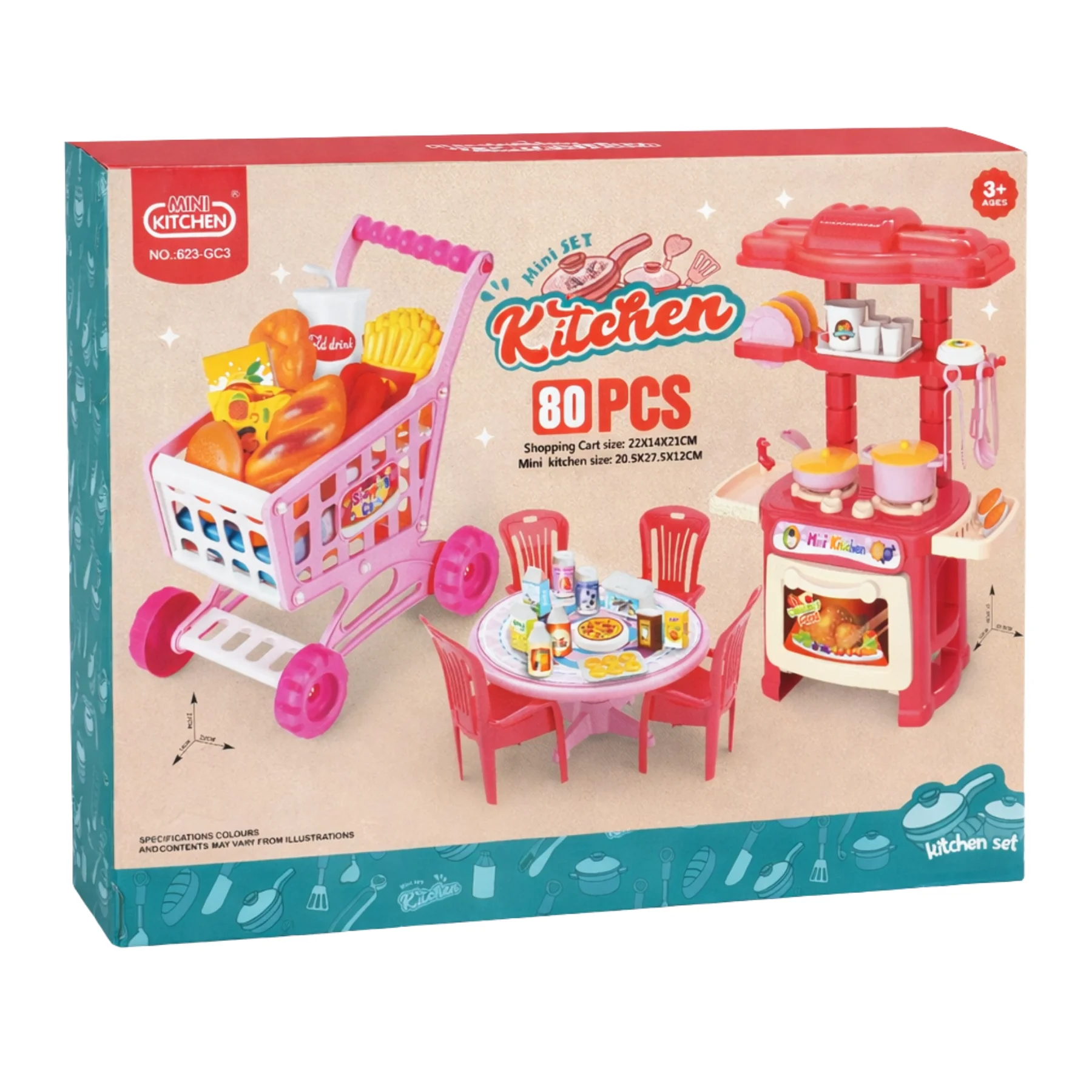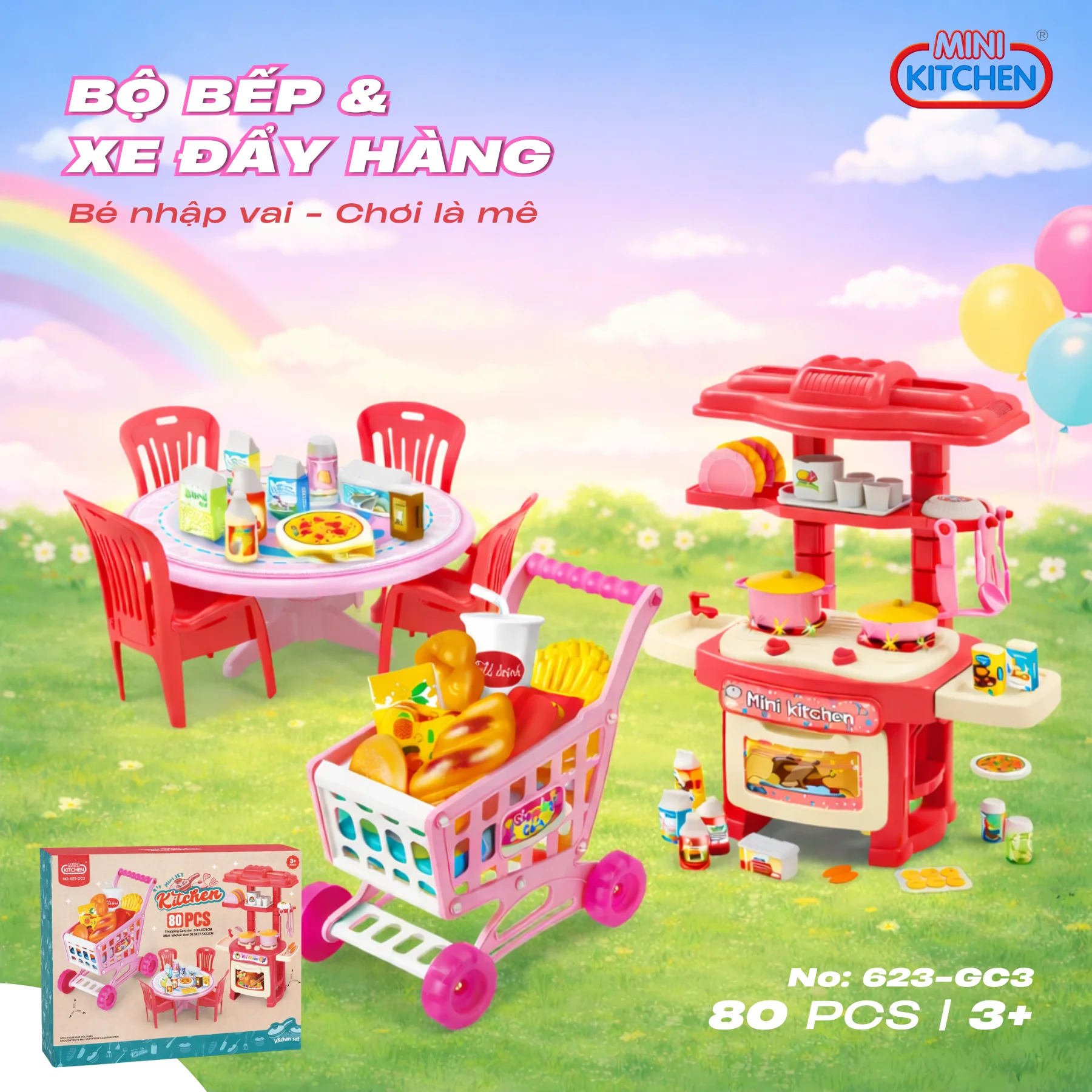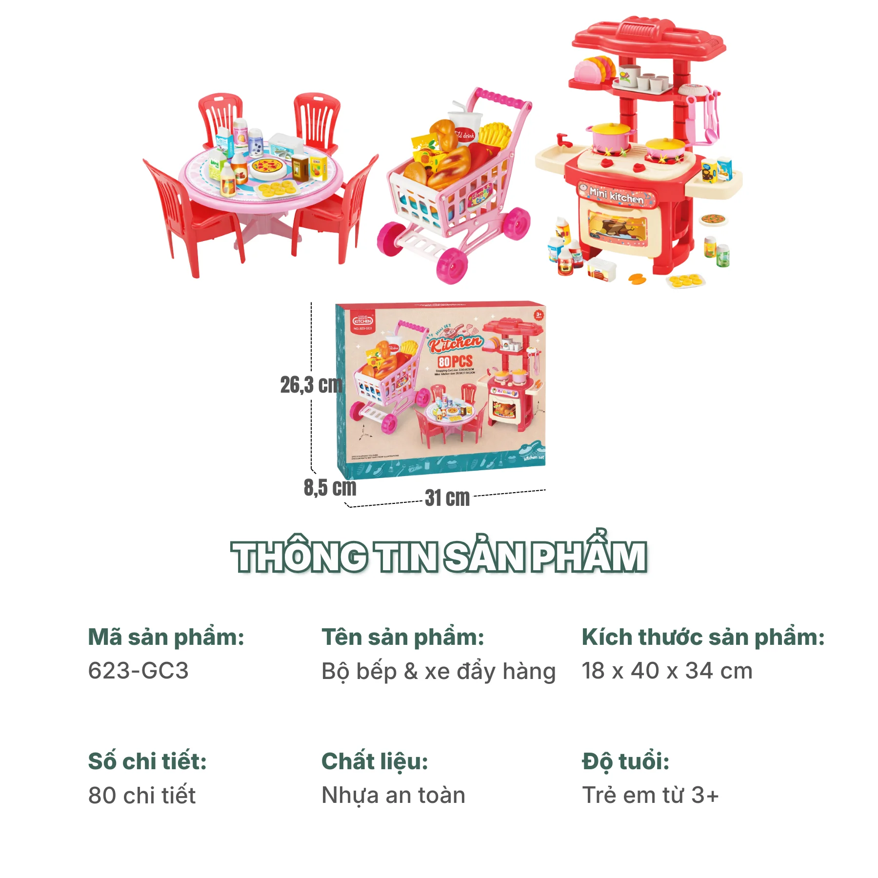 Bộ bếp & xe đẩy hàng đồ chơi Mini Kitchen 623-GC3 là bộ đồ chơi nhập vai đa năng, kết hợp giữa khu bếp nấu ăn mini, bàn ăn gia đình và xe đẩy mua sắm, mang đến không gian vui chơi phong phú và sinh động cho bé từ 3 tuổi trở lên.