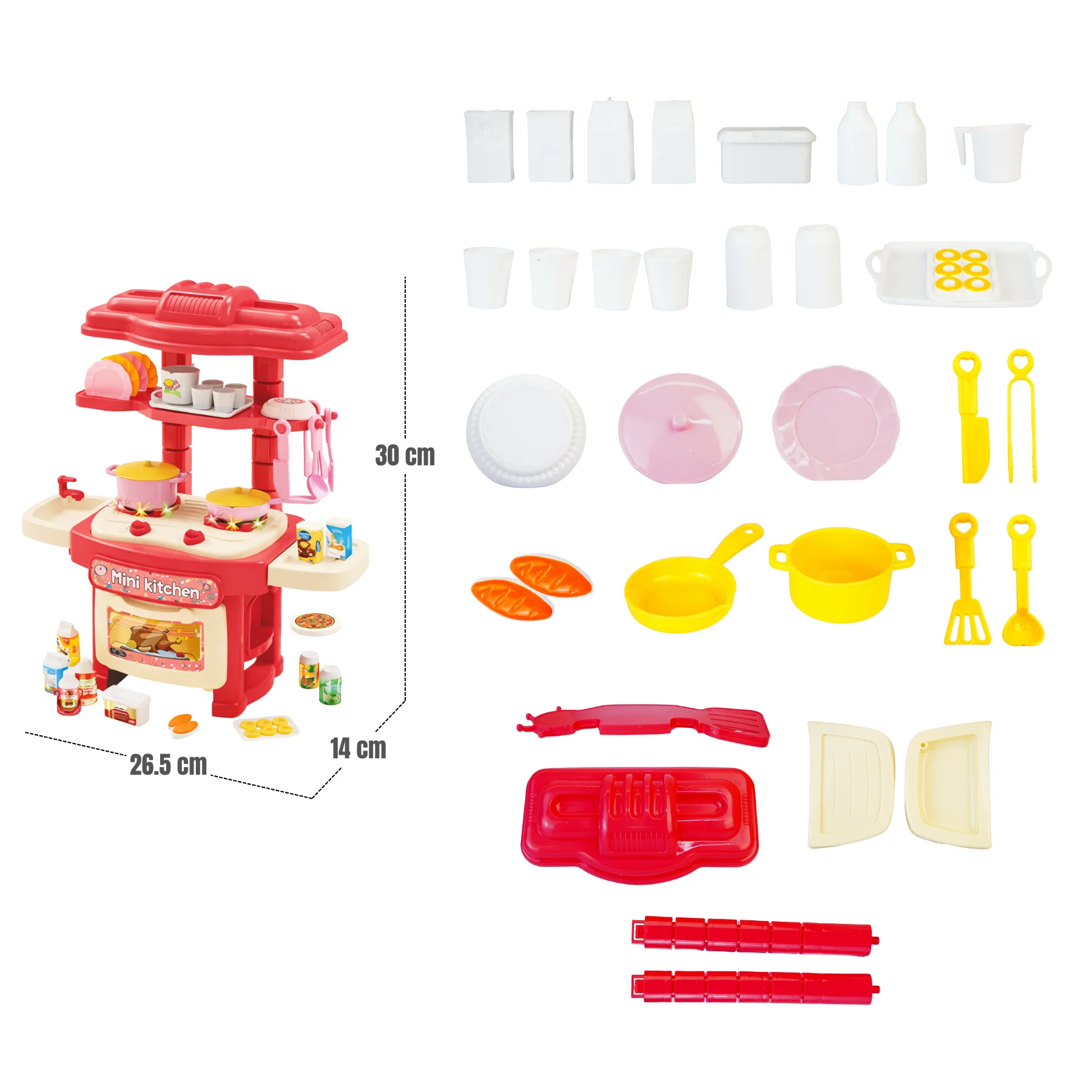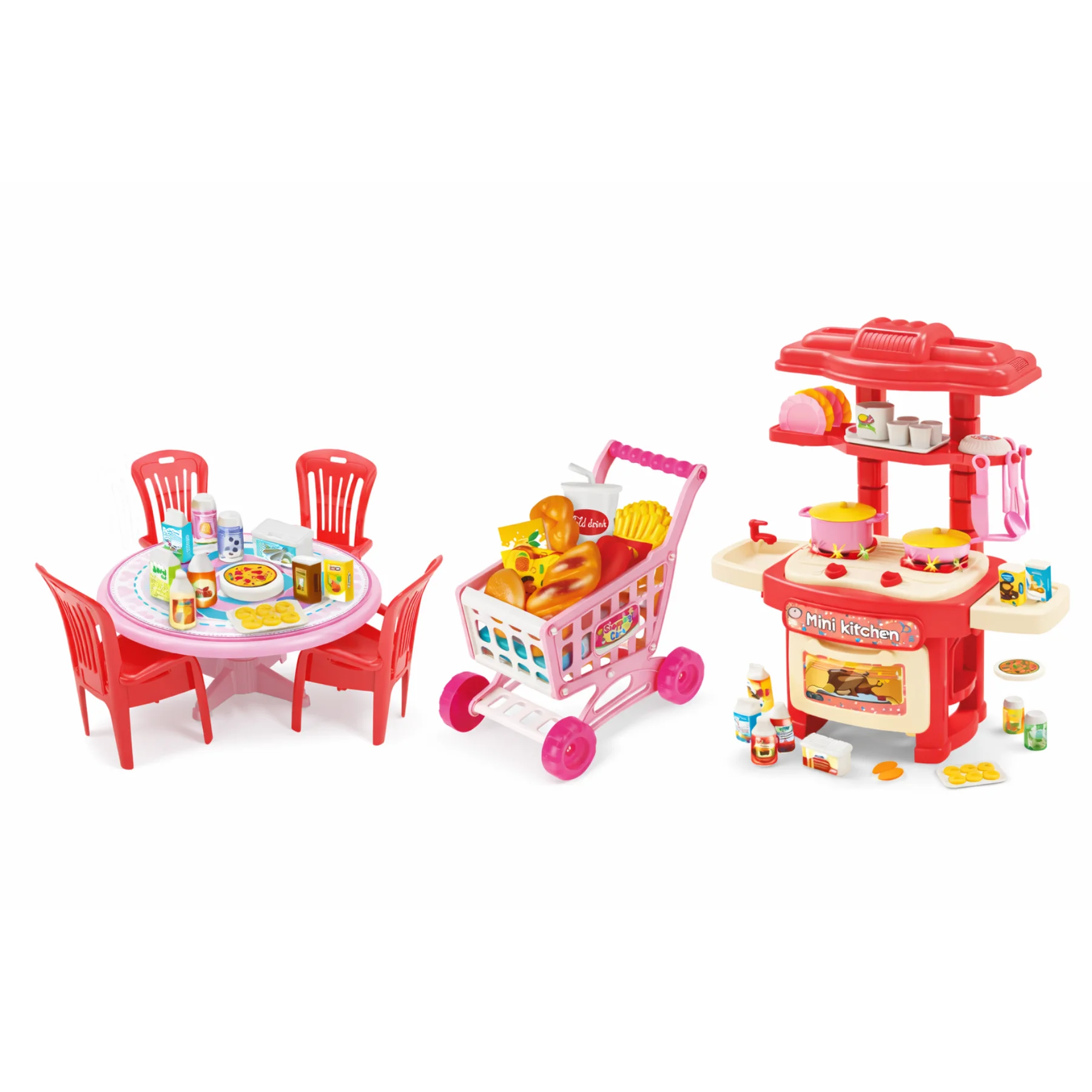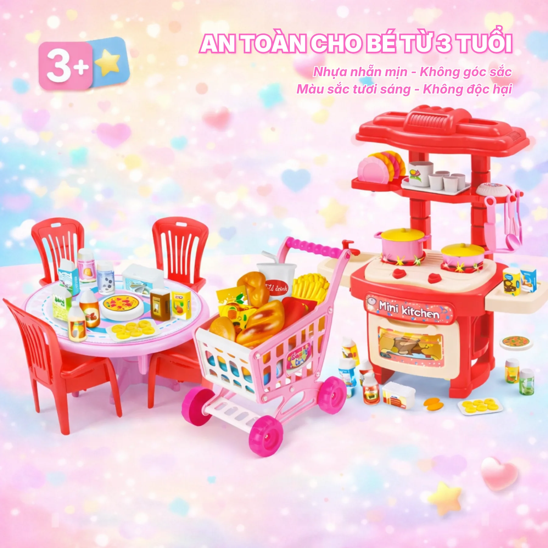 Sản phẩm được thiết kế mô phỏng chân thực các hoạt động quen thuộc trong sinh hoạt hằng ngày như nấu ăn, bày bàn ăn và đi chợ mua thực phẩm. Khu bếp mini có bếp nấu, lò nướng, kệ để đồ và nhiều phụ kiện đi kèm giúp bé dễ dàng nhập vai đầu bếp nhí. Xe đẩy hàng có bánh xe chắc chắn, tay cầm vừa tầm, cho bé thoải mái “đi chợ” và sắp xếp thực phẩm.
