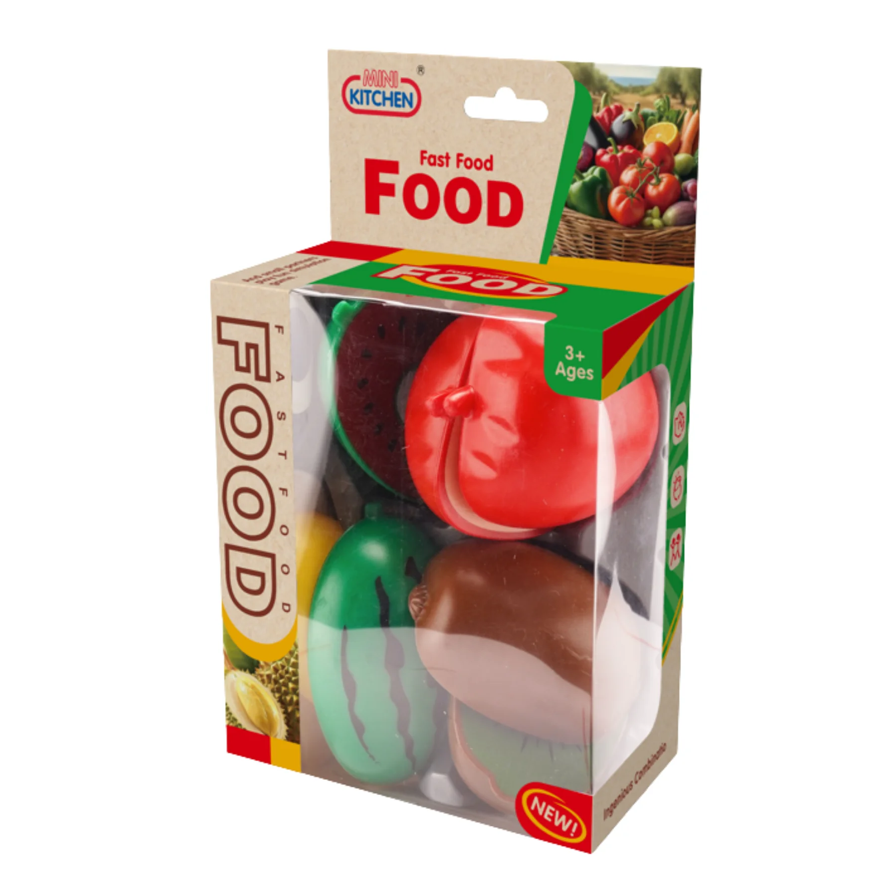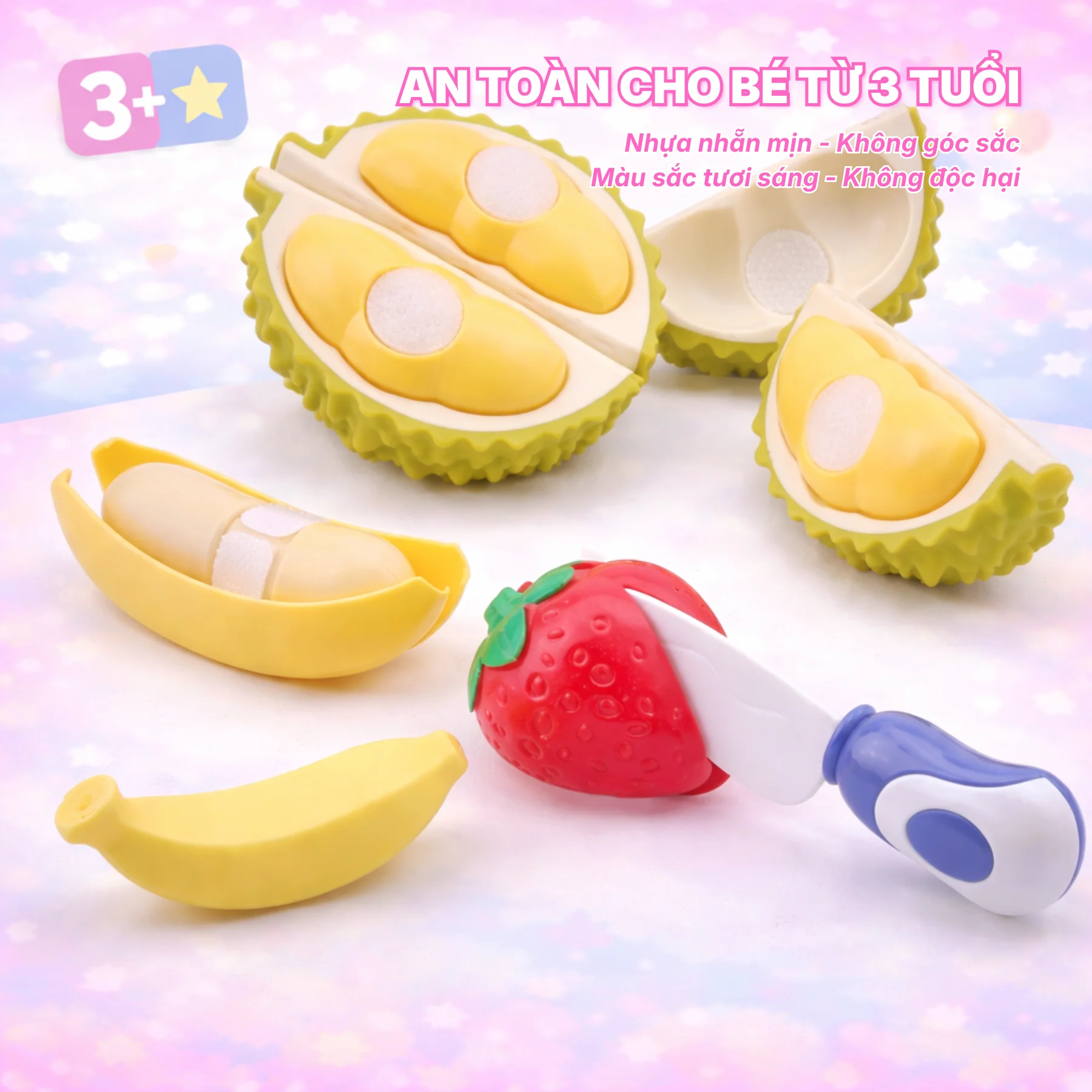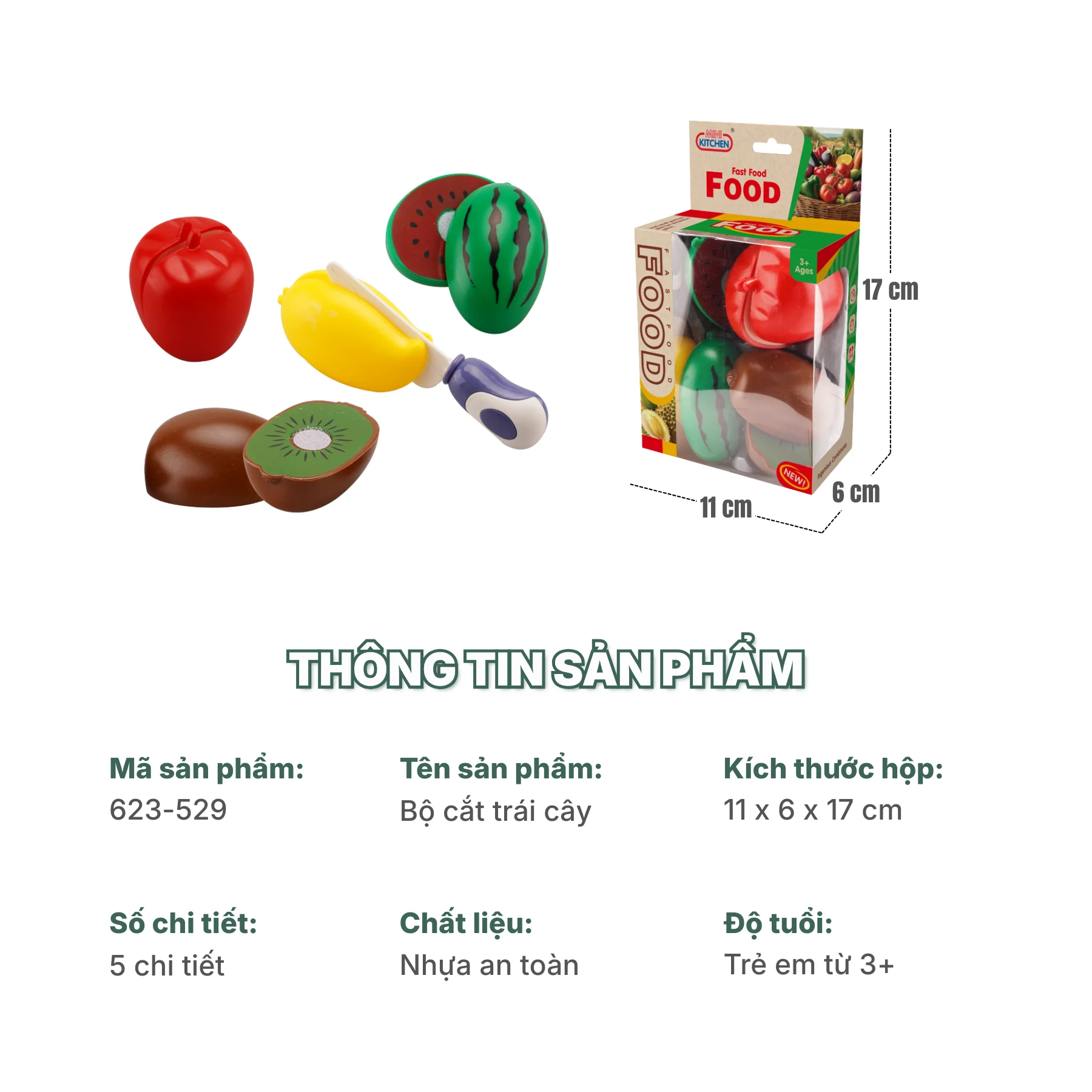 Bộ sản phẩm đi kèm dao đồ chơi vừa tay trẻ nhỏ, hỗ trợ bé thực hành các hoạt động sơ chế thực phẩm như cắt, chia phần, sắp xếp trái cây. Thông qua quá trình chơi, bé được rèn luyện vận động tinh, khả năng phối hợp tay – mắt và làm quen với các loại trái cây trong đời sống hằng ngày.