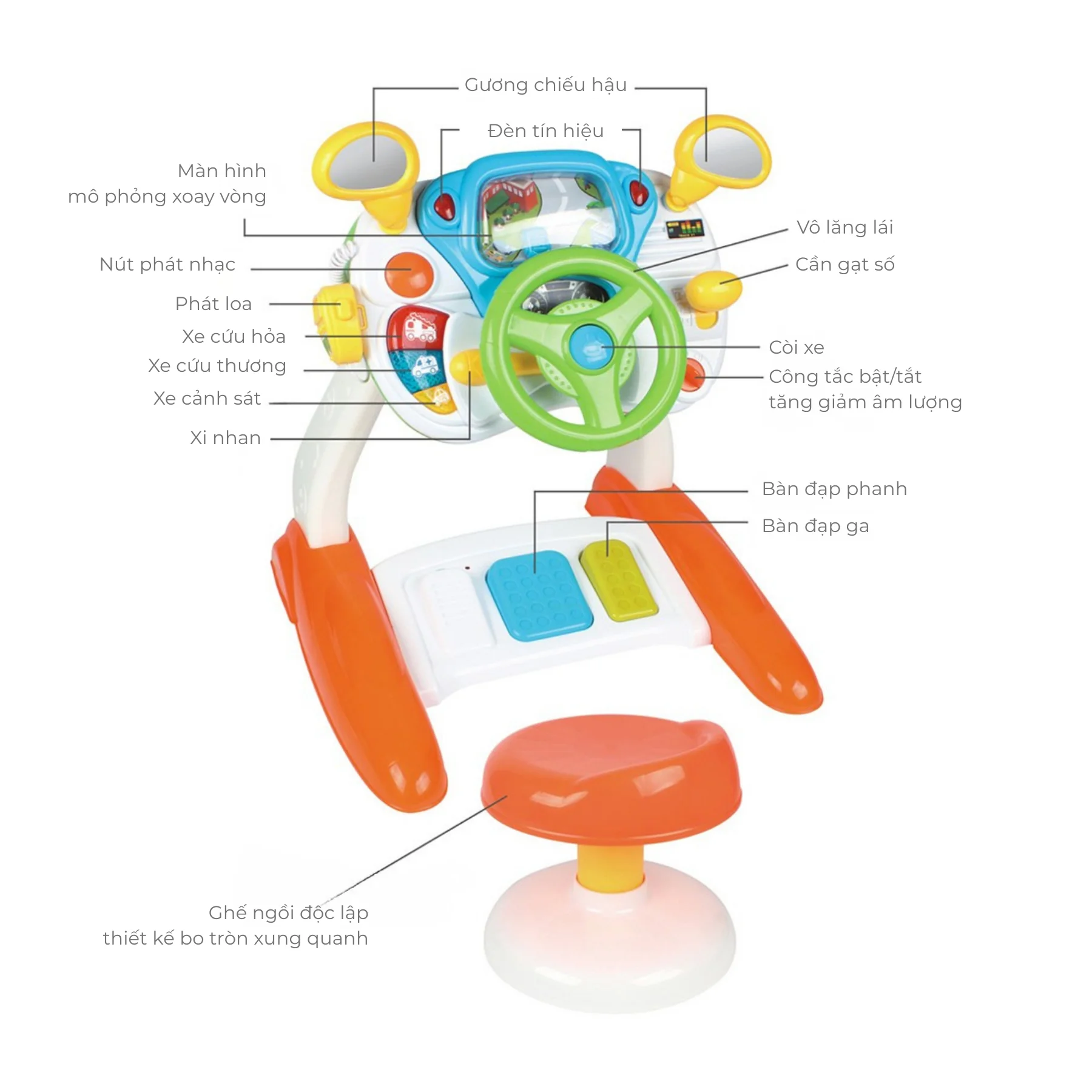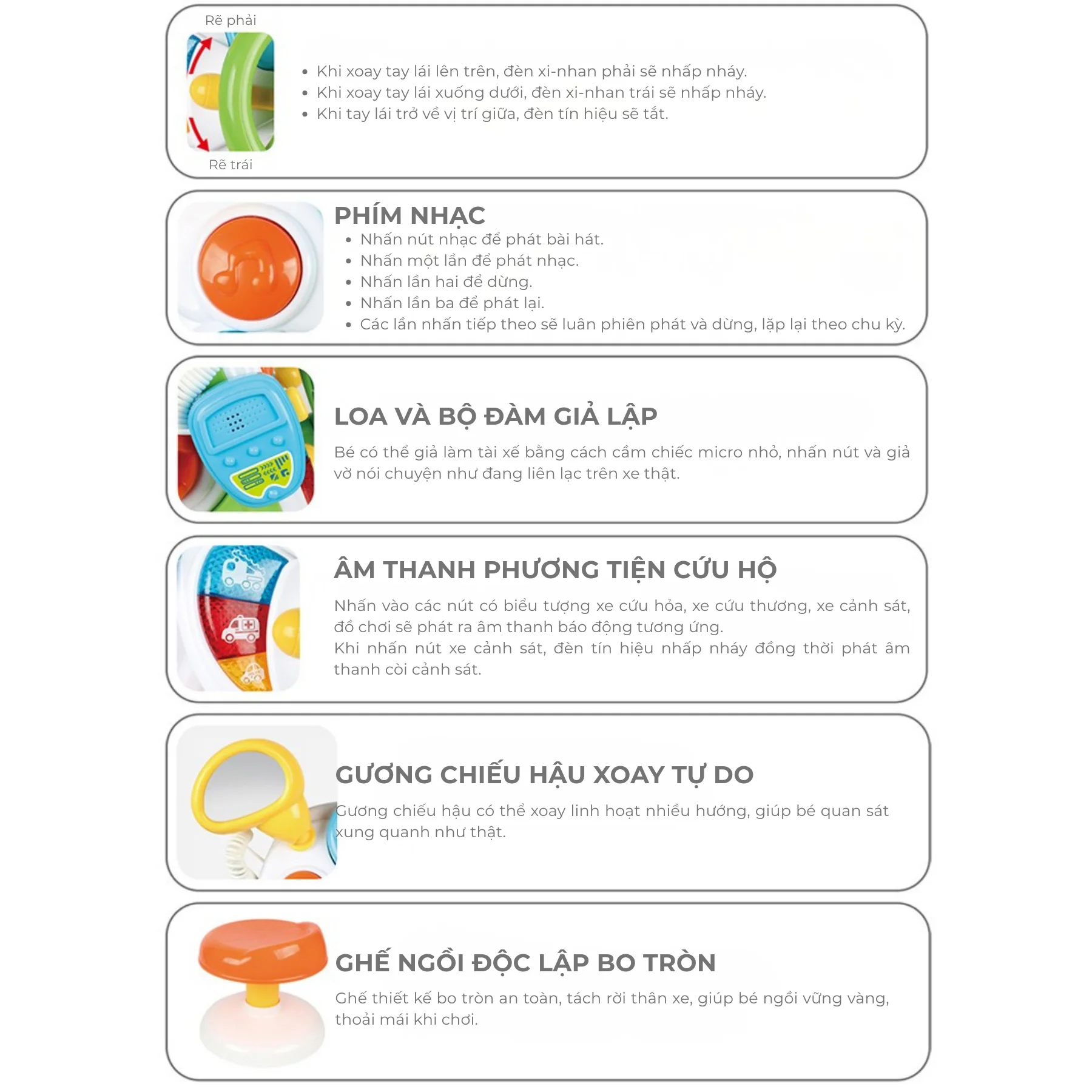 Bảng điều khiển có nút phát nhạc, bộ đàm giả lập, đèn tín hiệu và âm thanh phương tiện cứu hộ (xe cảnh sát, cứu hỏa, cứu thương).