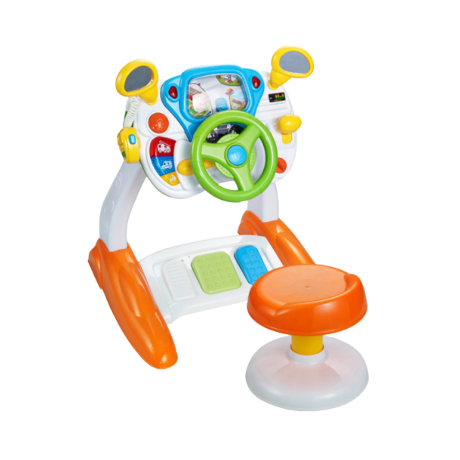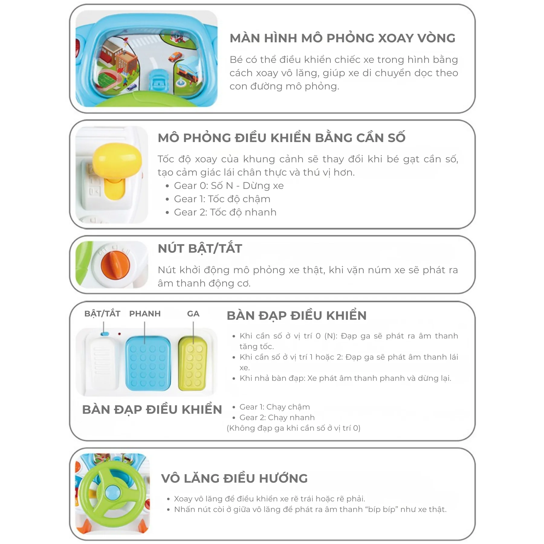 Màn hình mô phỏng xoay vòng: khung cảnh di chuyển theo hướng lái, giúp bé quan sát như đang lái xe thật.