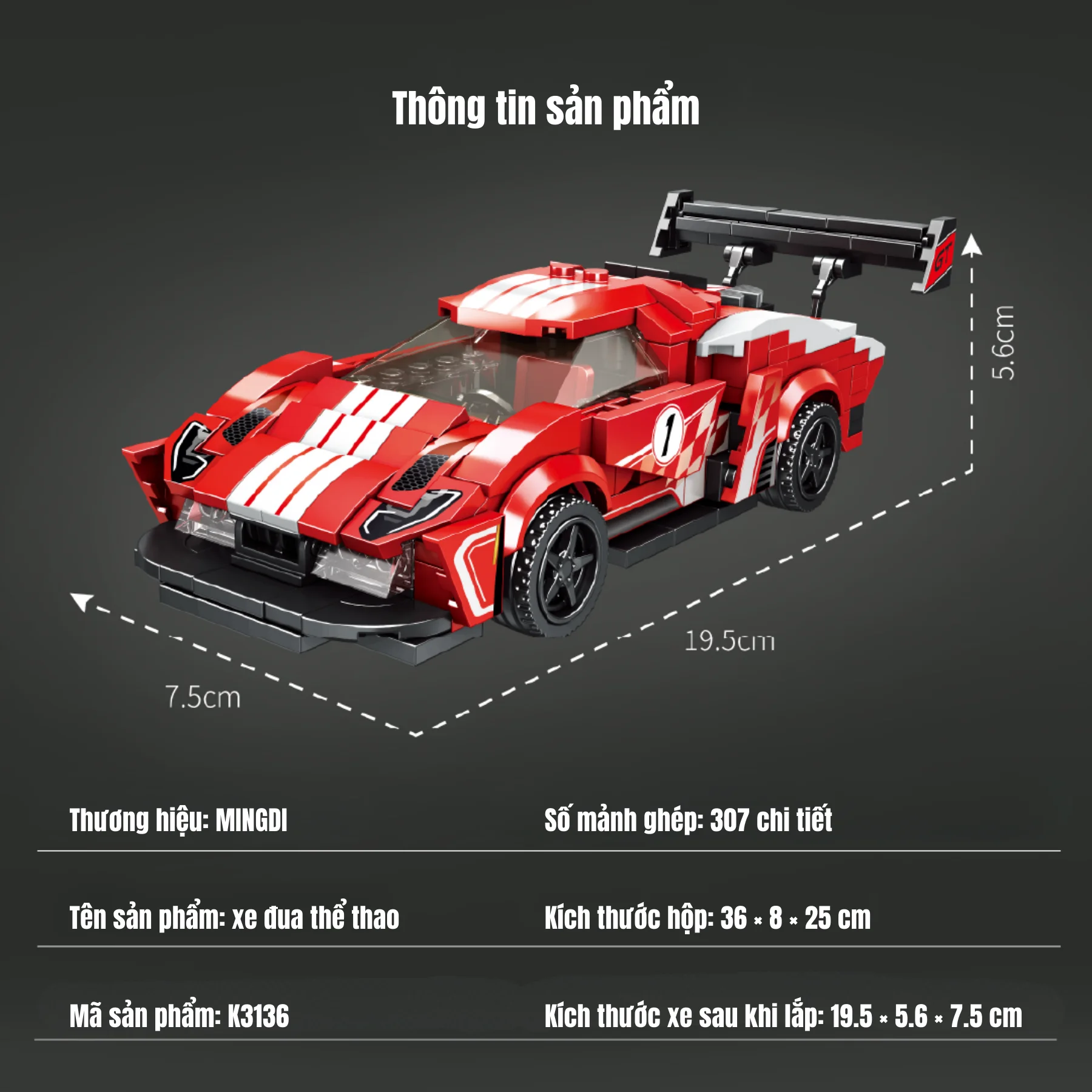 Bộ đồ chơi lắp ráp xe đua thể thao MINGDI K3136 gồm 307 chi tiết lắp ráp chắc chắn, mô phỏng mẫu xe đua tốc độ với tông màu đỏ nổi bật và kiểu dáng khí động học mạnh mẽ. Bé từ 6 tuổi có thể tự tay lắp hoàn chỉnh mô hình siêu xe và khám phá thế giới kỹ thuật thú vị.