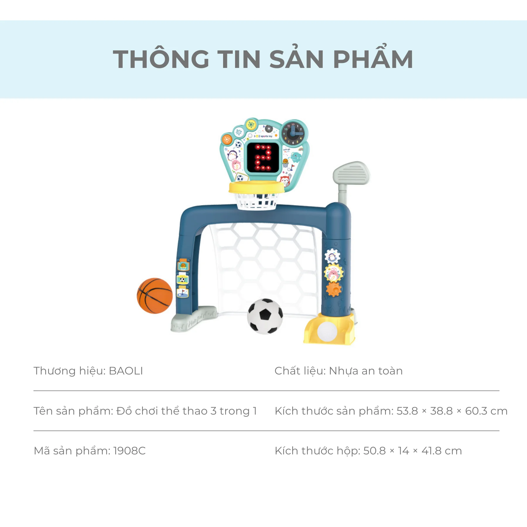 Bộ đồ chơi vận động 3 trong 1 BAOLI 1908C là bộ thể thao mini kết hợp bóng rổ – bóng đá – golf trong cùng một khung thành thông minh, giúp bé vừa chơi vừa rèn luyện thể chất, phát triển toàn diện ngay tại nhà. Thiết kế hiện đại, màu sắc tươi sáng, tích hợp bảng điều khiển có đèn LED, đồng hồ học số và âm thanh sinh động, mang đến cho bé giờ chơi năng động, vui nhộn và bổ ích.