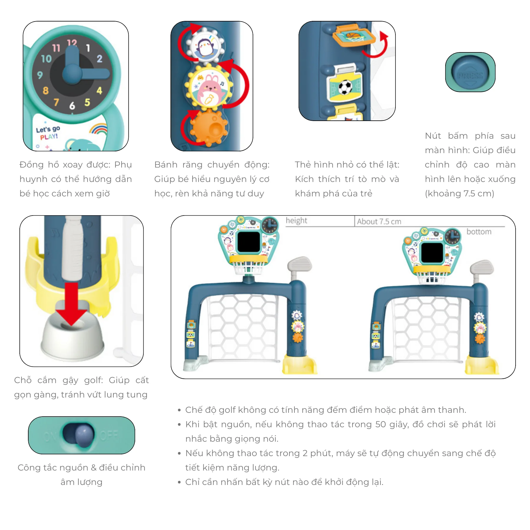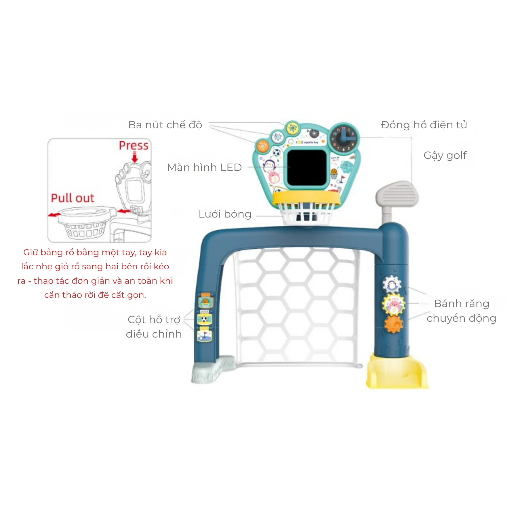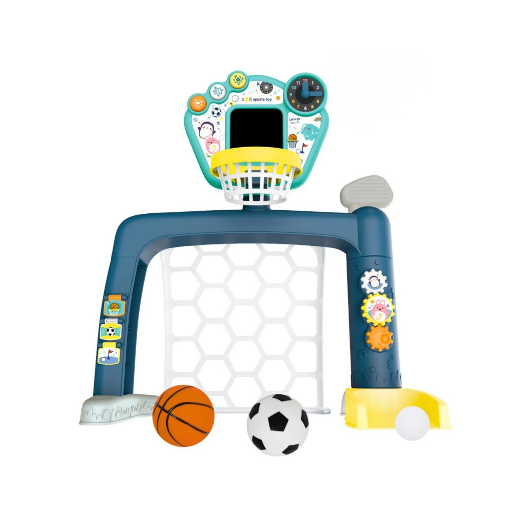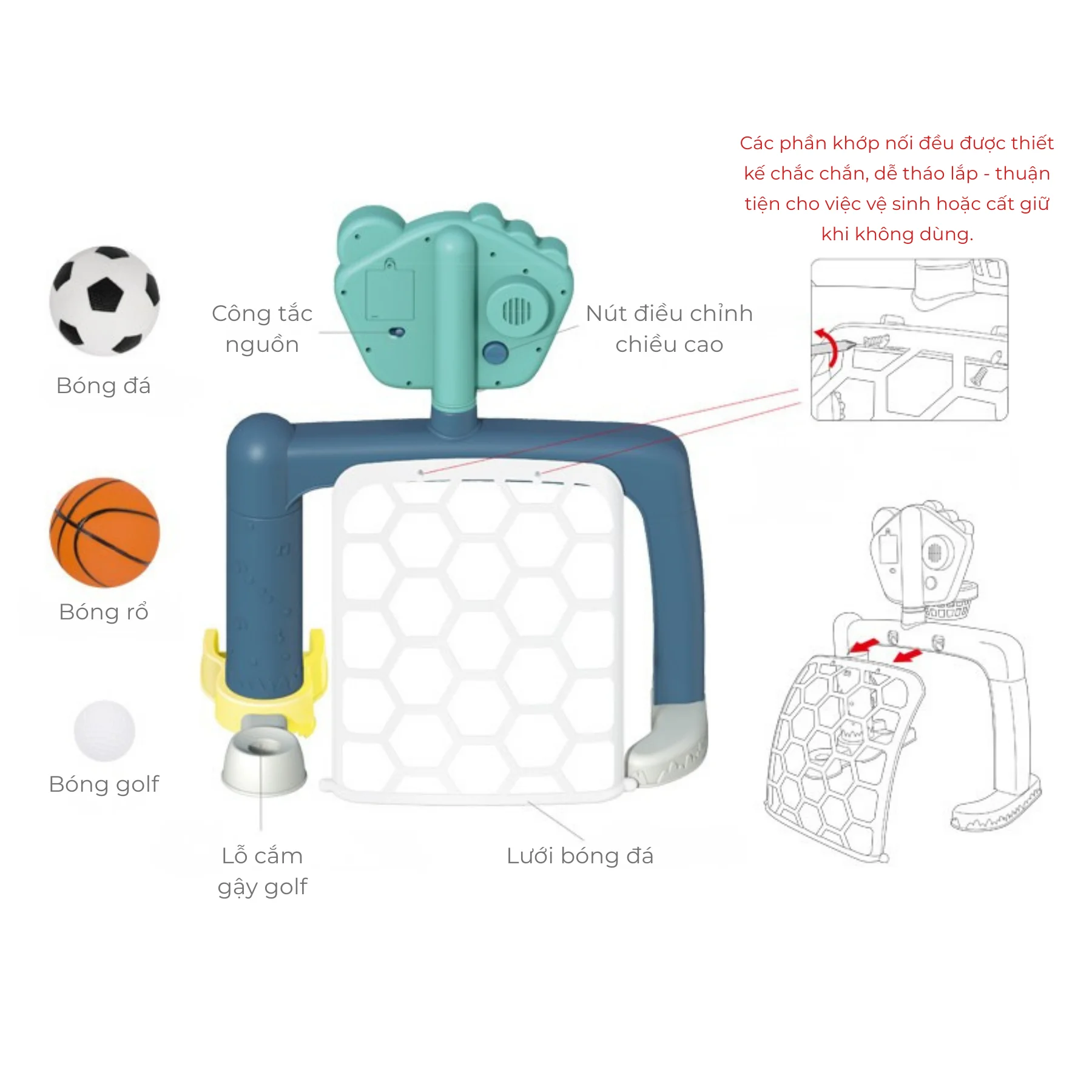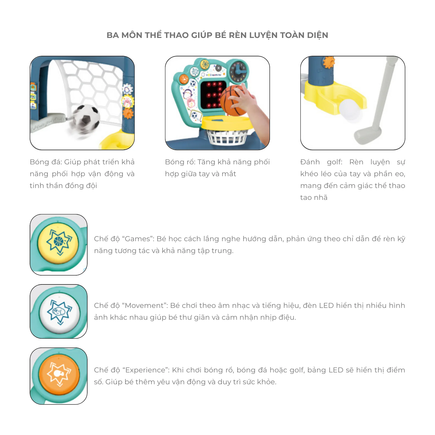 3 môn thể thao trong 1: Bóng rổ, bóng đá, golf mini – cho bé chơi đa dạng, không nhàm chán.