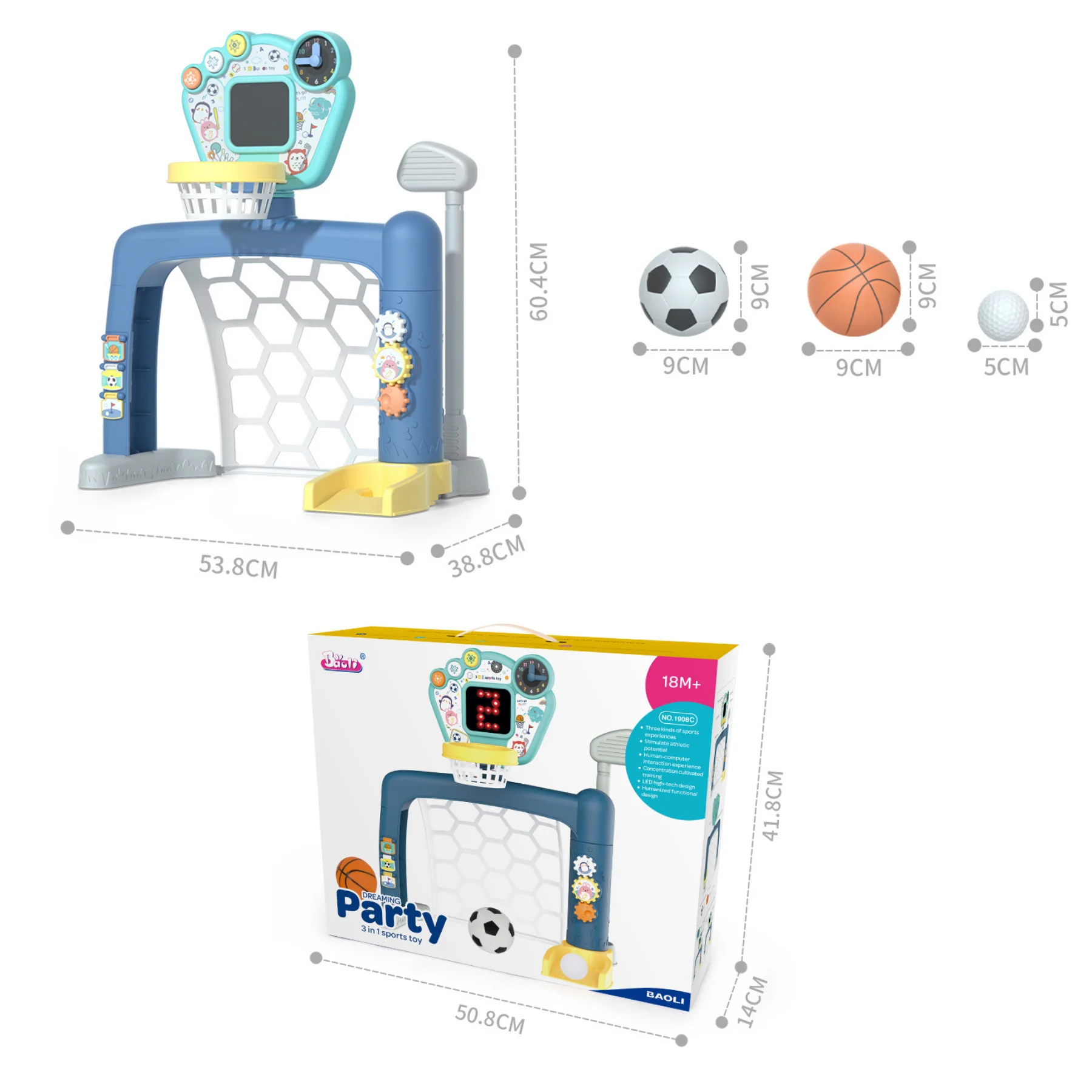 - 1 bóng rổ (9 cm), 1 bóng đá (9 cm), 1 bóng golf (5 cm)