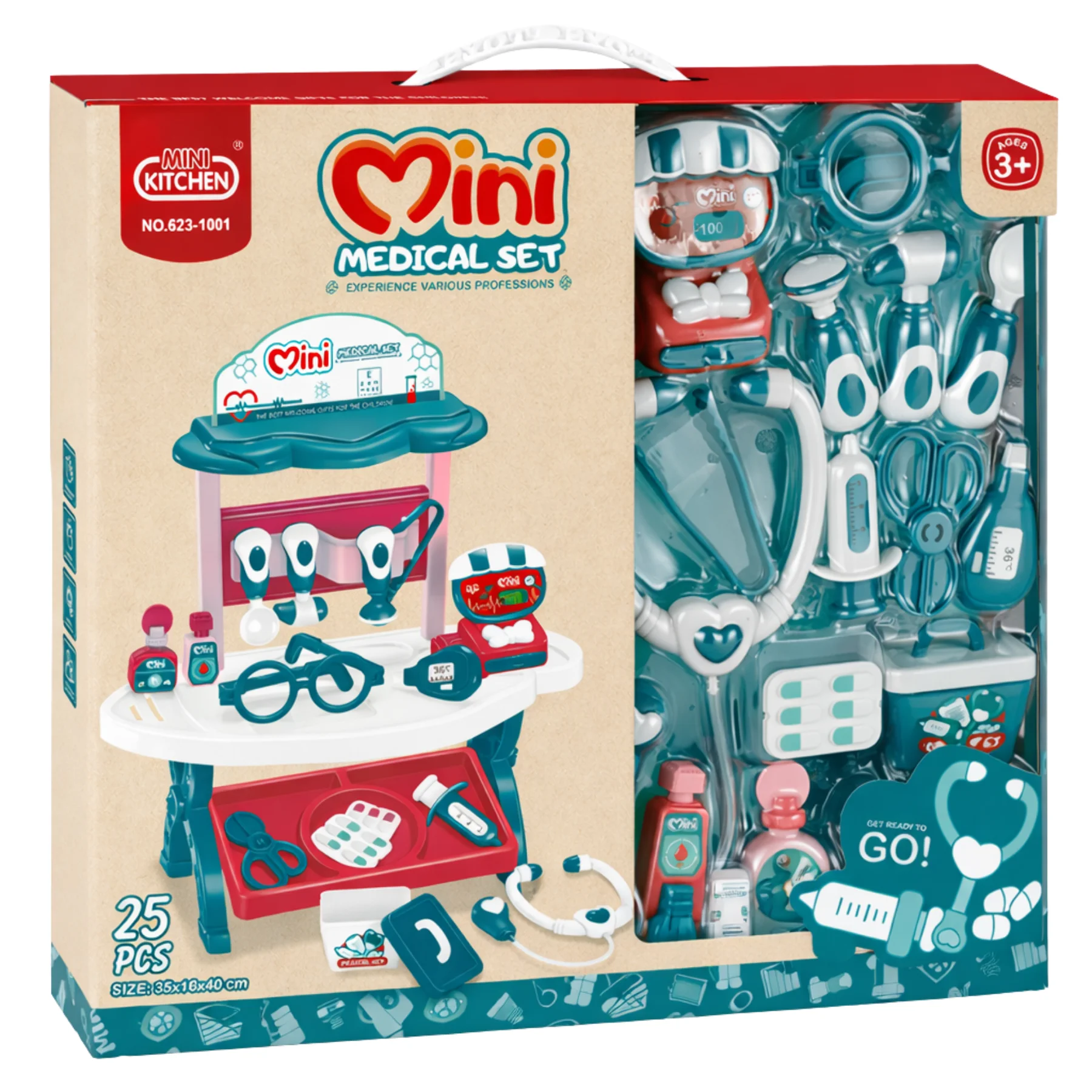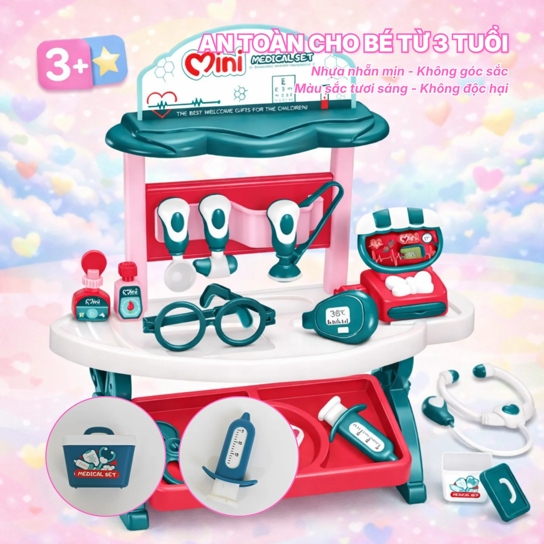Bộ dụng cụ bác sĩ đồ chơi Mini Medical Set 623-1001 mang thiết kế mô phỏng sinh động một quầy khám bệnh mini, với tông màu pastel xanh – hồng dịu mắt, hình dáng gọn gàng, phù hợp cho bé từ 3 tuổi trở lên trong các trò chơi nhập vai bác sĩ, y tá.