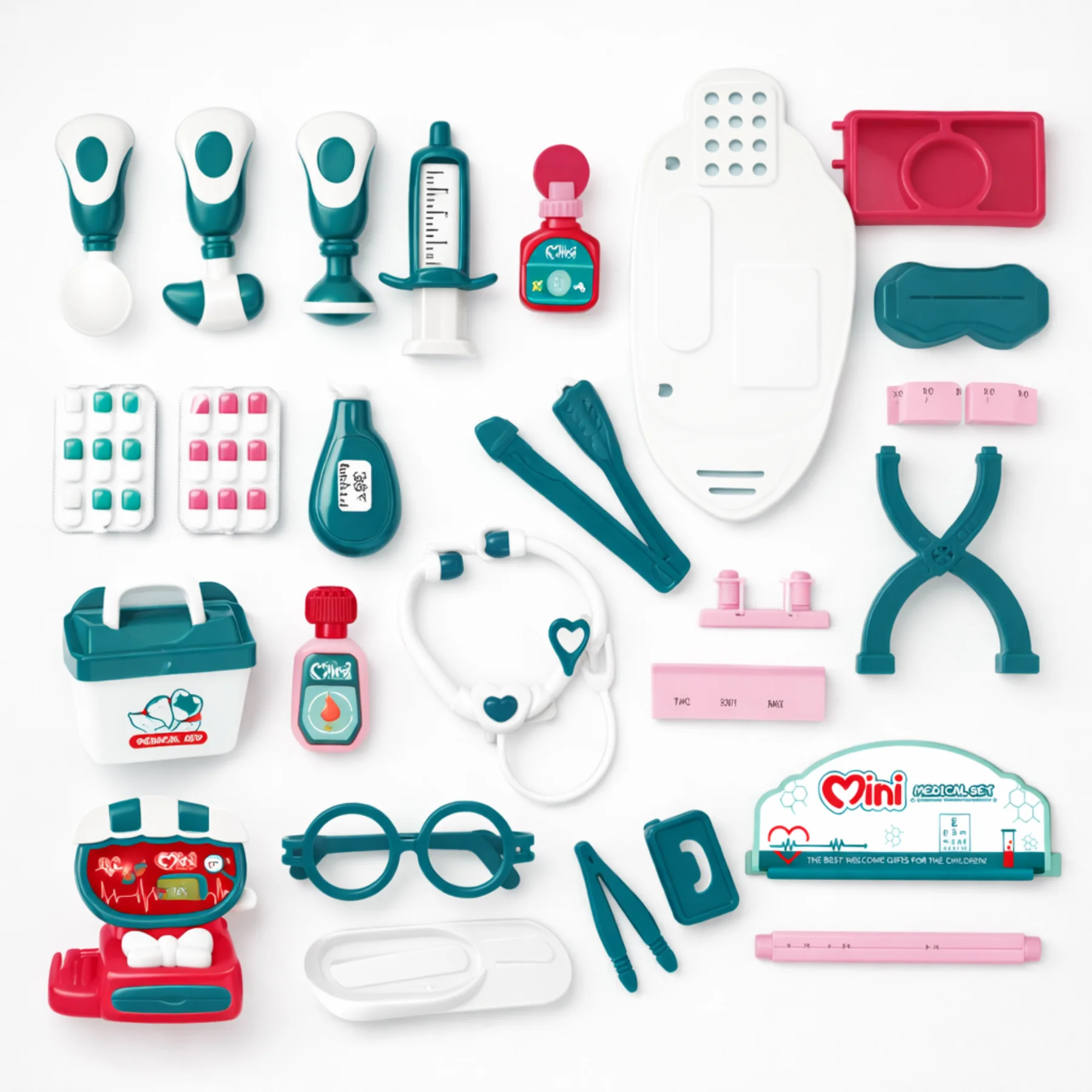Sản phẩm bao gồm đầy đủ các dụng cụ y tế quen thuộc như ống nghe, kim tiêm, nhiệt kế, kính bác sĩ, kéo, thuốc, khay đựng và nhiều phụ kiện khác, giúp bé dễ dàng hóa thân thành “bác sĩ nhí”, khám bệnh cho búp bê, thú bông hoặc người thân trong gia đình.