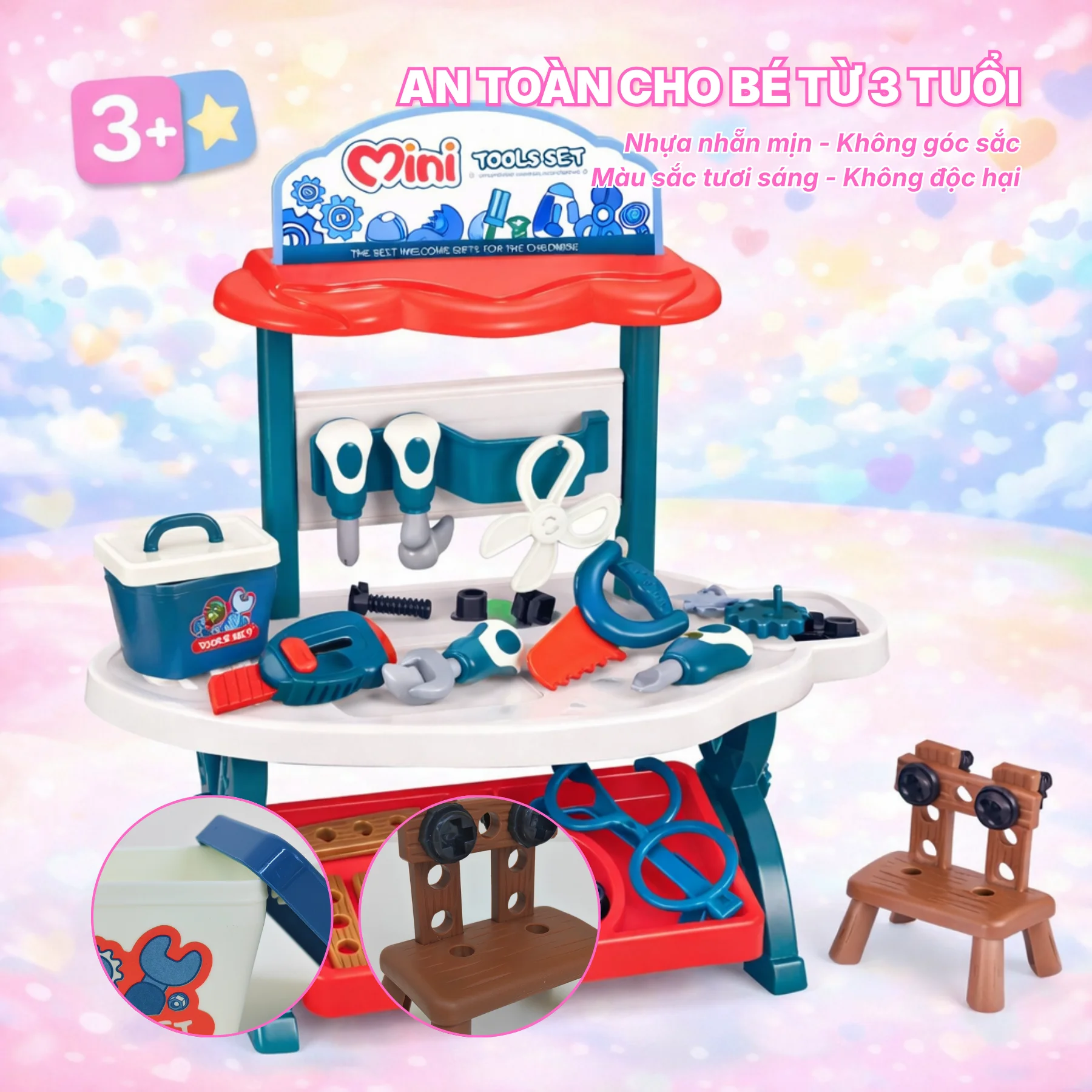 Bàn sửa chữa được thiết kế dạng đứng, có mặt bàn rộng để bé thao tác và khu vực treo dụng cụ phía trên giúp sắp xếp gọn gàng. Các chi tiết như tua vít, cờ lê, cưa, búa, ốc vít, bánh răng… đều được mô phỏng gần giống dụng cụ thật nhưng đã được làm bo tròn, an toàn cho tay bé khi chơi.
