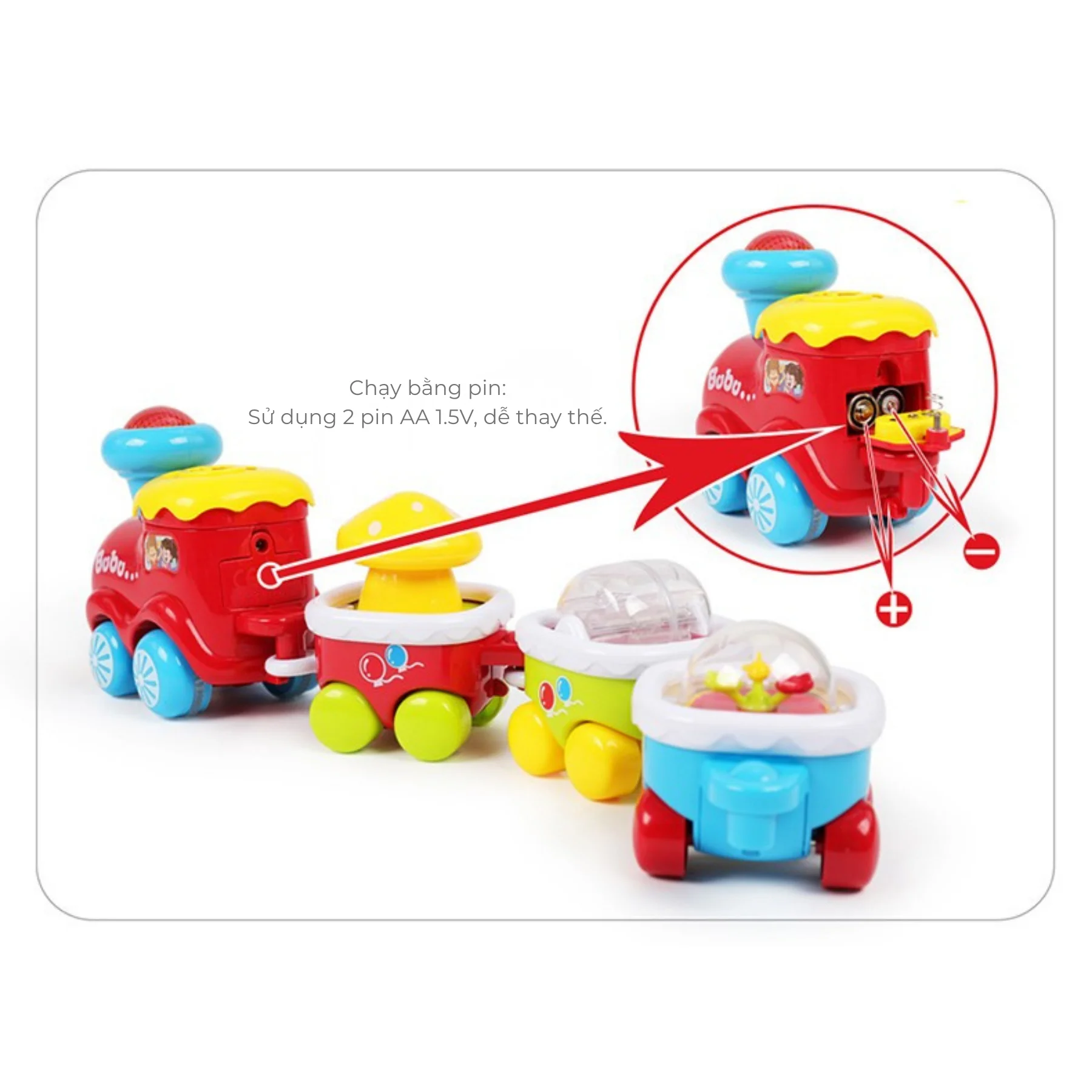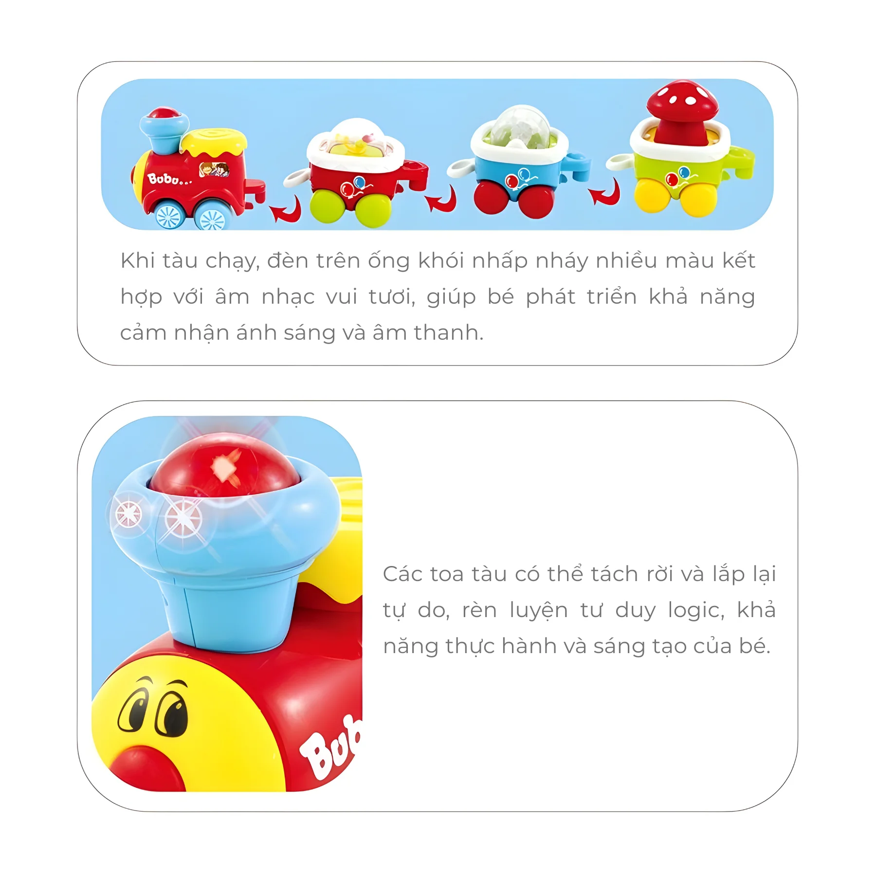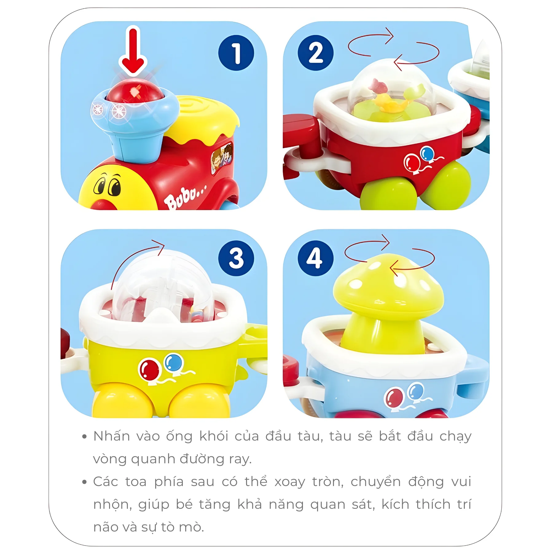 Mỗi toa có hiệu ứng vận động khác nhau: xoay nấm, xoay hạt, chuyển động vòng tròn… giúp bé thấy thú vị hơn khi chơi.
