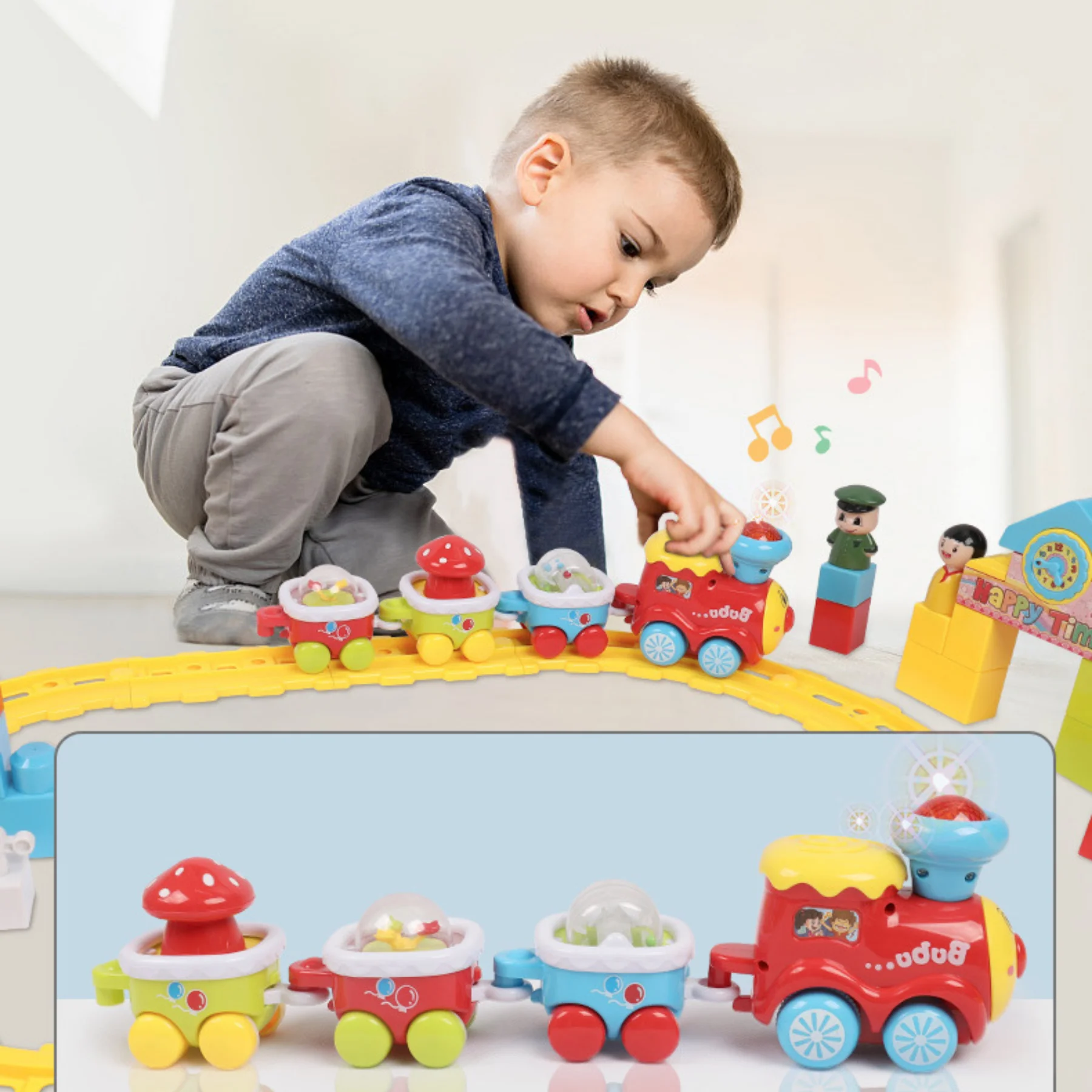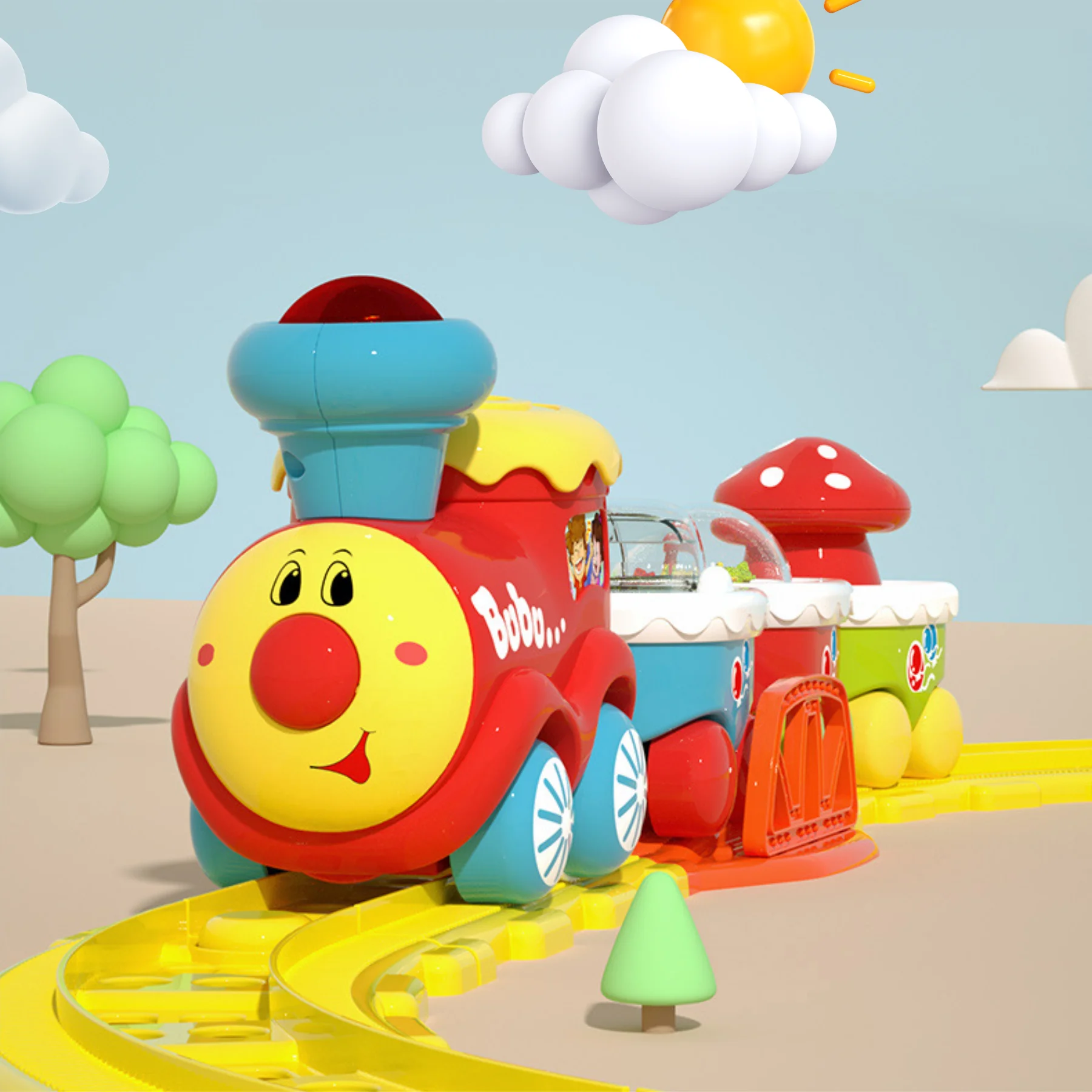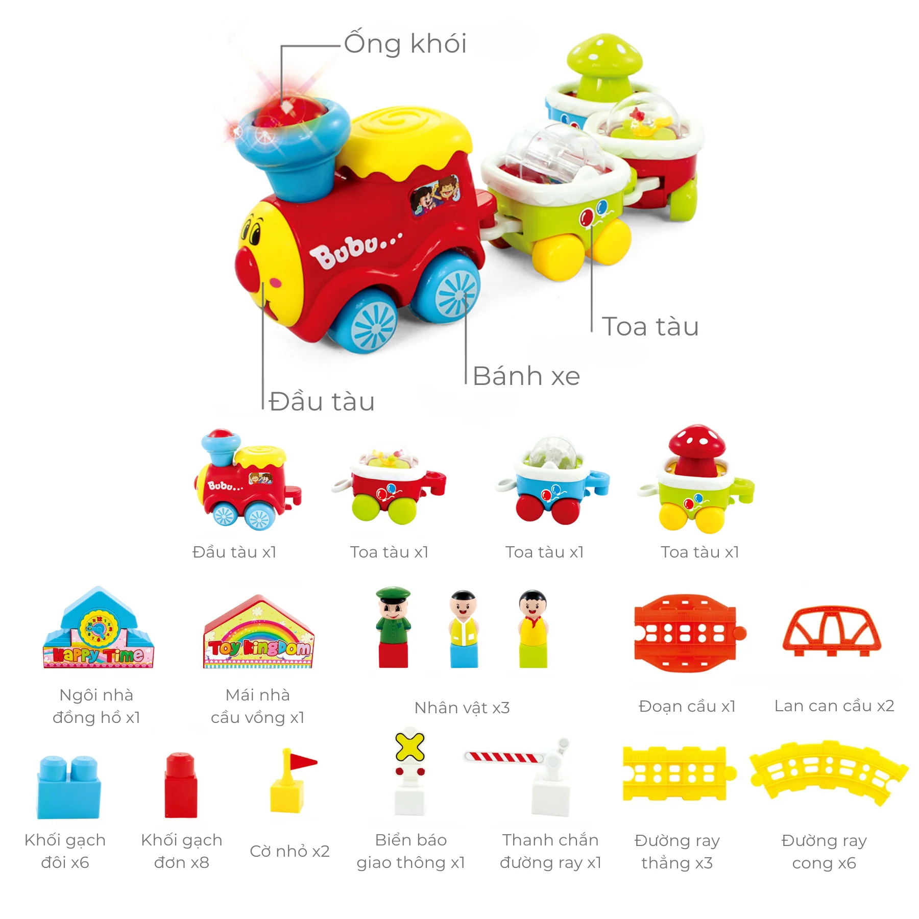 Mỗi toa có hiệu ứng vận động khác nhau: xoay nấm, xoay hạt, chuyển động vòng tròn… giúp bé thấy thú vị hơn khi chơi.