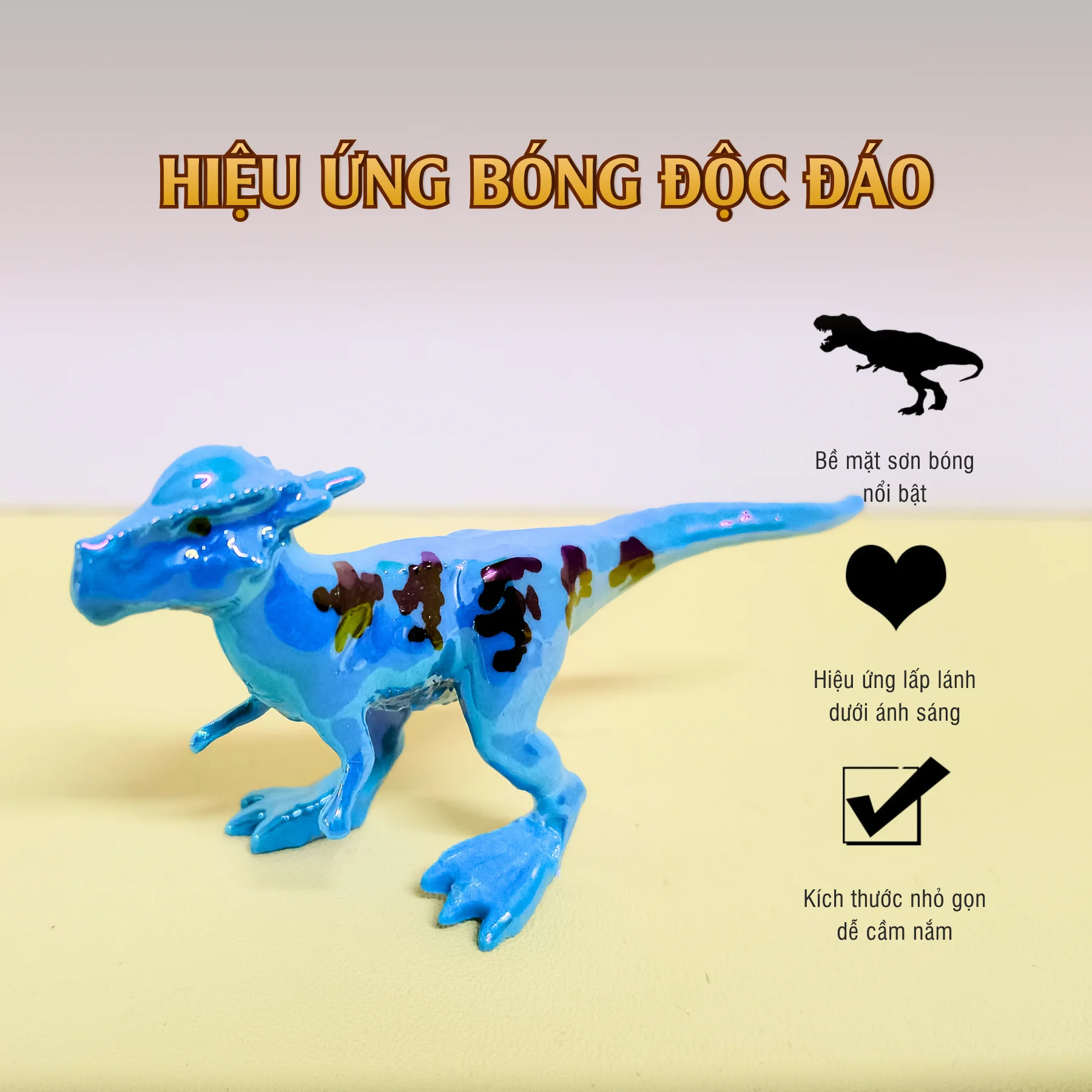 Mỗi gói sản phẩm gồm 1 mô hình khủng long mini với thiết kế chi tiết rõ nét và màu sắc sinh động. Bề mặt khủng long có hiệu ứng sơn bóng và lấp lánh dưới ánh sáng, tạo cảm giác đẹp mắt và thú vị khi chơi. Mô hình có kích thước nhỏ gọn vừa tay bé, dễ cầm nắm và mang theo.