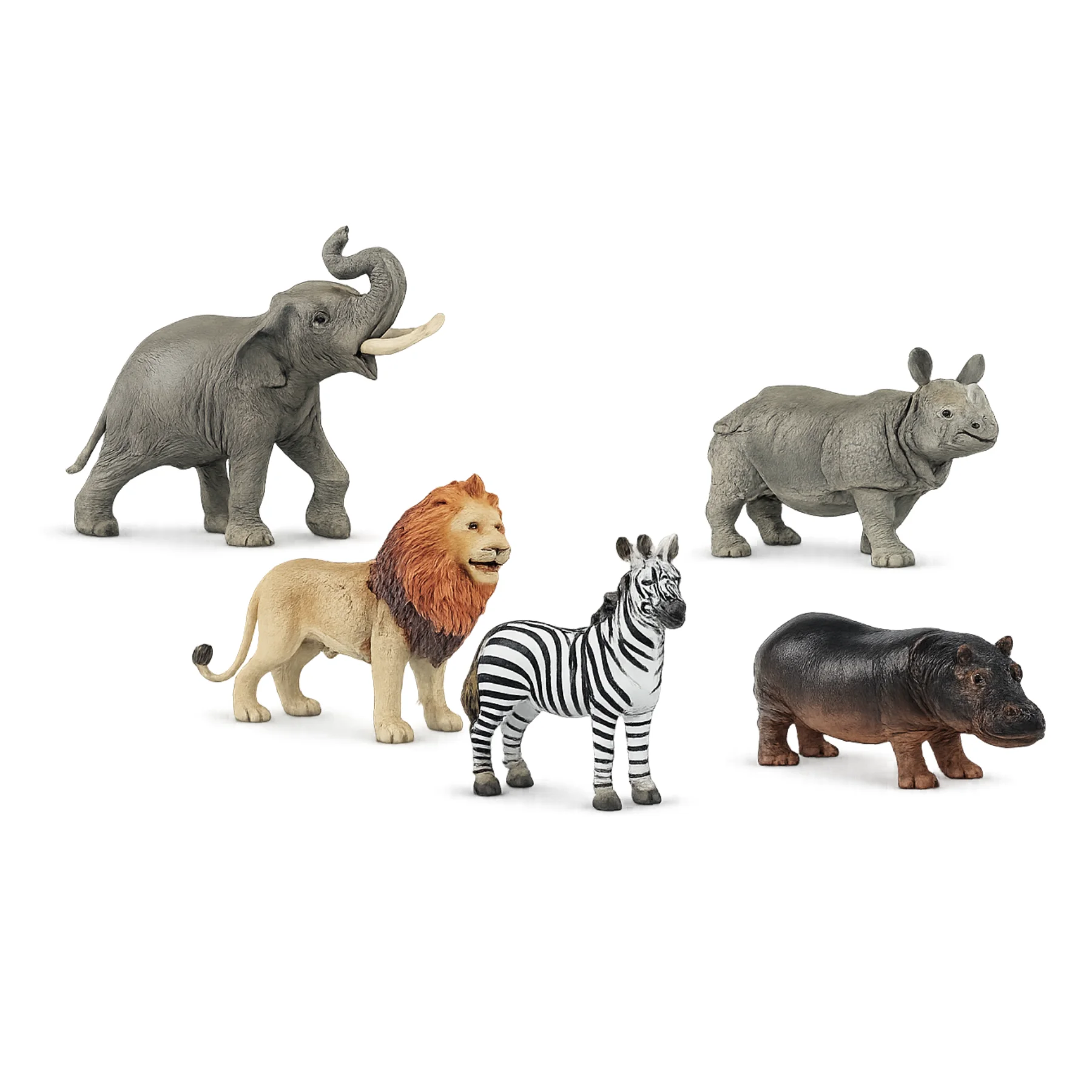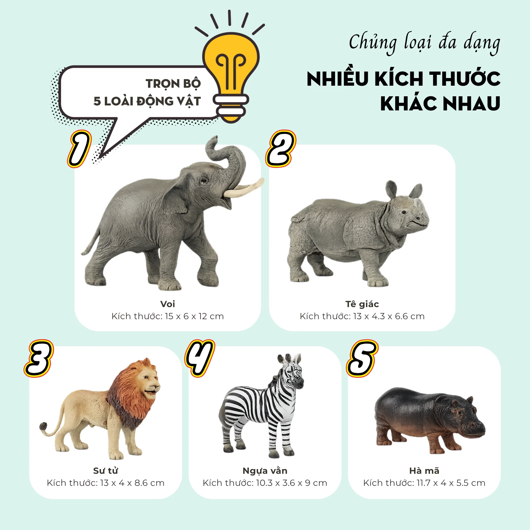 Bộ đồ chơi gồm 5 mô hình động vật hoang dã với kích thước và hình dáng khác nhau, mô phỏng chân thực các loài động vật nổi tiếng trong tự nhiên. Các mô hình có thể đứng vững, màu sắc tự nhiên, bề mặt chi tiết giúp bé dễ dàng nhận biết từng con vật.