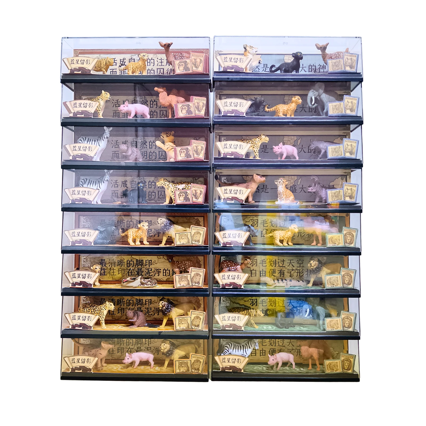 Mỗi hộp gồm 3 mô hình động vật rừng với thiết kế chi tiết và màu sắc nổi bật. Các con vật được mô phỏng theo nhiều loài động vật quen thuộc như hổ, báo, voi, ngựa vằn, lạc đà, hươu, sư tử và nhiều loài động vật hoang dã khác. Mô hình được đặt trong hộp trưng bày dạng sa bàn mini giúp bé có thể vừa chơi vừa trưng bày như một mô hình động vật thu nhỏ.