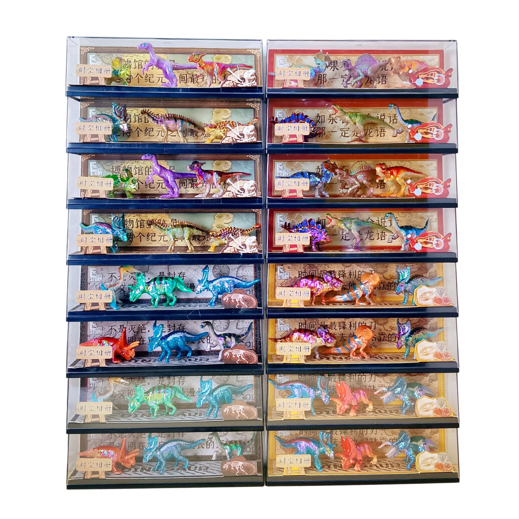 Mỗi hộp gồm 3 mô hình khủng long với thiết kế chi tiết, màu sắc ánh kim độc đáo và bề mặt bóng nổi bật. Các mô hình khủng long được mô phỏng theo nhiều loài khủng long nổi tiếng như T-Rex, Triceratops, Stegosaurus, Spinosaurus và nhiều loài khủng long khác.
