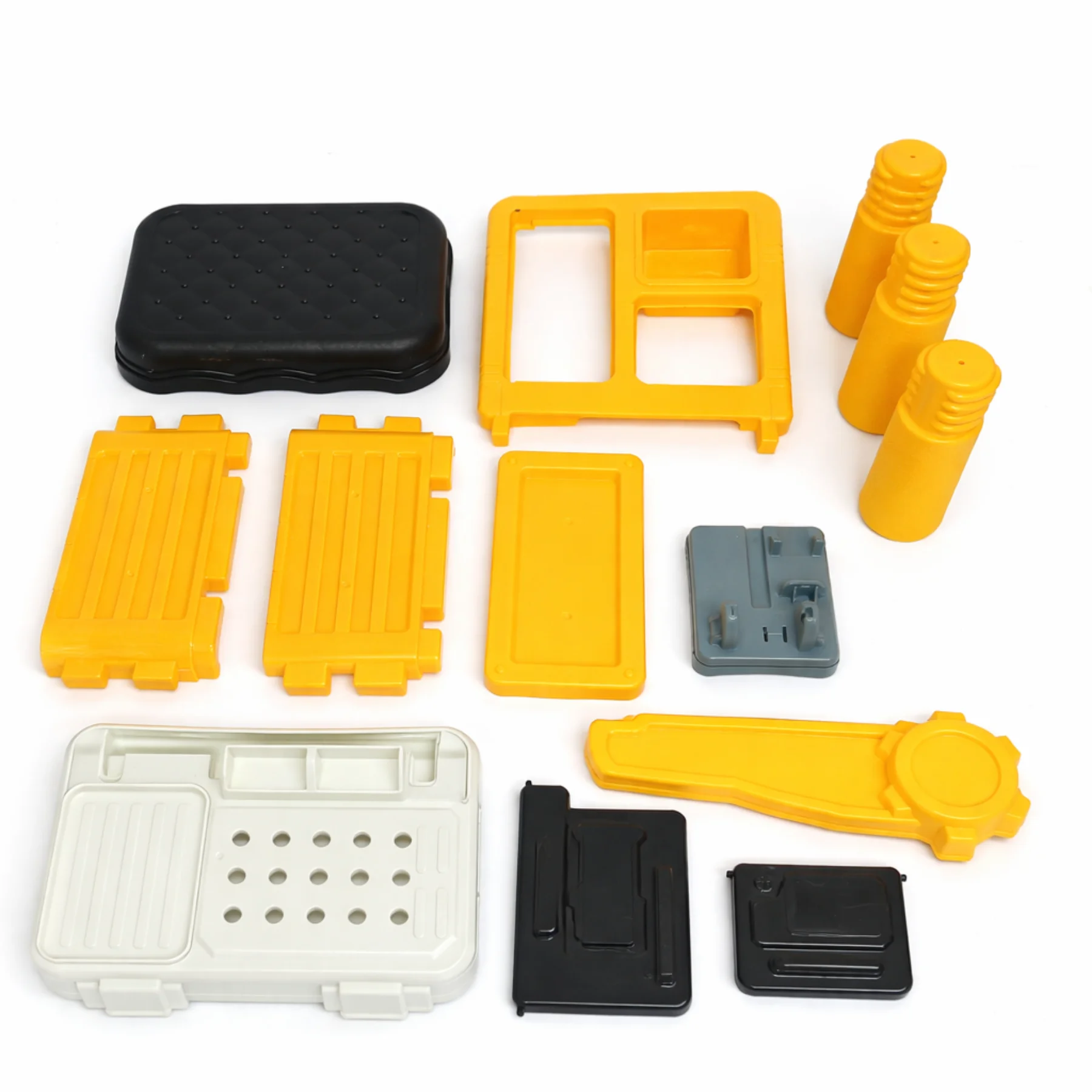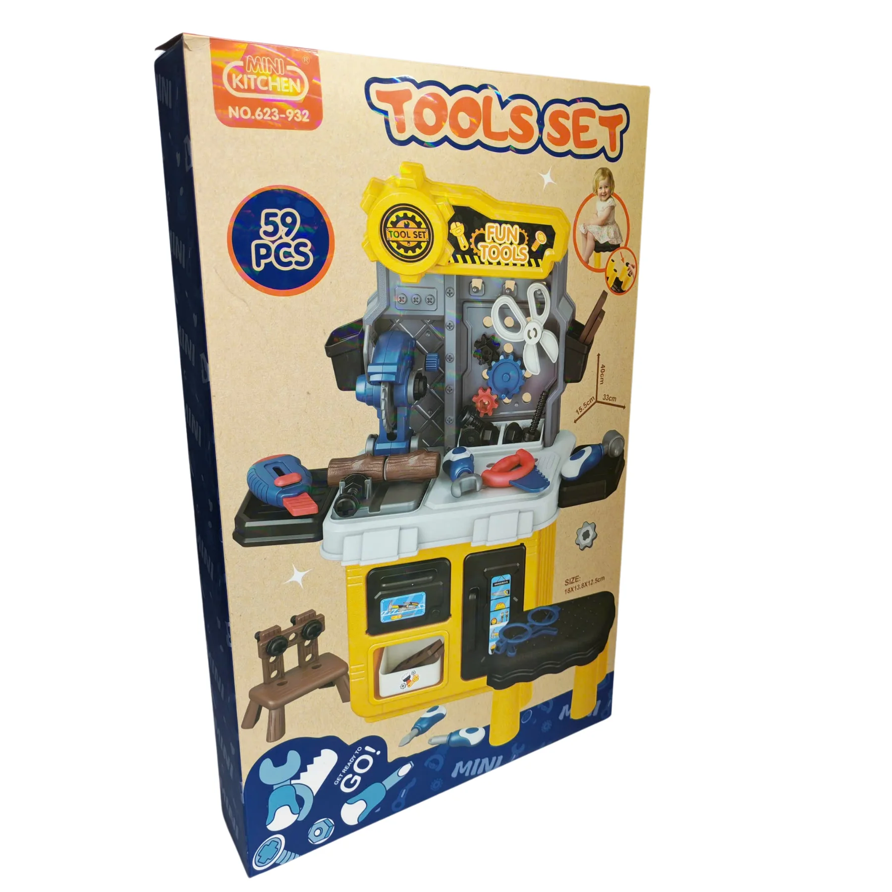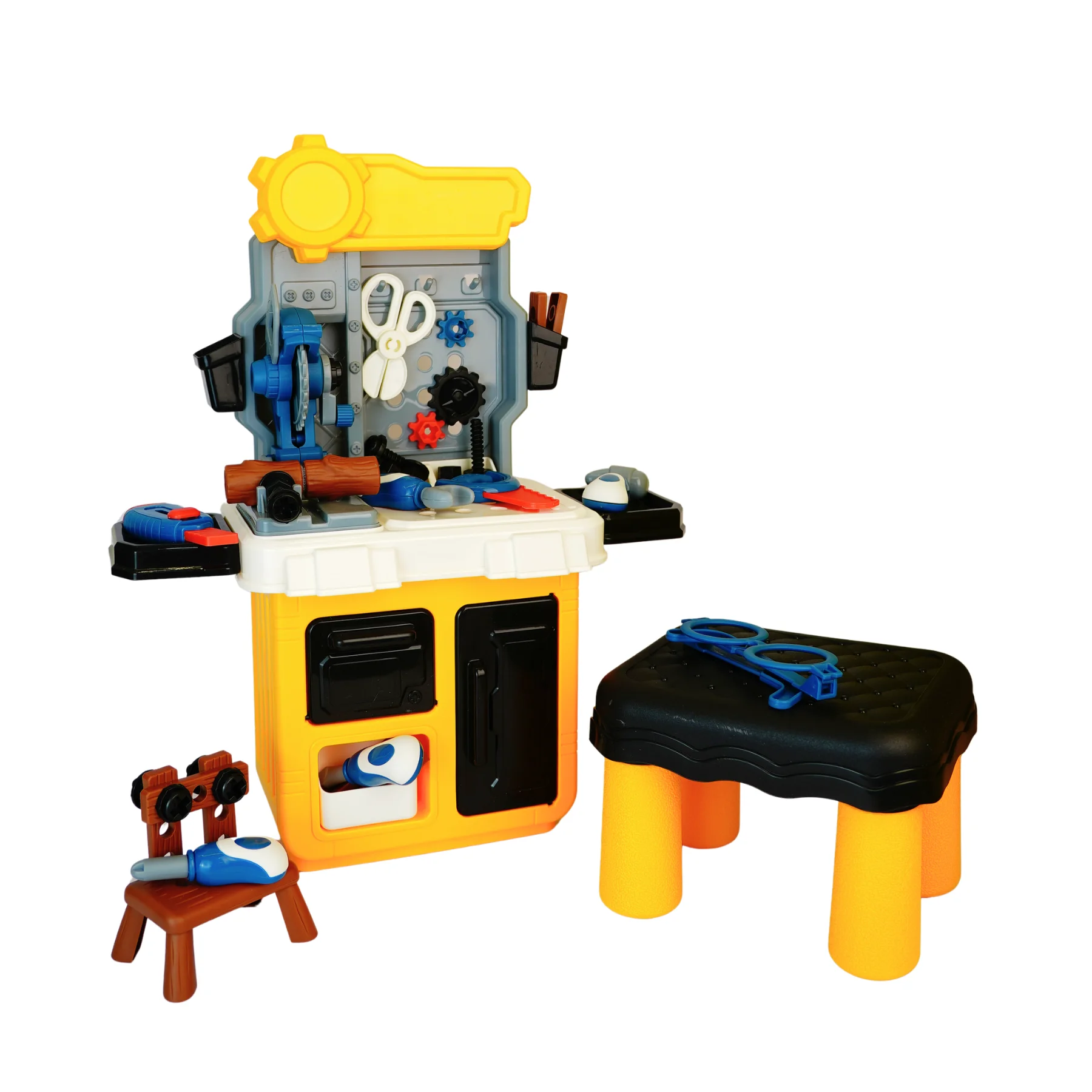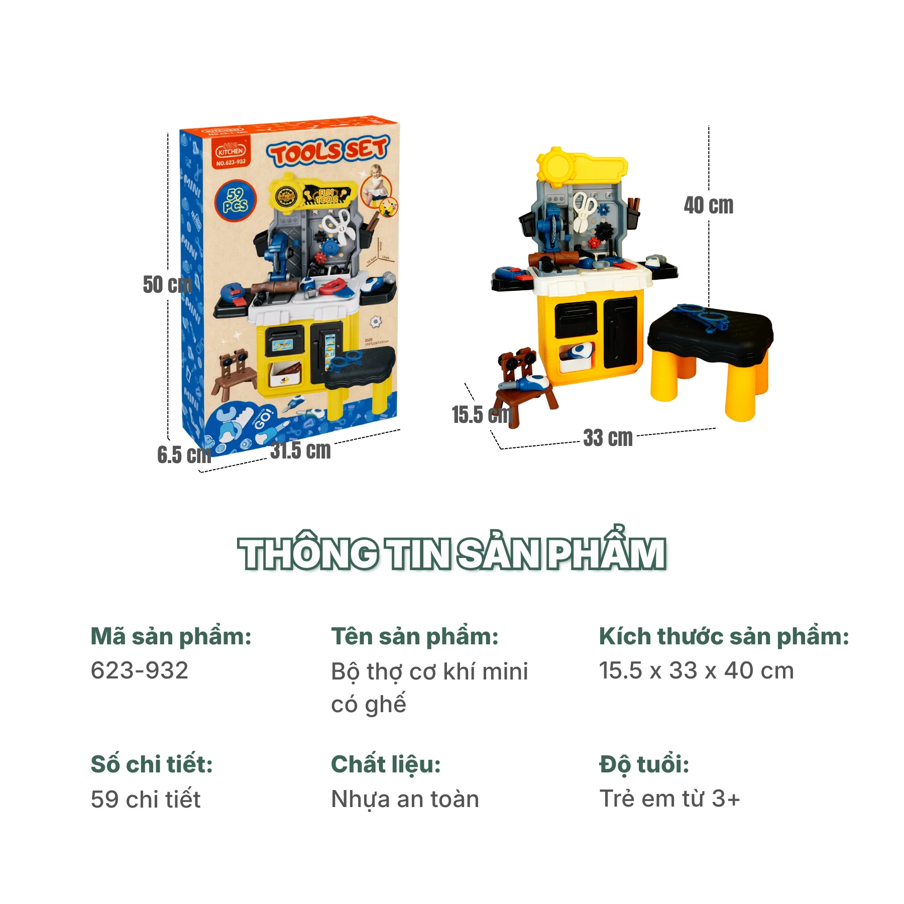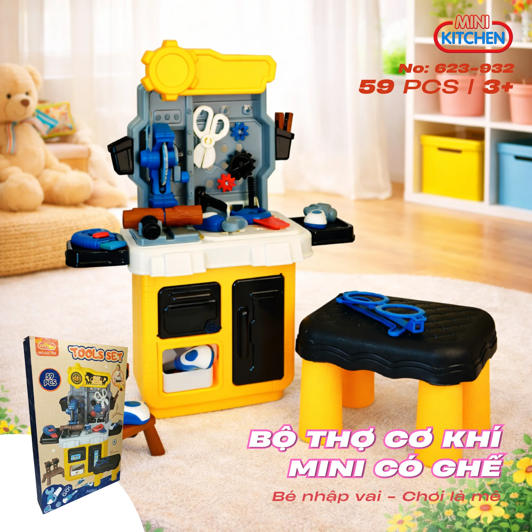 Bộ thợ cơ khí mini có ghế 623-932 được thiết kế mô phỏng một bàn sửa chữa thu nhỏ sinh động, với tông màu vàng – xám – xanh nổi bật, kiểu dáng chắc chắn, phù hợp cho bé từ 3 tuổi trở lên trong các trò chơi nhập vai nghề nghiệp.