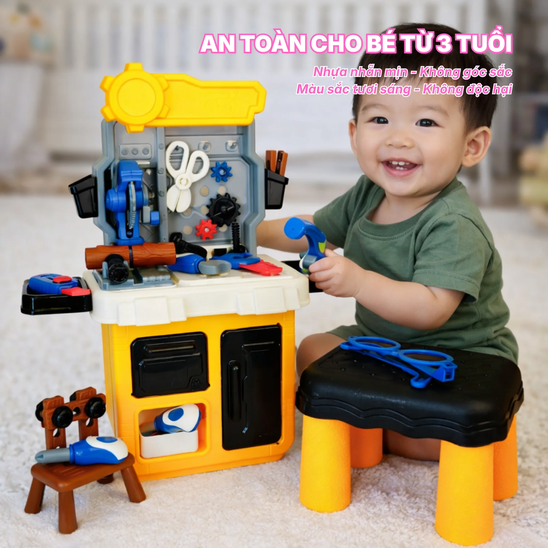 Sản phẩm gồm bàn thao tác cao vừa tầm bé, mặt bảng treo dụng cụ phía trên và ghế ngồi đi kèm, giúp bé thoải mái ngồi chơi trong thời gian dài. Các chi tiết như bánh răng, kìm, cờ lê, tua vít, ốc vít, máy khoan đồ chơi… được bố trí khoa học, cho bé trải nghiệm cảm giác “làm thợ cơ khí” như thật.