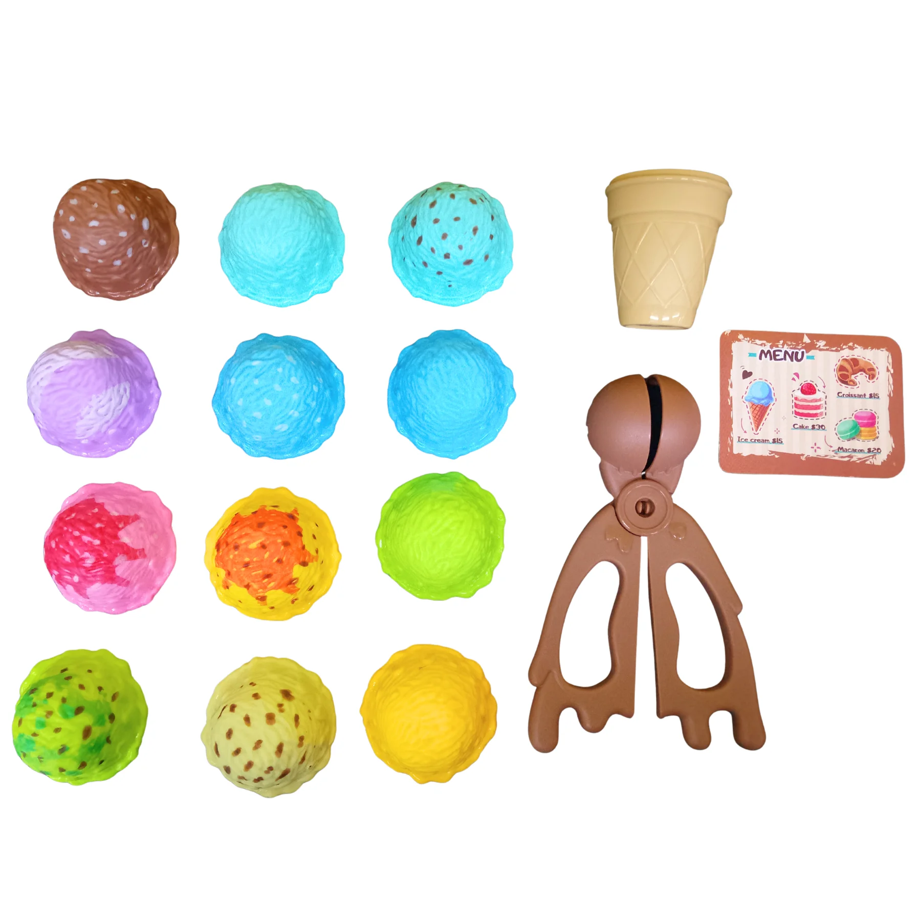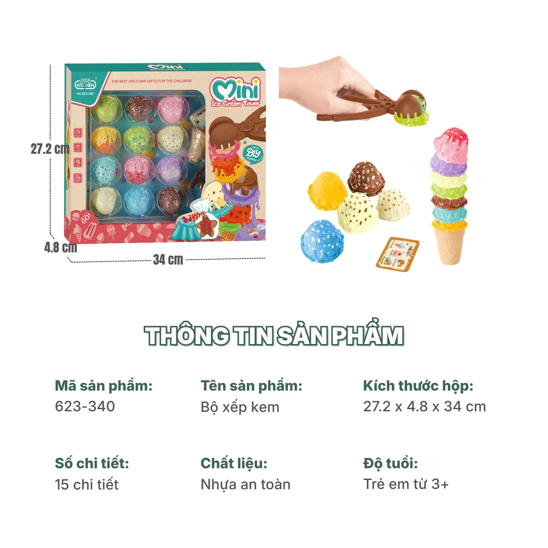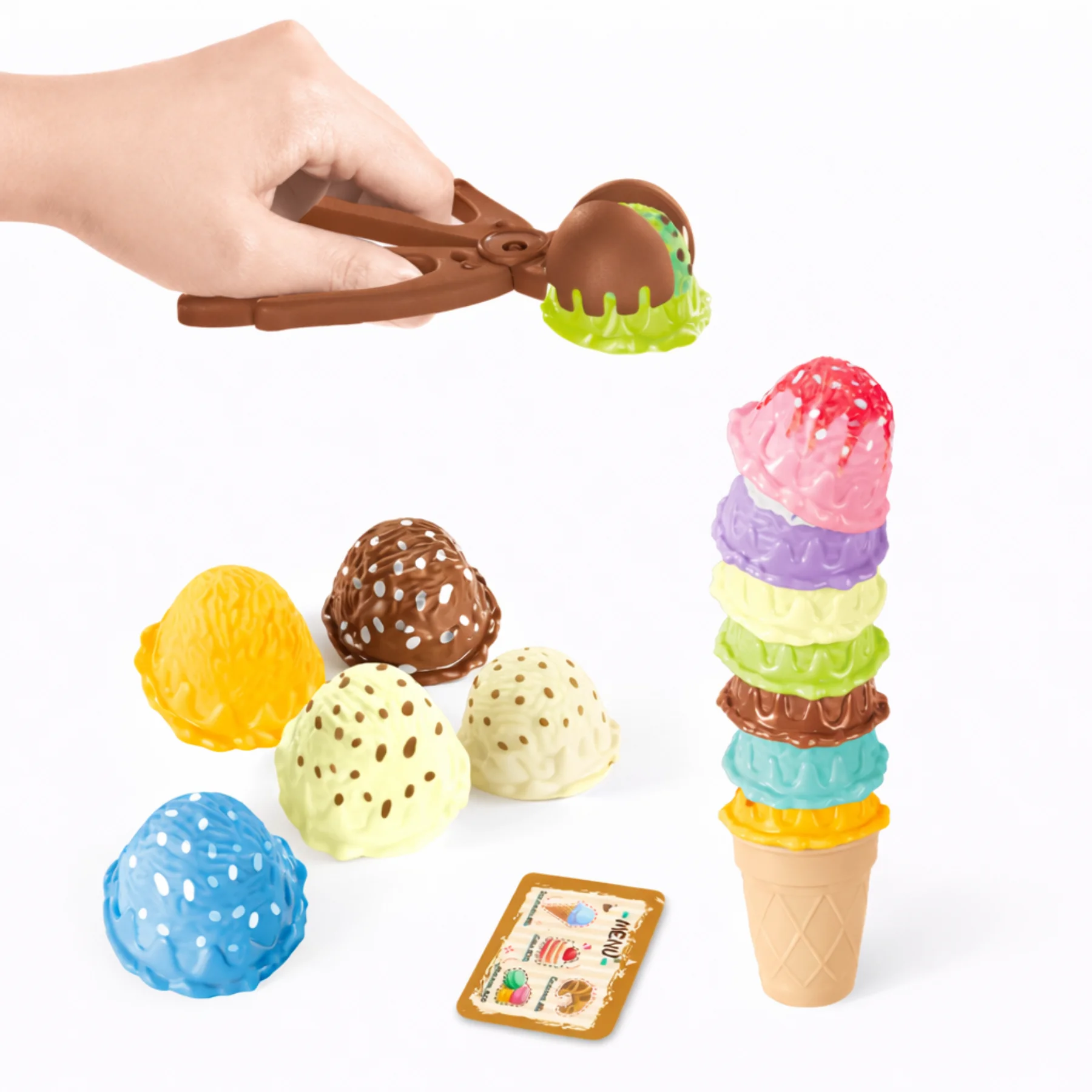 Sản phẩm gồm các viên kem tròn với màu sắc và họa tiết khác nhau, có thể xếp chồng lên nhau trên ốc quế, kết hợp cùng kẹp gắp kem giúp bé thao tác dễ dàng và cảm nhận như đang làm kem thật. Cách chơi đơn giản nhưng cuốn hút, kích thích bé thử nghiệm nhiều cách xếp khác nhau để tạo ra “cây kem” cao và đẹp mắt.