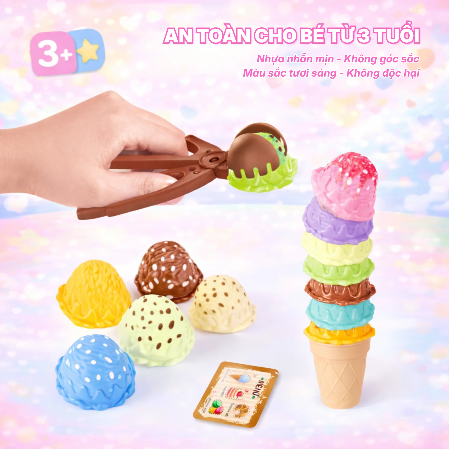 Các chi tiết trong bộ xếp kem được thiết kế vừa tay trẻ nhỏ, bề mặt nhẵn mịn, bo tròn an toàn, phù hợp cho bé từ 3 tuổi trở lên chơi hằng ngày tại nhà hoặc cùng bạn bè, anh chị em.