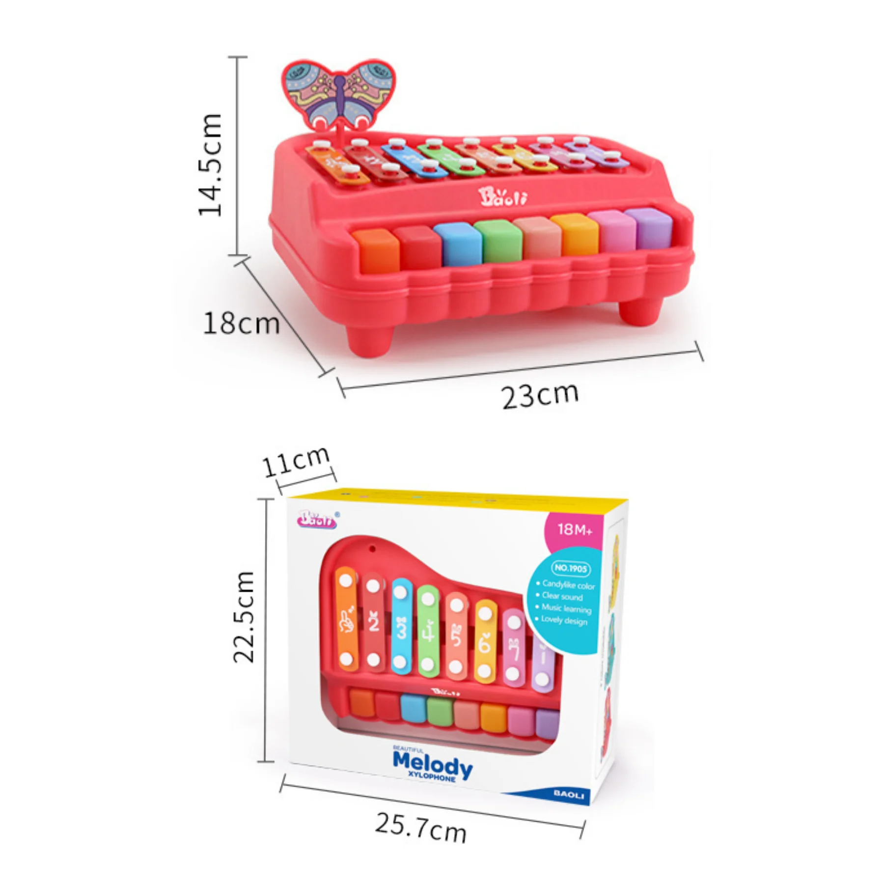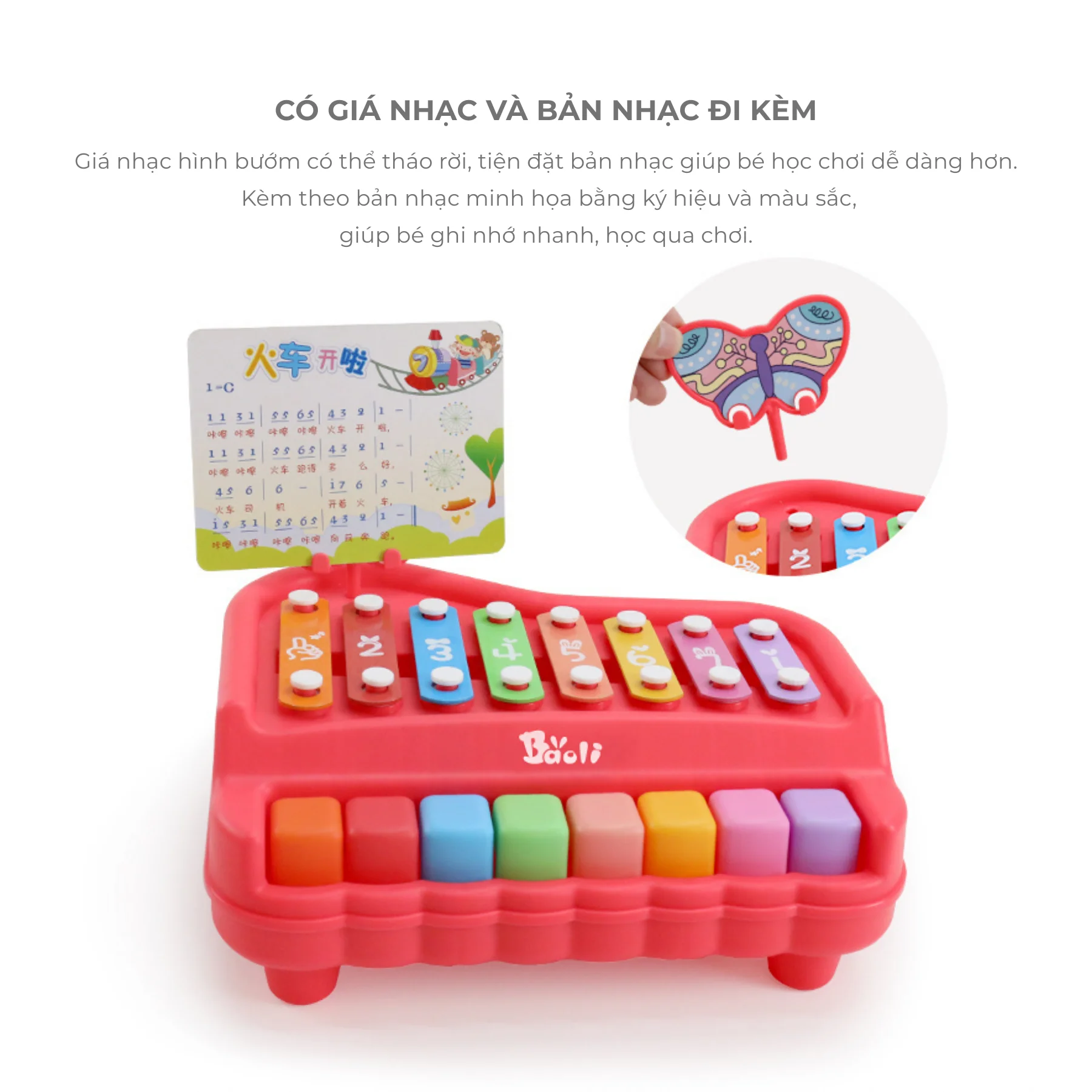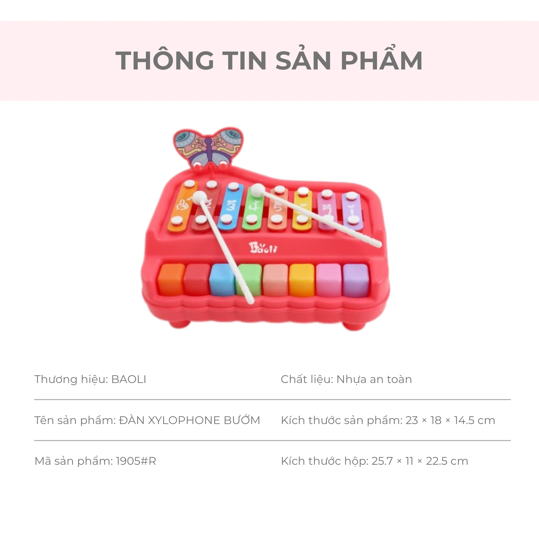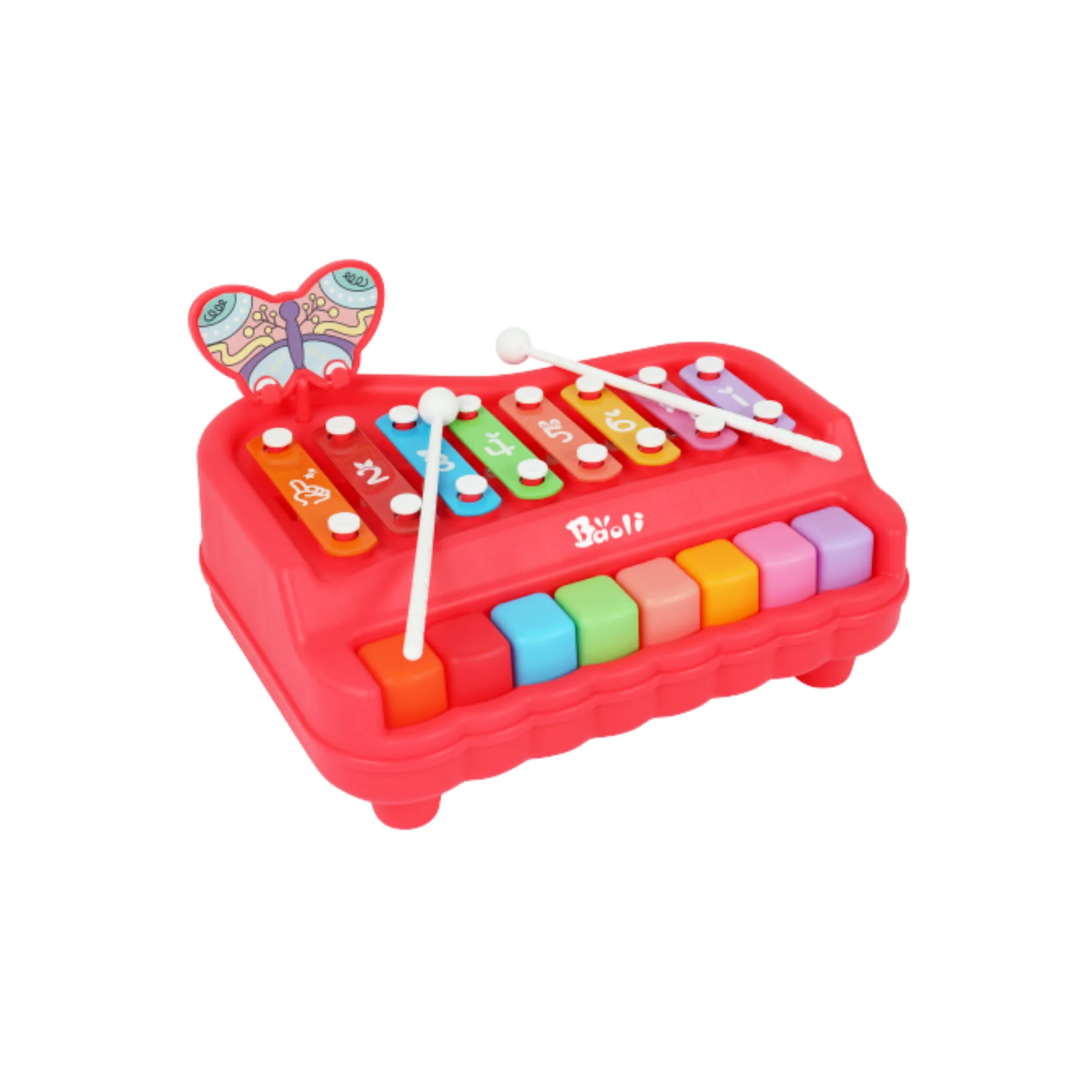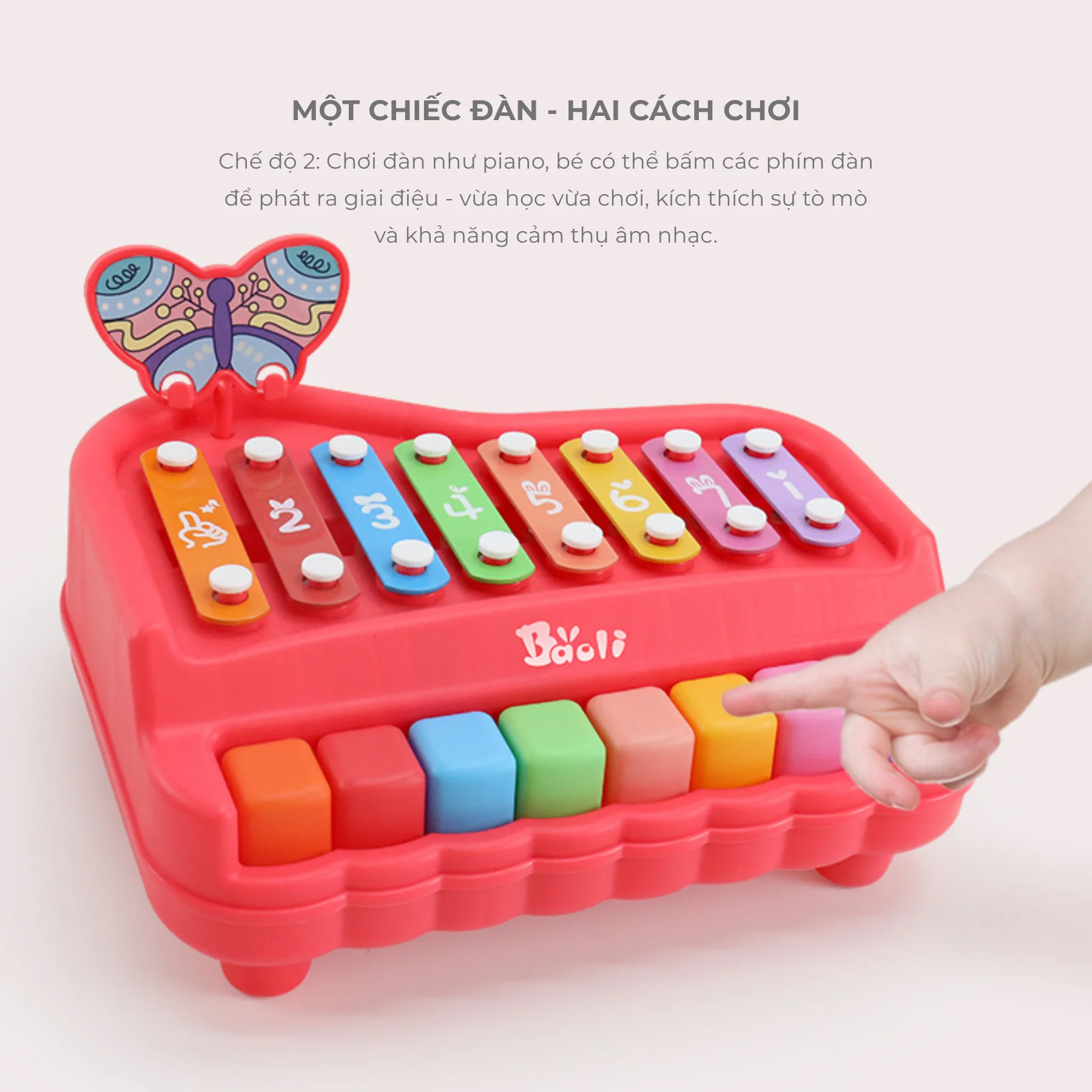 Đồ chơi đàn xylophone piano 8 âm BUTTERFLY BAOLI màu đỏ 1905#R là món đồ chơi âm nhạc phát triển toàn diện dành cho bé từ 18 tháng tuổi. Thiết kế mô phỏng đàn piano mini kết hợp xylophone với 8 phím âm cơ bản do – re – mi – fa – so – la – si – do, giúp bé làm quen âm nhạc và rèn cảm âm ngay từ nhỏ. Kiểu dáng hình bướm dễ thương, bảng nhạc tháo rời, màu sắc rực rỡ – tất cả tạo nên cảm hứng vui tươi trong từng giai điệu đầu đời của bé.
