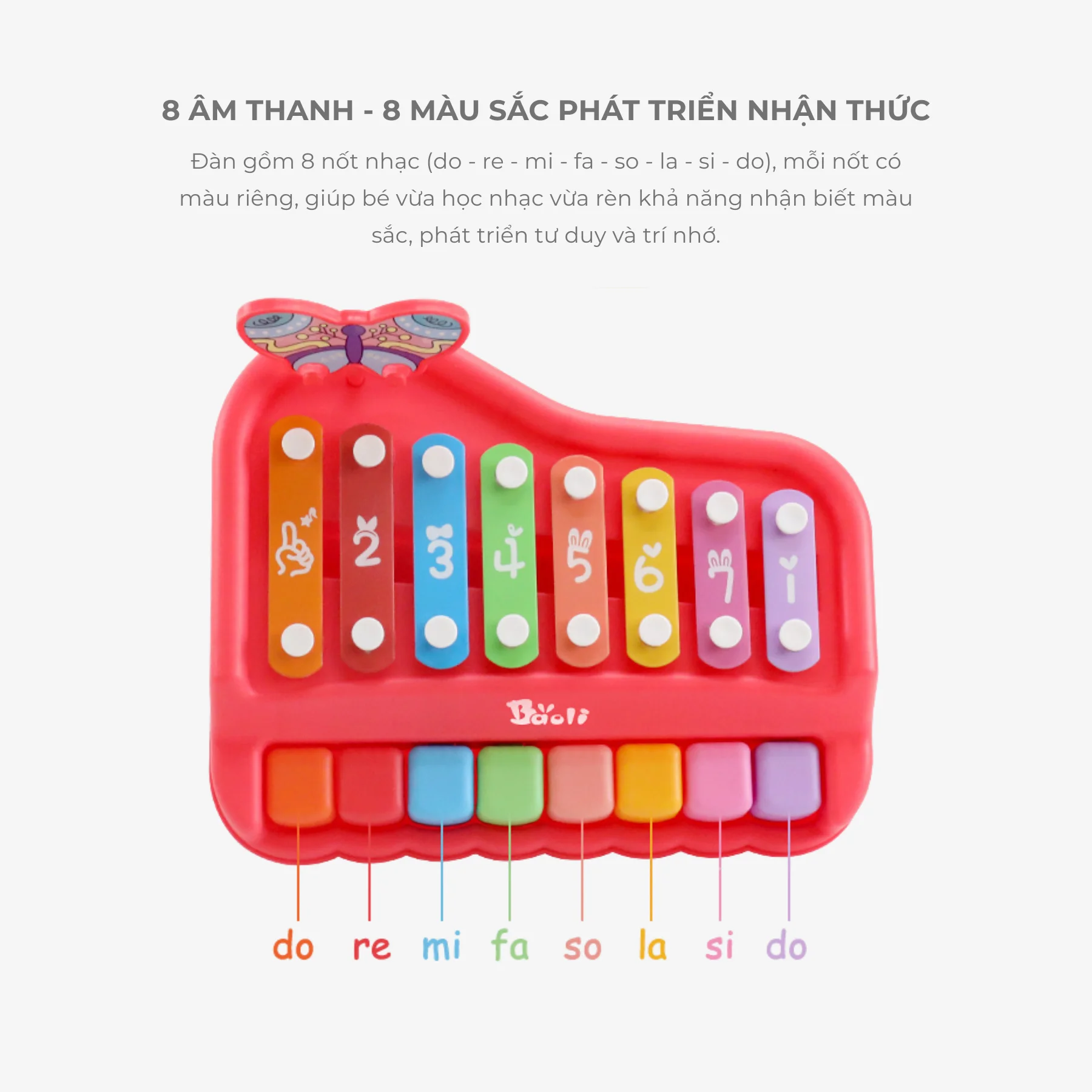 - 8 phím đàn với màu sắc riêng biệt, giúp bé học nốt nhạc qua màu.