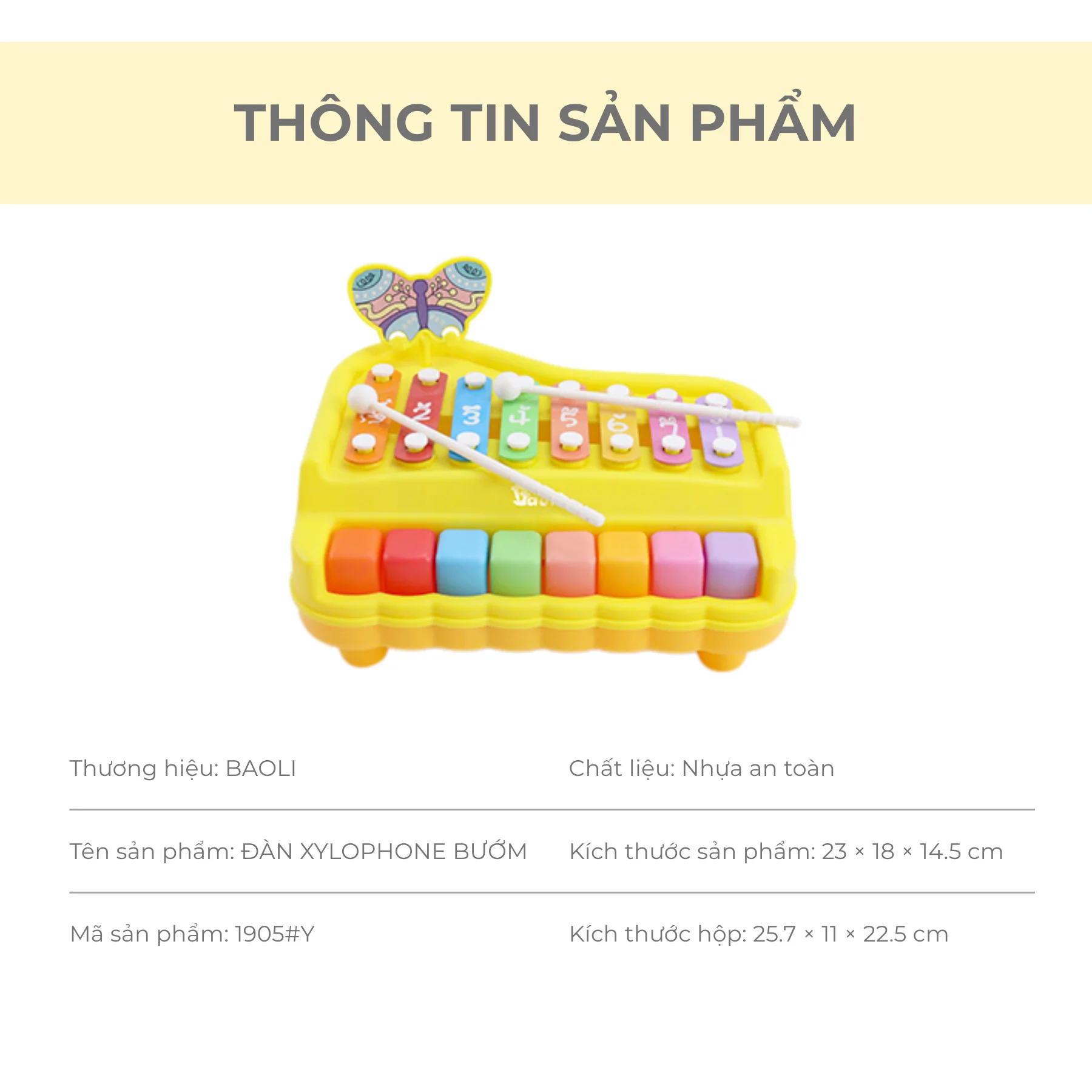 Đồ chơi đàn xylophone piano 8 âm BUTTERFLY BAOLI màu vàng 1905#Y là món đồ chơi âm nhạc phát triển toàn diện dành cho bé từ 18 tháng tuổi. Thiết kế mô phỏng đàn piano mini kết hợp xylophone với 8 phím âm cơ bản do – re – mi – fa – so – la – si – do, giúp bé làm quen âm nhạc và rèn cảm âm ngay từ nhỏ. Kiểu dáng hình bướm dễ thương, bảng nhạc tháo rời, màu sắc rực rỡ – tất cả tạo nên cảm hứng vui tươi trong từng giai điệu đầu đời của bé.