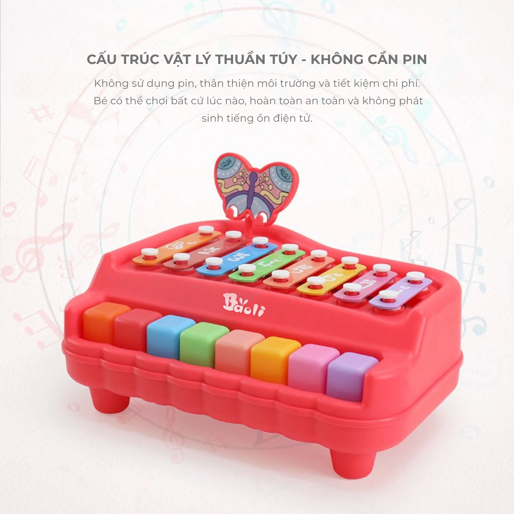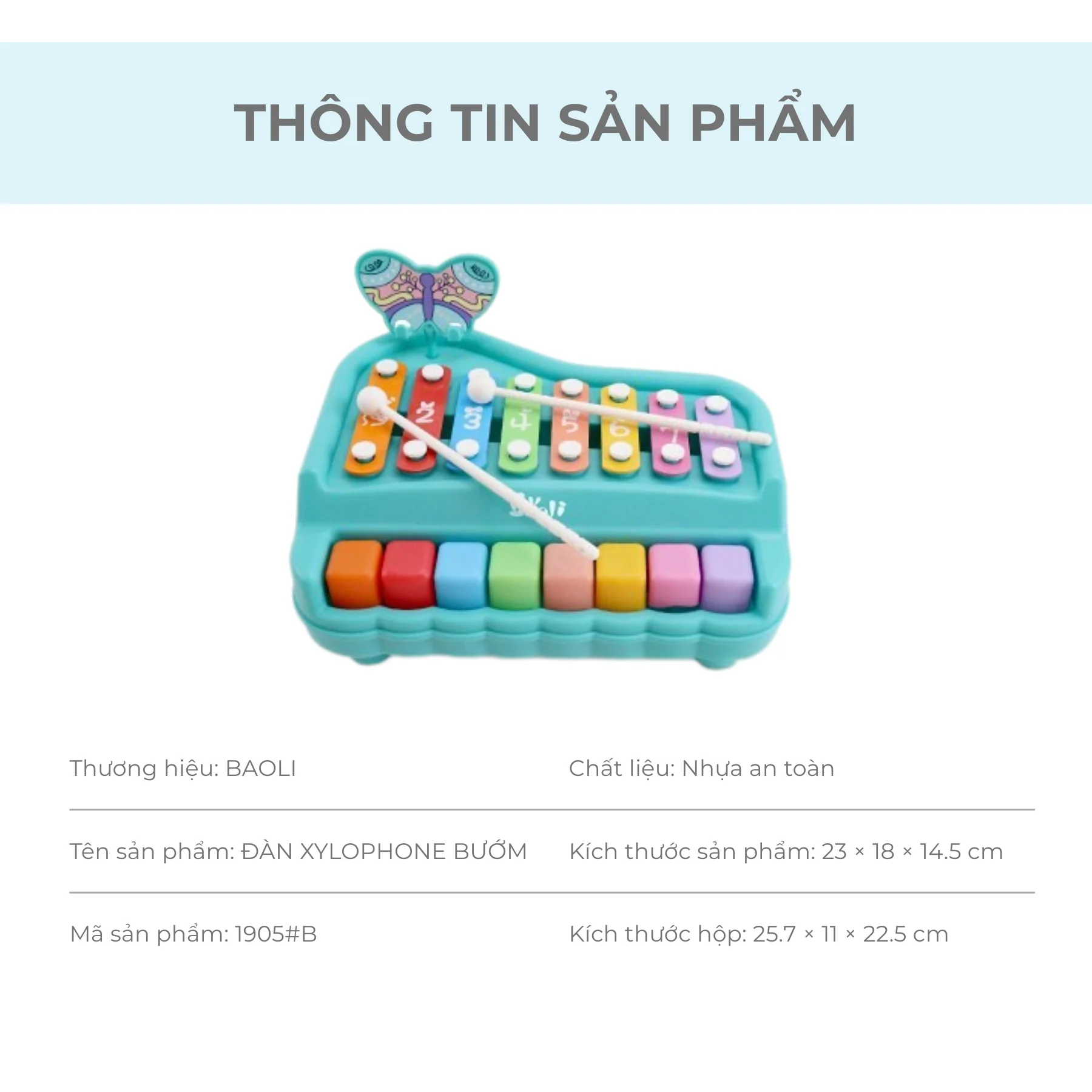 Đồ chơi đàn xylophone piano 8 âm BUTTERFLY BAOLI màu xanh 1905#B là món đồ chơi âm nhạc phát triển toàn diện dành cho bé từ 18 tháng tuổi. Thiết kế mô phỏng đàn piano mini kết hợp xylophone với 8 phím âm cơ bản do – re – mi – fa – so – la – si – do, giúp bé làm quen âm nhạc và rèn cảm âm ngay từ nhỏ. Kiểu dáng hình bướm dễ thương, bảng nhạc tháo rời, màu sắc rực rỡ – tất cả tạo nên cảm hứng vui tươi trong từng giai điệu đầu đời của bé.