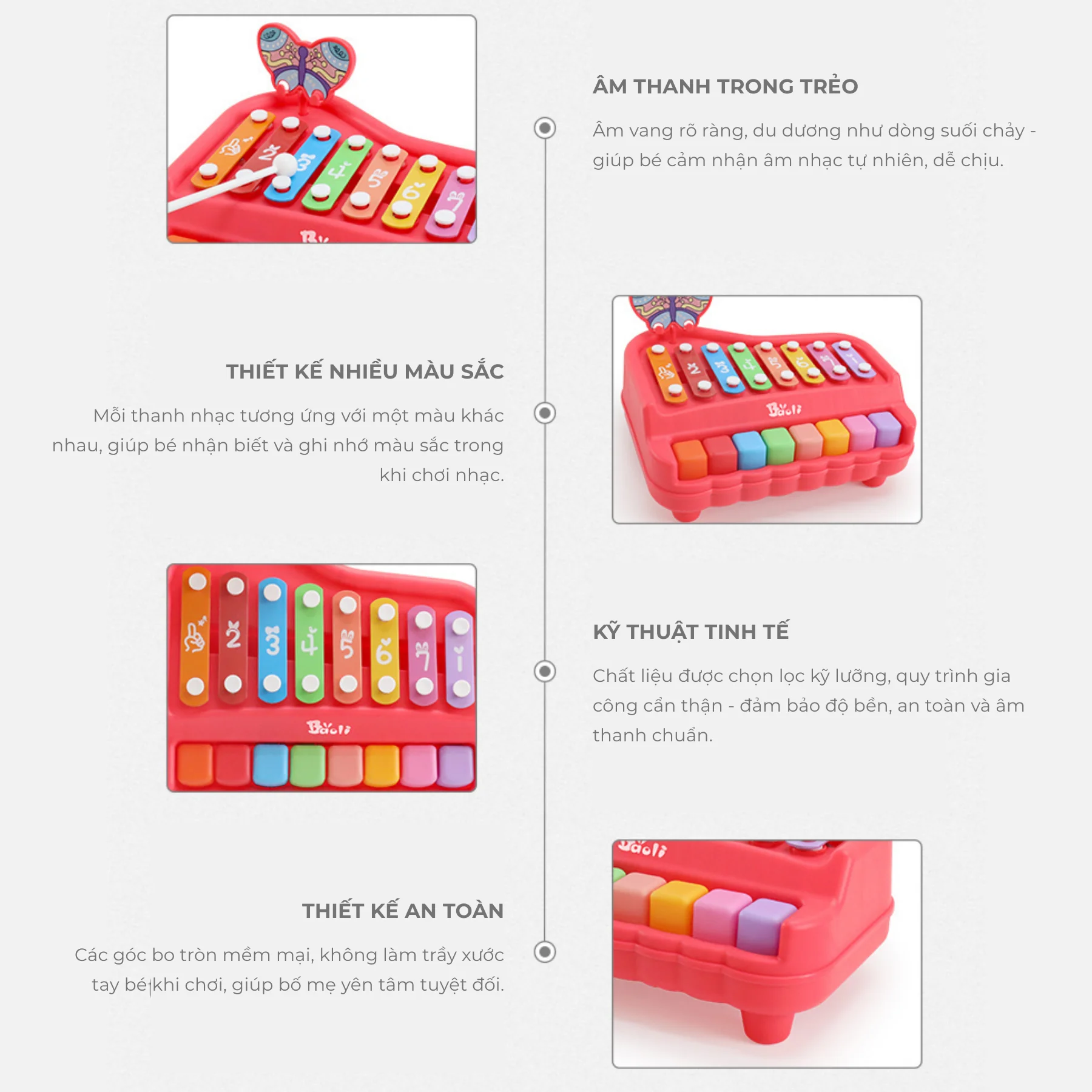 Đàn 2 trong 1, vừa gõ vừa bấm, giúp bé làm quen âm nhạc một cách tự nhiên.