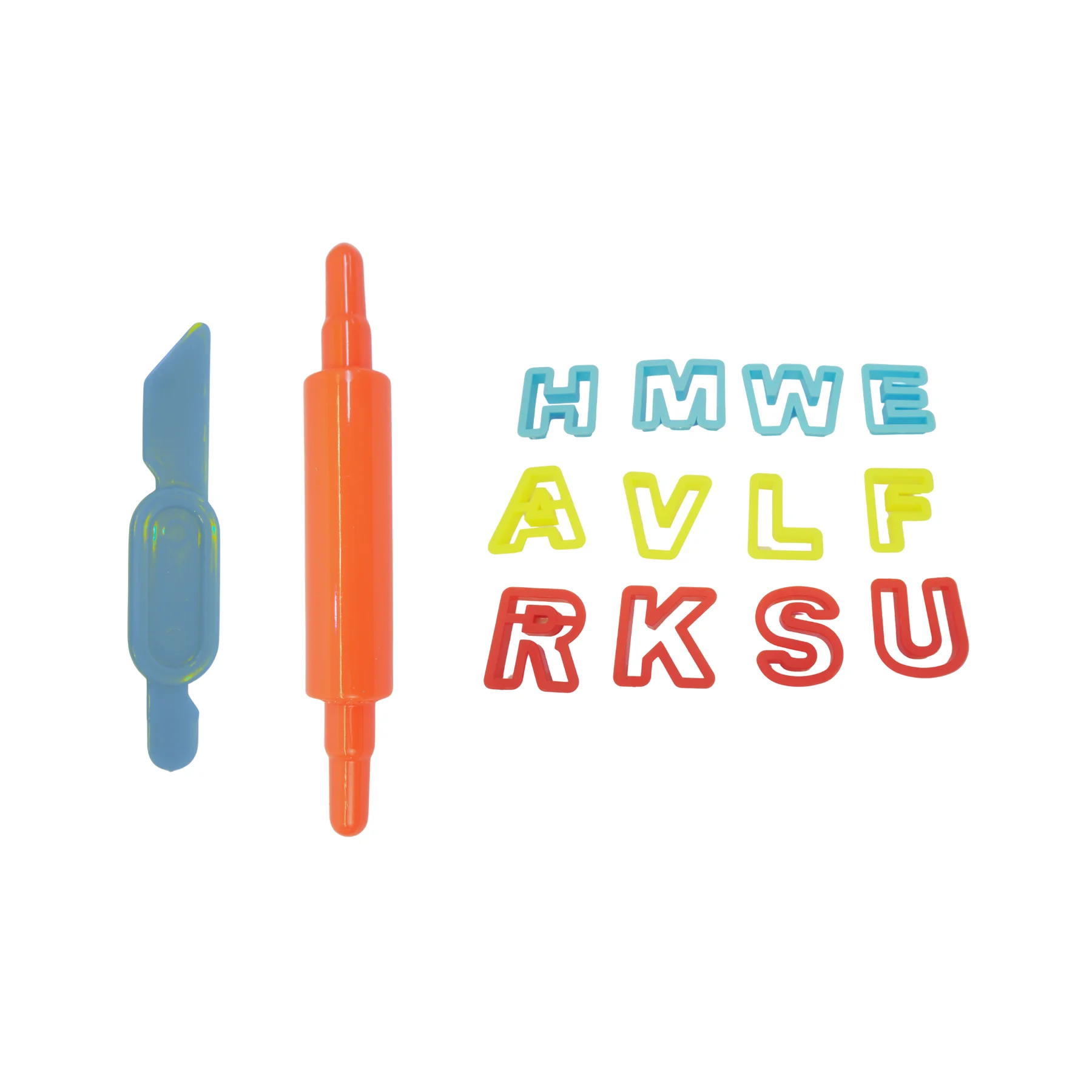 Ngoài khuôn chữ cái, bộ sản phẩm còn đi kèm con lăn và dụng cụ tạo hình giúp bé có thể cán đất nặn, cắt hoặc tạo nhiều hình dạng khác nhau. Hoạt động này giúp bé vừa học vừa chơi một cách sinh động và đầy hứng thú.