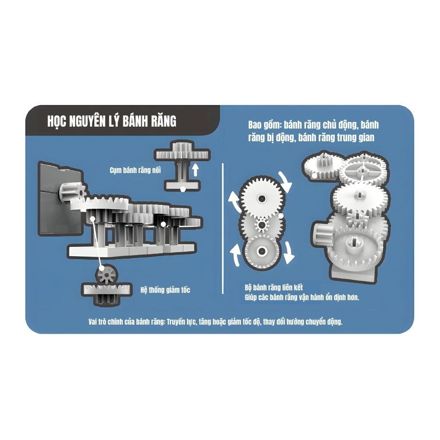 Học về thay đổi tốc độ và hướng chuyển động thông qua cơ chế bánh chủ động, bị động và trung gian.