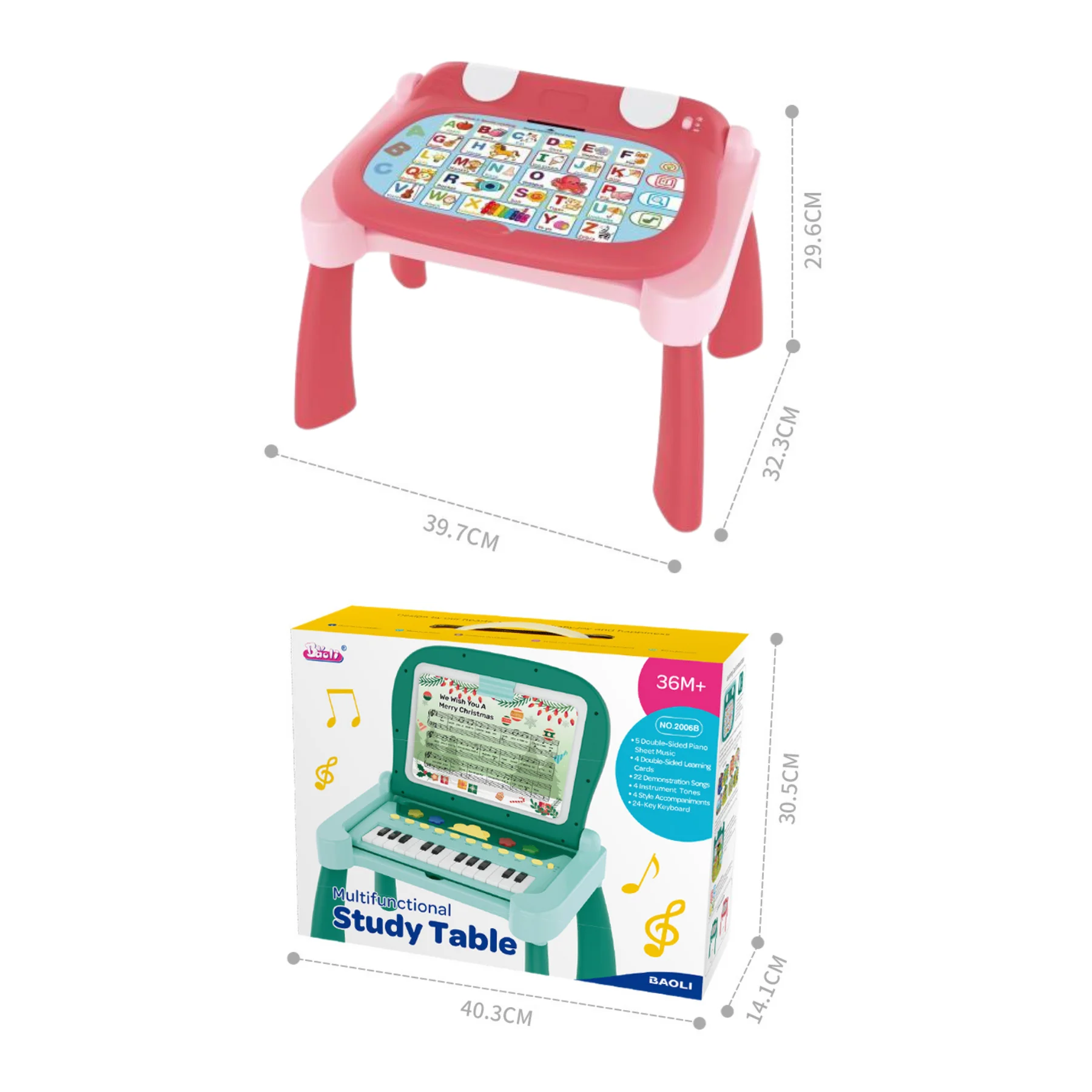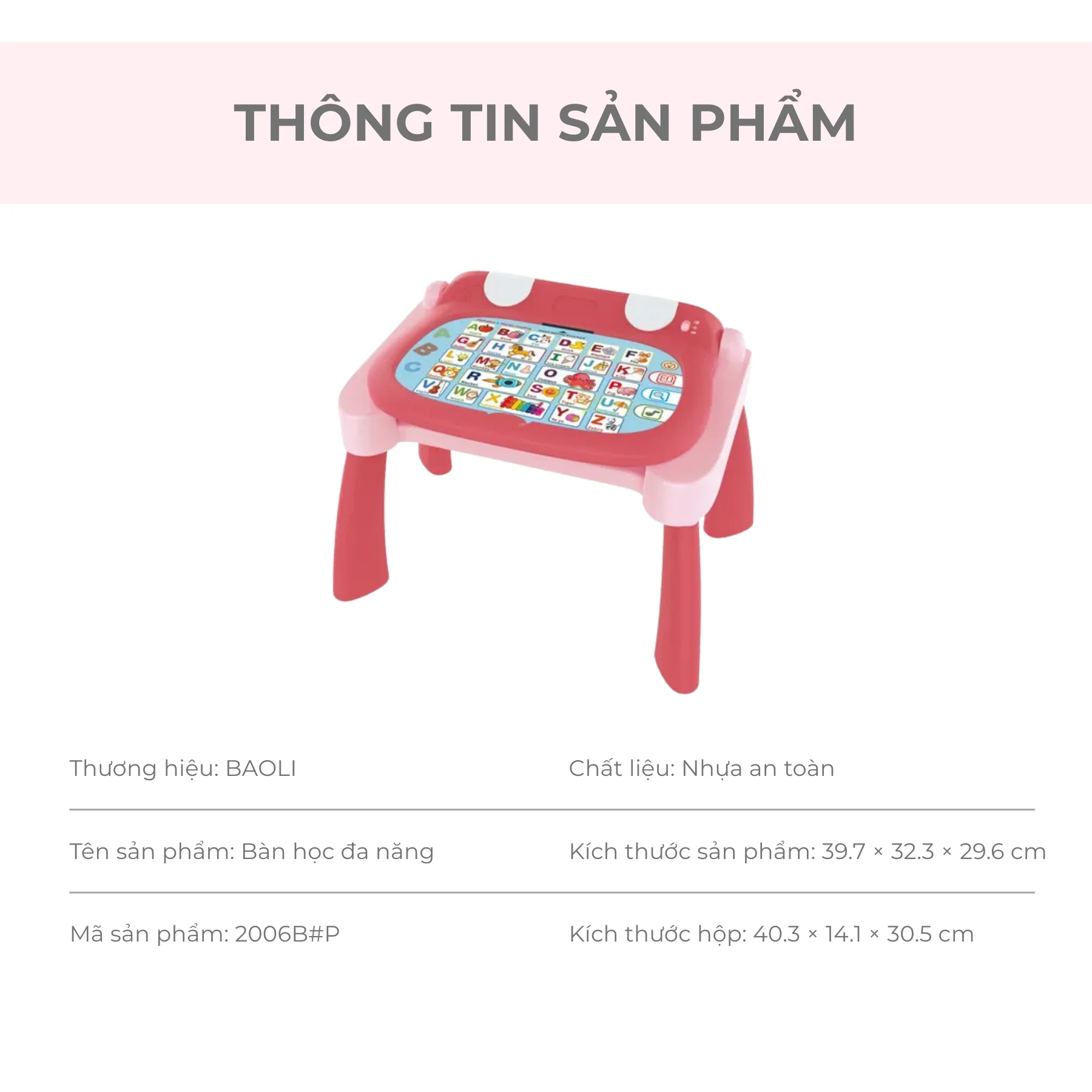 Đồ chơi bàn học nhạc màu hồng 3 trong 1 BAOLI 2006B#P là bộ đồ chơi giáo dục đa năng, tích hợp bàn học chữ cái, đàn piano cảm ứng và bảng vẽ sáng tạo. Giúp bé vừa học vừa chơi, rèn luyện cảm âm, tư duy logic và khả năng sáng tạo từ 3 tuổi trở lên.