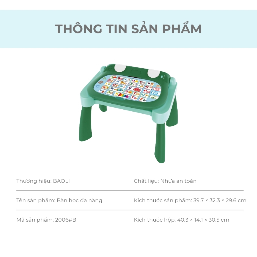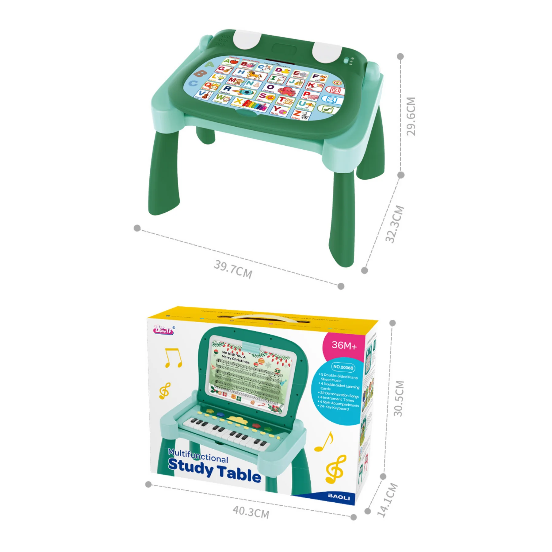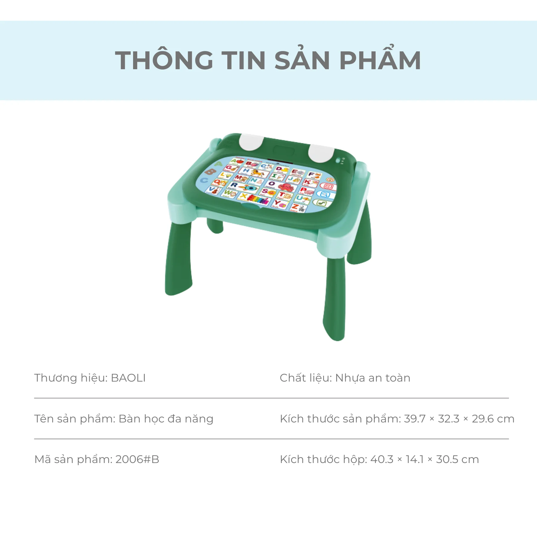 Đồ chơi bàn học nhạc màu xanh lá 3 trong 1 BAOLI 2006B#G là bộ đồ chơi giáo dục đa năng, tích hợp bàn học chữ cái, đàn piano cảm ứng và bảng vẽ sáng tạo. Giúp bé vừa học vừa chơi, rèn luyện cảm âm, tư duy logic và khả năng sáng tạo từ 3 tuổi trở lên.