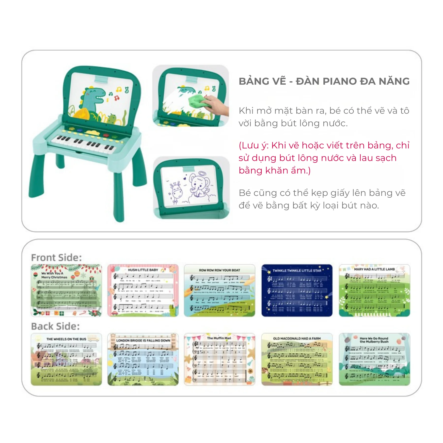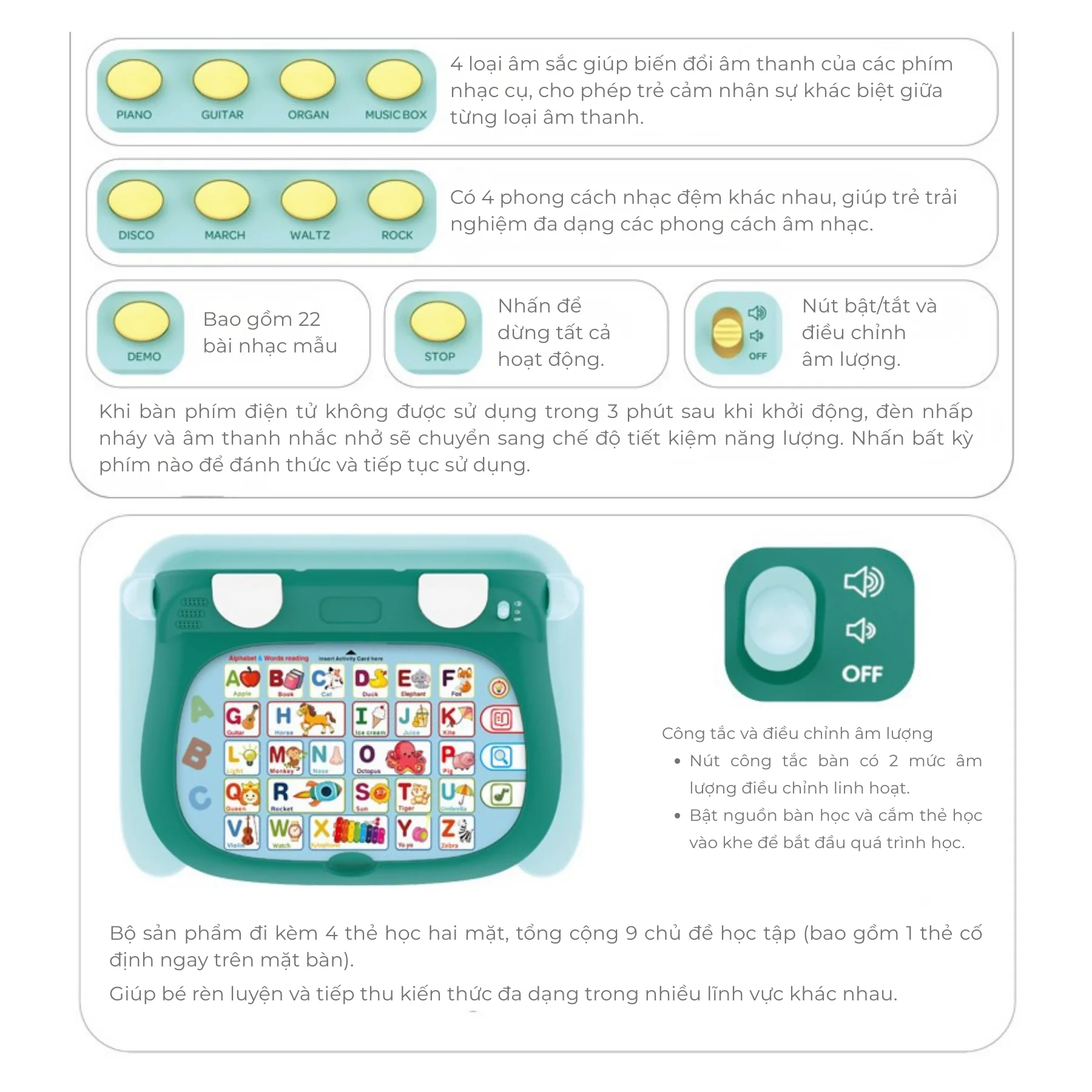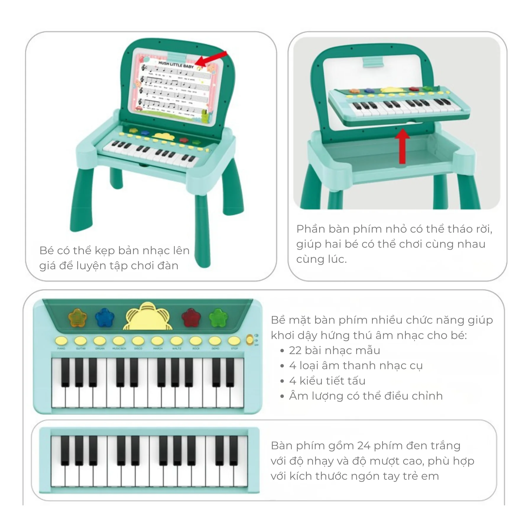 Thành phần: 1 bàn học, 1 đàn rời, 4 thẻ học 2 mặt, 5 thẻ nhạc 2 mặt