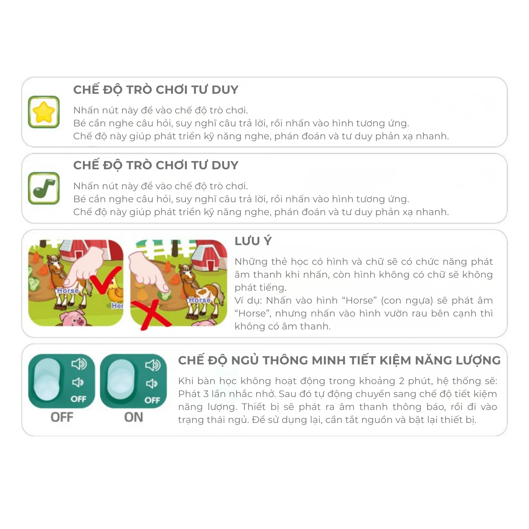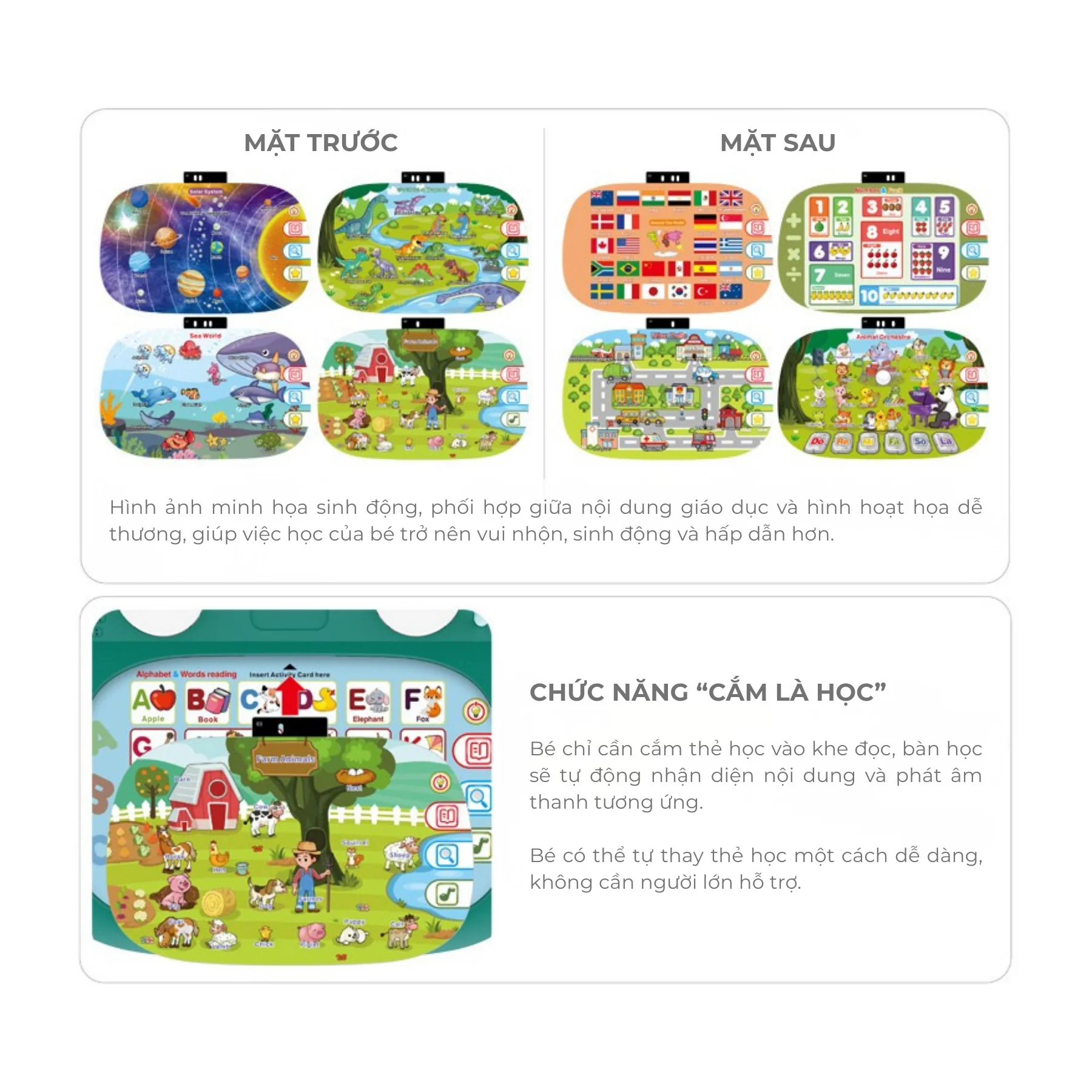 Tích hợp bảng chữ cái tương tác giúp bé nhận diện số, chữ, từ vựng, quốc kỳ, động vật.