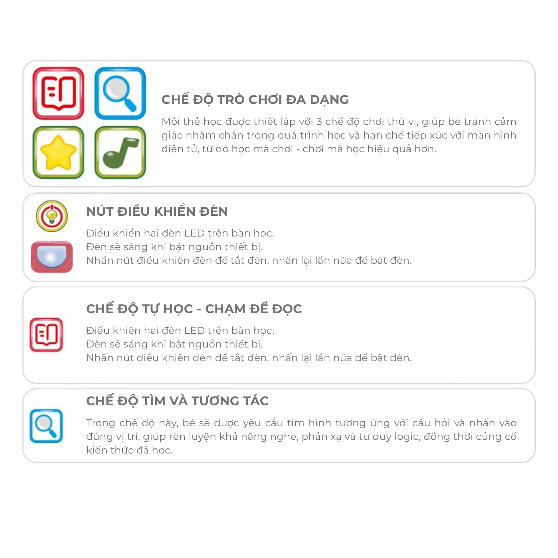 3 chế độ học thú vị: bàn học thông minh, đàn piano cảm ứng, bảng vẽ sáng tạo.