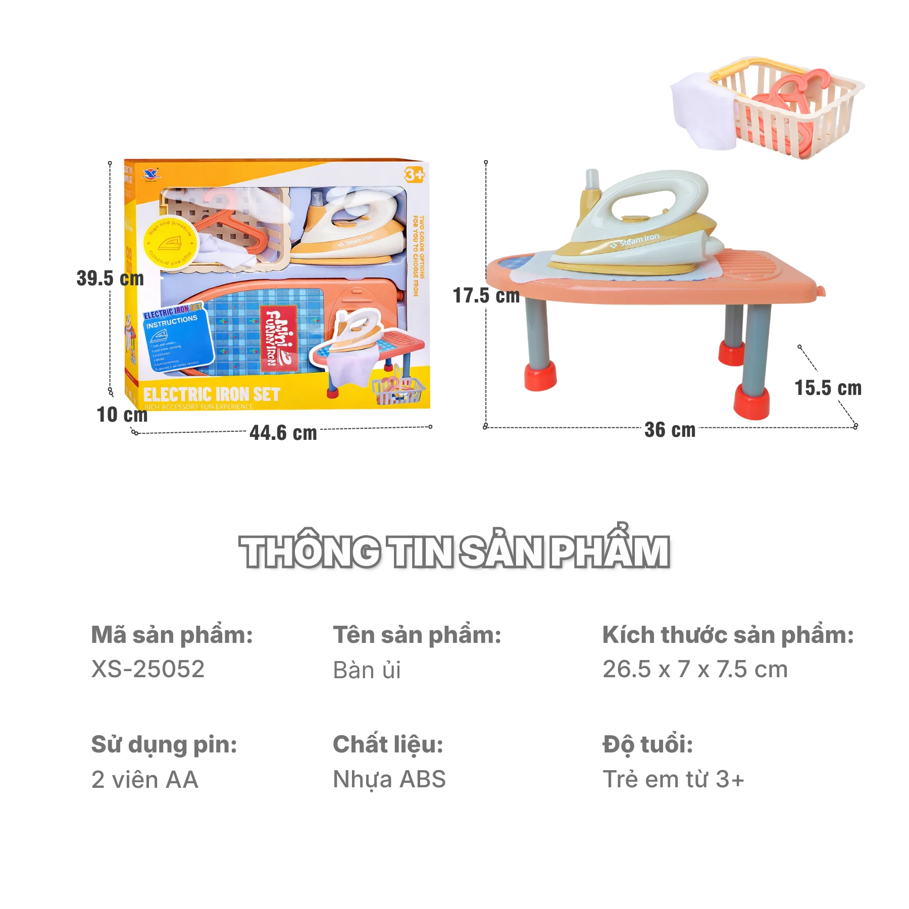 Bàn ủi đồ chơi XS-25052 mang thiết kế mô phỏng sinh động giống bàn ủi thật, kết hợp cùng bàn ủi mini và phụ kiện đi kèm, giúp bé dễ dàng nhập vai các hoạt động sinh hoạt gia đình một cách tự nhiên và vui nhộn. Sản phẩm có màu sắc hài hòa, hình dáng chắc chắn, phù hợp cho bé từ 3 tuổi trở lên.
