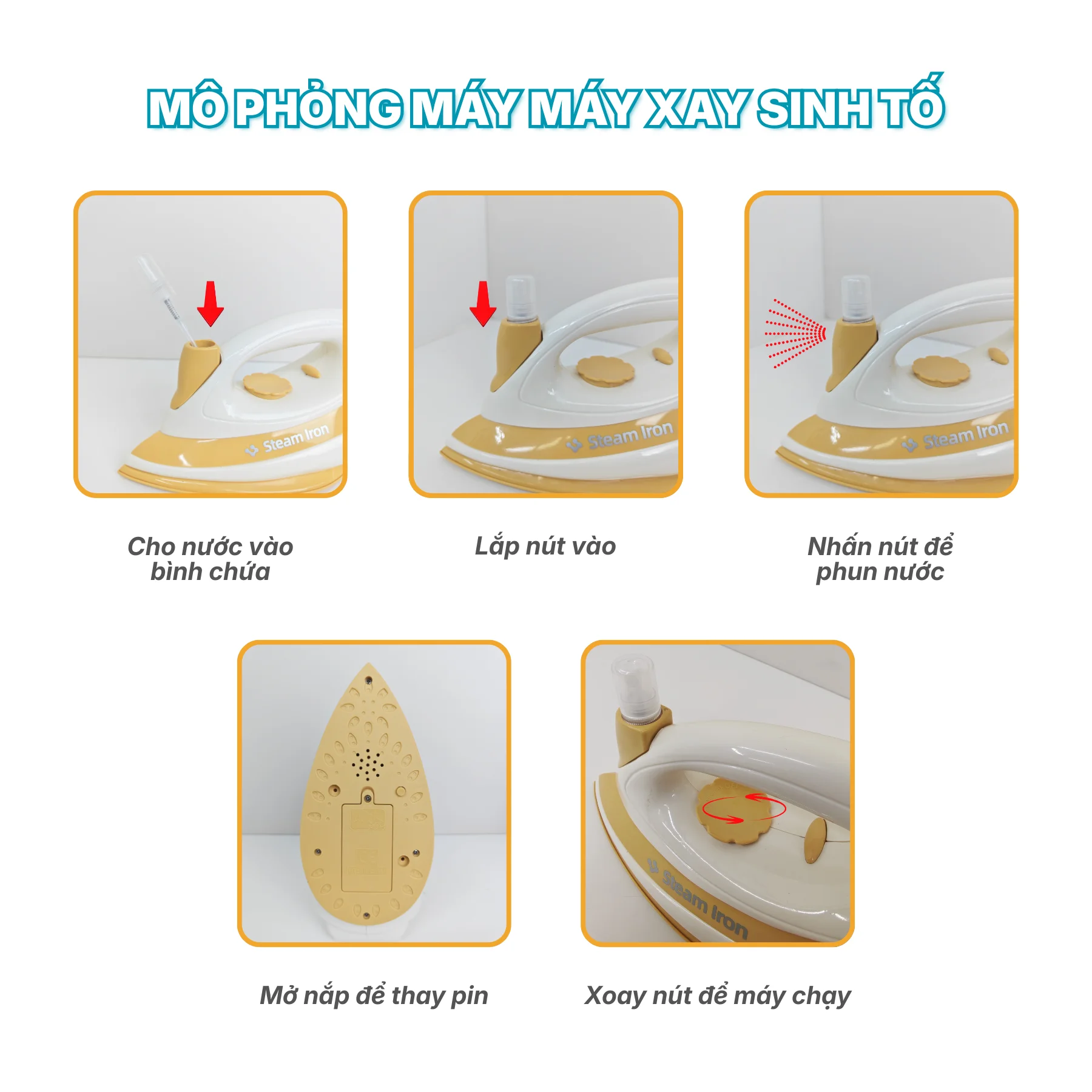 Bàn ủi hoạt động bằng pin, cho phép bé thực hiện các thao tác như bật – tắt, xoay nút chức năng và di chuyển bàn ủi trên bề mặt bàn, tạo cảm giác chân thực khi chơi. Đặc biệt, bàn ủi có chức năng phun nước mô phỏng, bé chỉ cần cho nước vào bình chứa, lắp nắp và nhấn nút để tạo hiệu ứng phun sương khi ủi.