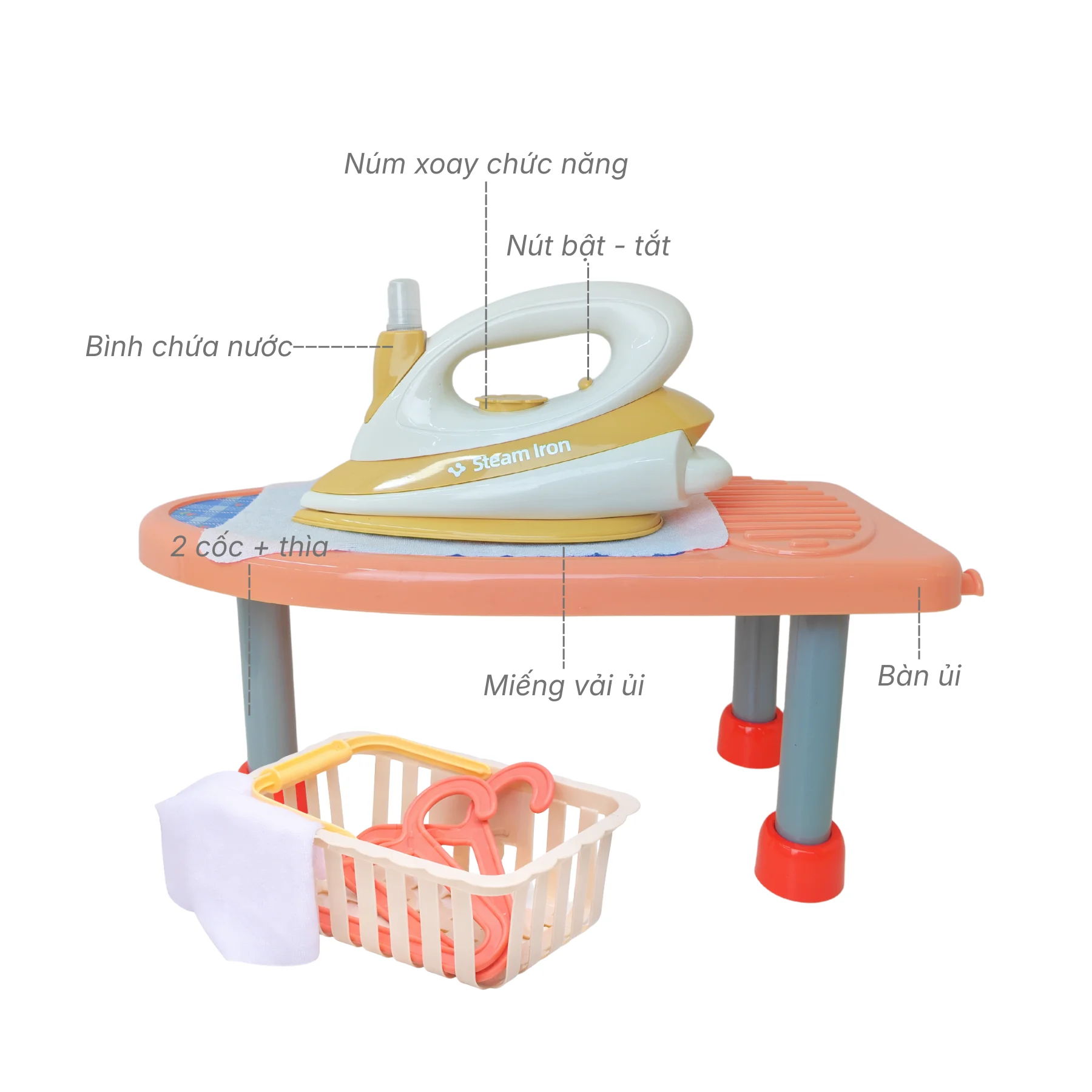 Bộ sản phẩm đi kèm bàn đặt ủi, giỏ đựng đồ, móc treo và miếng vải ủi, giúp bé hoàn thiện trọn vẹn quy trình “giặt – ủi – treo đồ”, từ đó tăng khả năng nhập vai và sáng tạo trong quá trình chơi.