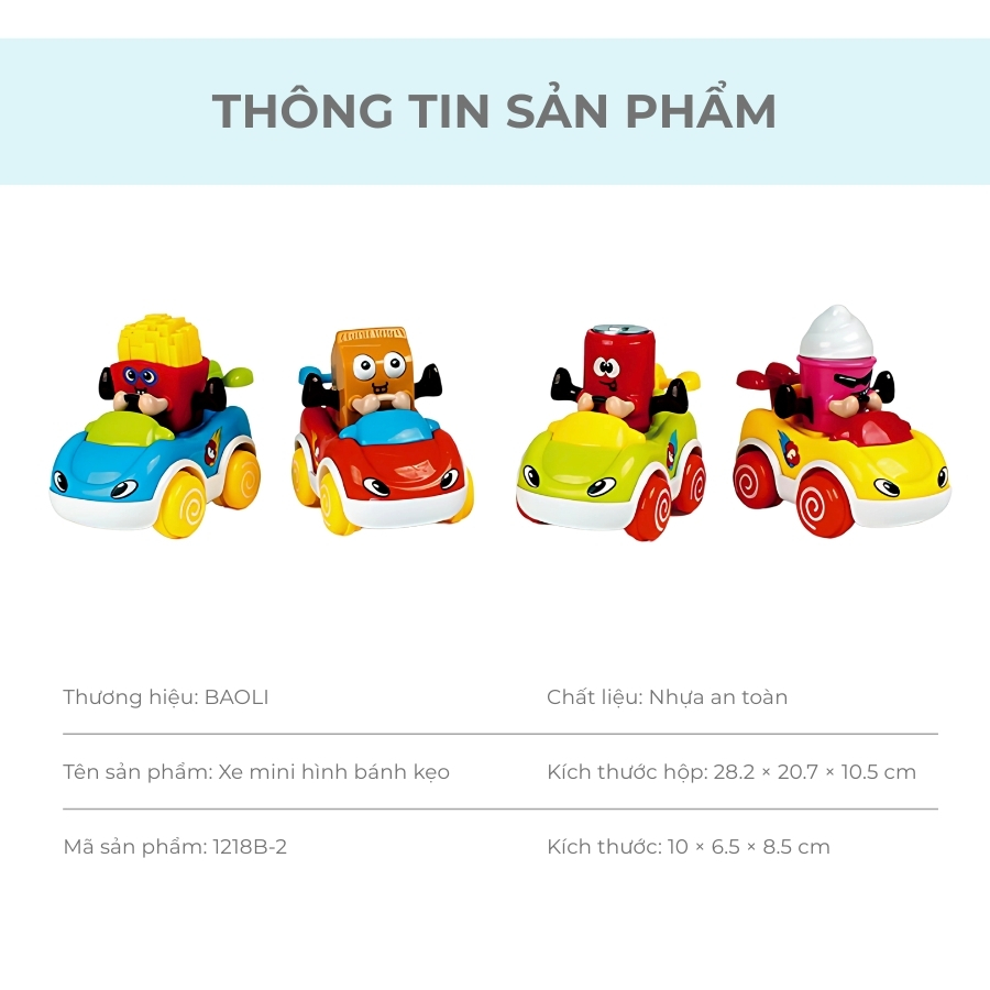 Đồ chơi bộ xe mini hình bánh kẹo BAOLI 1218B với thiết kế ngộ nghĩnh, chuyển động linh hoạt theo quán tính, không cần pin. Bé vừa chơi vui vừa học nhận diện đồ vật, tăng khả năng giao tiếp.