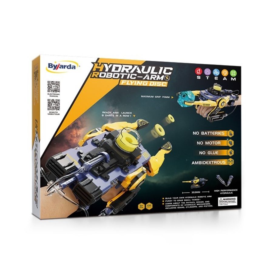 Đồ chơi cánh tay robot thủy lực phi thuyền bay màu vàng BYJARDA JX0201 gồm 106 chi tiết nhựa ABS cao cấp, cho phép bé tự tay lắp ráp thành cánh tay robot đeo tay độc đáo với 2 chế độ hoạt động: gắp vật và bắn đĩa bay. Hệ thống thủy lực mạnh mẽ giúp vận hành hoàn toàn thủ công, không cần pin hay động cơ, mang lại trải nghiệm vừa học vừa chơi hấp dẫn.