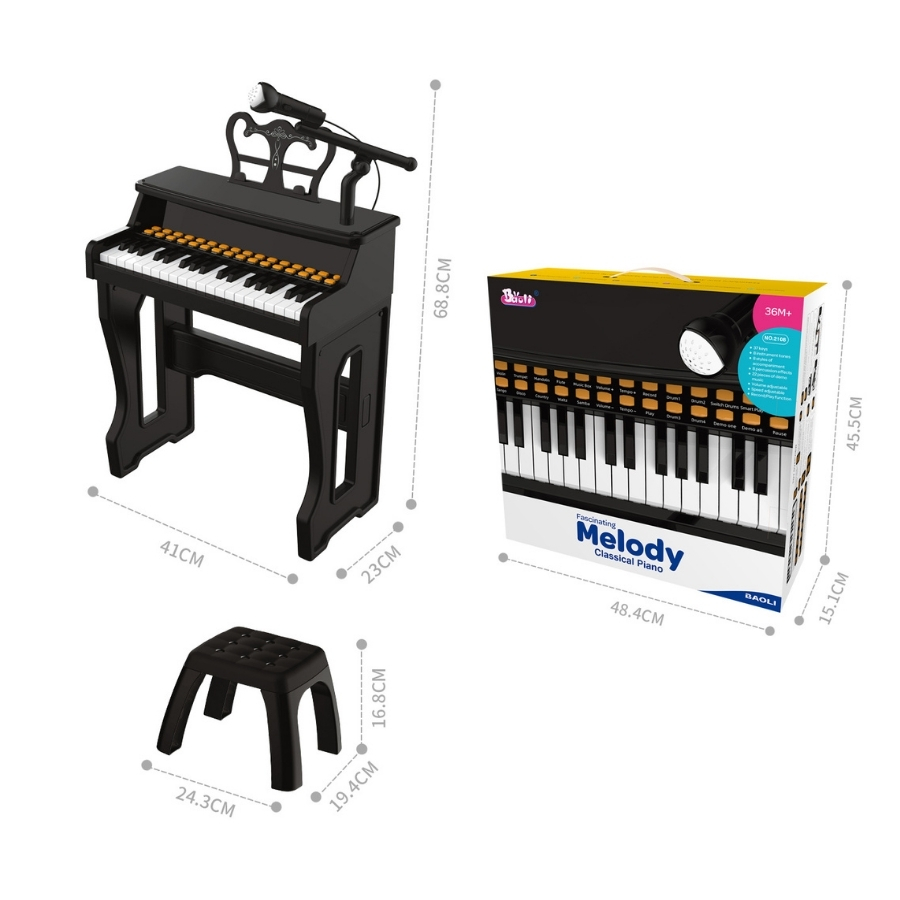 Đồ chơi đàn piano điện cổ điển màu đen BAOLI 2108#BL 37 phím đàn là lựa chọn hoàn hảo cho bé yêu âm nhạc. Sản phẩm tích hợp đa chức năng: vừa đàn, vừa hát karaoke với micro rời, nhiều chế độ âm thanh, điệu nhạc và tính năng thông minh. Thiết kế tinh tế kèm ghế ngồi, đồ chơi trẻ em từ 3 tuổi, giúp bé vừa học vừa chơi đầy hứng thú.