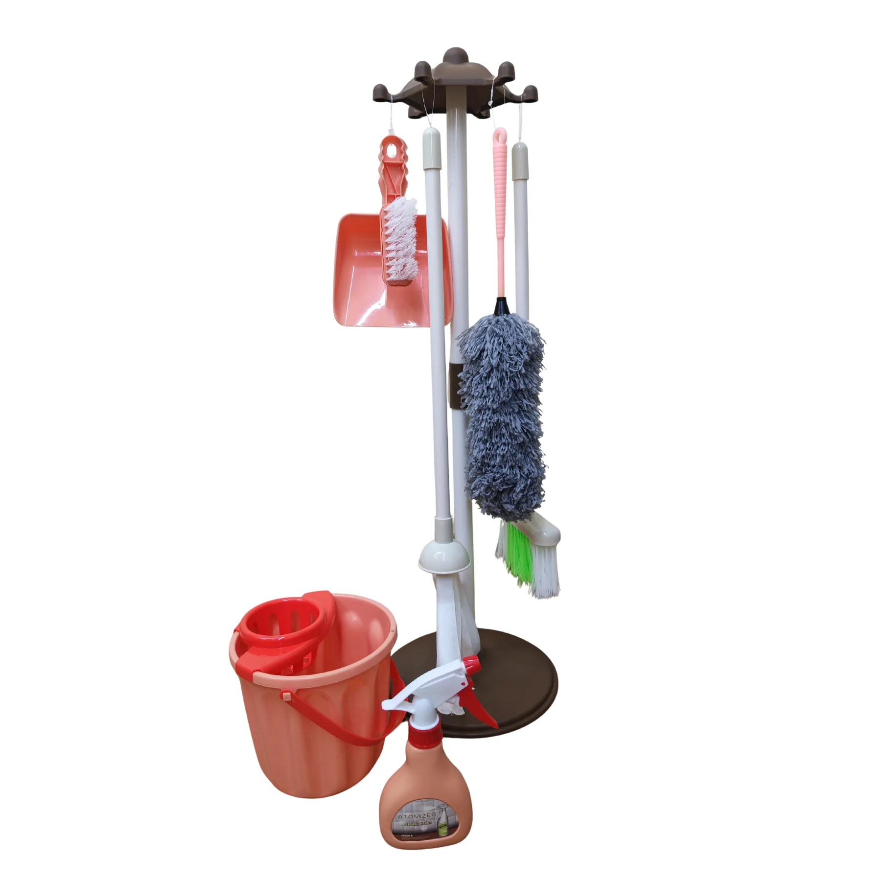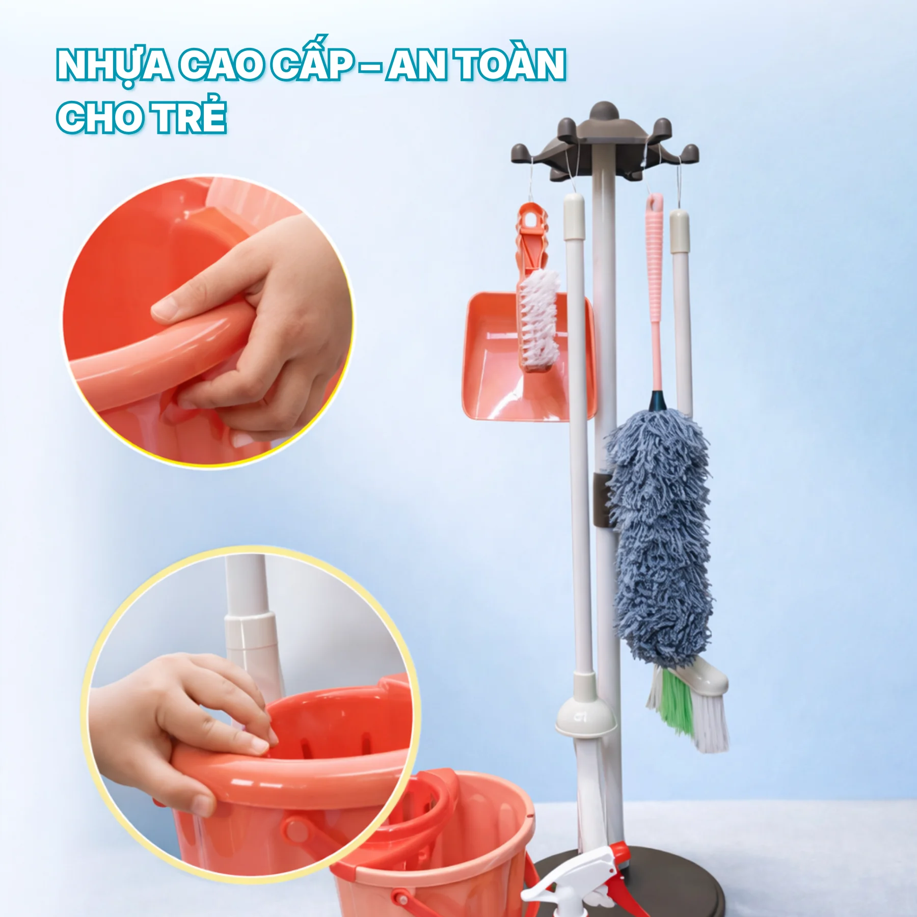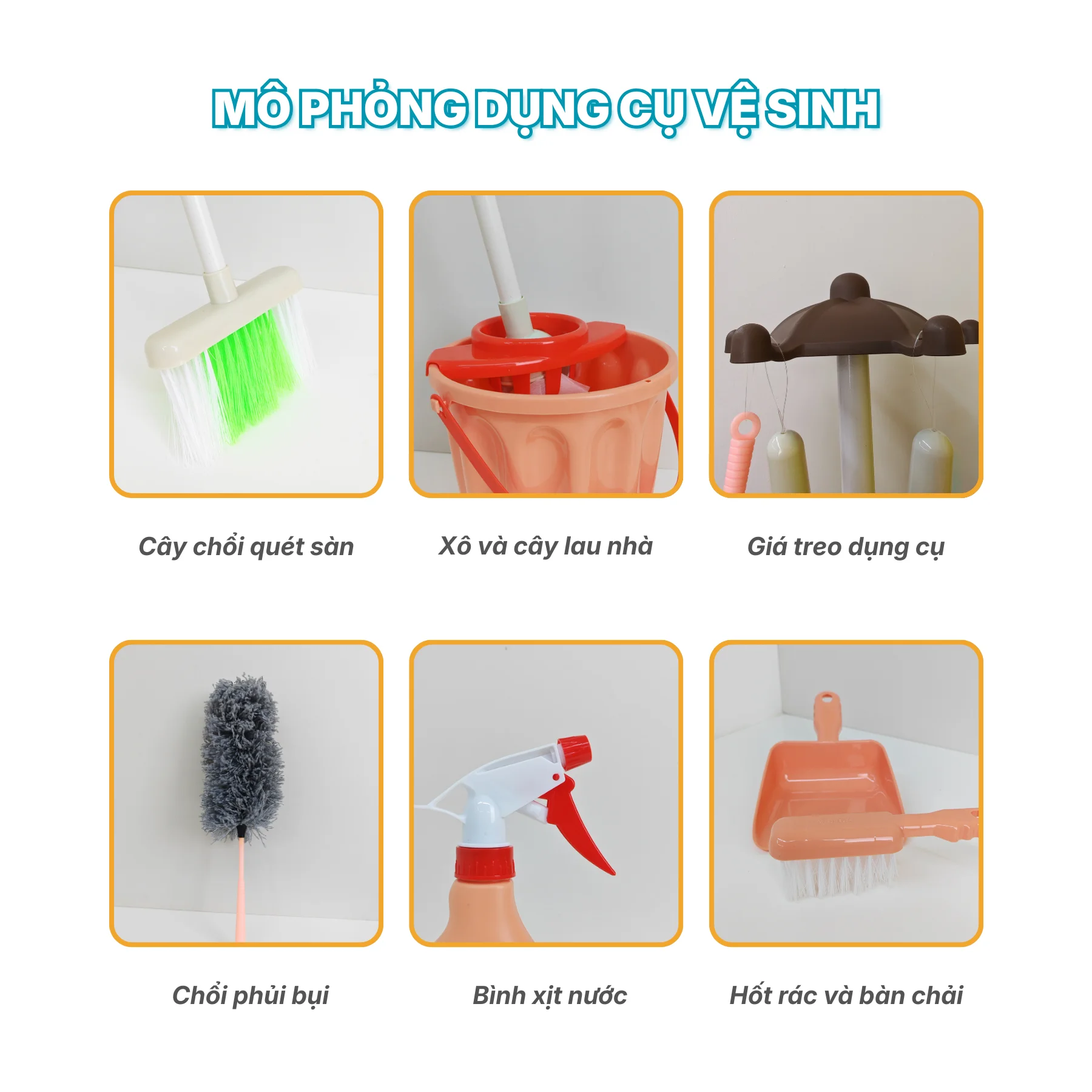 Bộ sản phẩm bao gồm đầy đủ các dụng cụ vệ sinh như chổi quét sàn, chổi phủi bụi, cây lau nhà, hốt rác, bình xịt nước, xô lau và giá treo đứng, giúp bé trải nghiệm trọn vẹn các hoạt động dọn dẹp hằng ngày. Mỗi chi tiết được mô phỏng sát thực tế, tăng cảm giác nhập vai khi chơi.