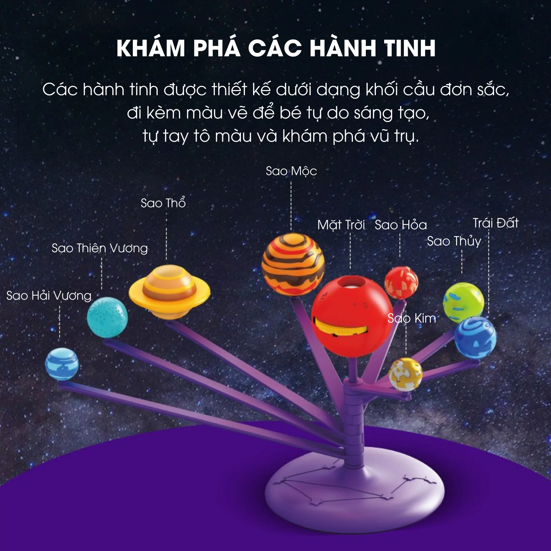 Mô hình giúp bé học về hệ hành tinh, mặt trời và nguyên lý chuyển động quay một cách trực quan và sinh động. Bé phát triển kỹ năng quan sát, sáng tạo, tư duy không gian và kiến thức thiên văn ngay từ nhỏ. Sản phẩm còn phù hợp cho các dự án khoa học tại nhà, lớp học STEM và câu lạc bộ khoa học.