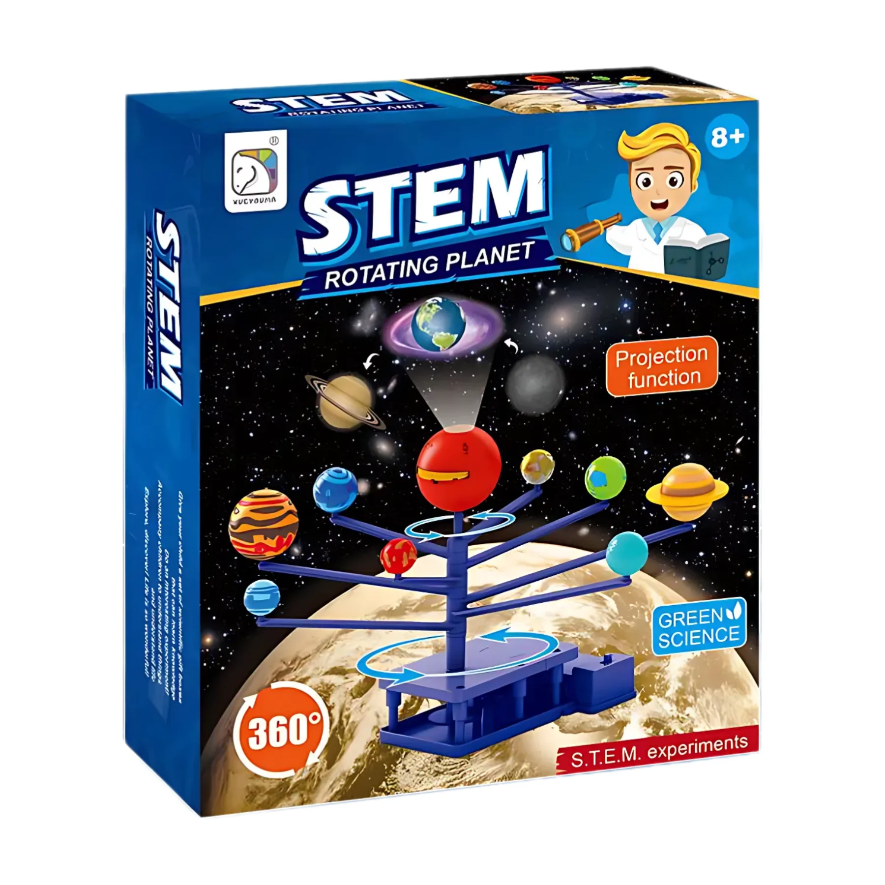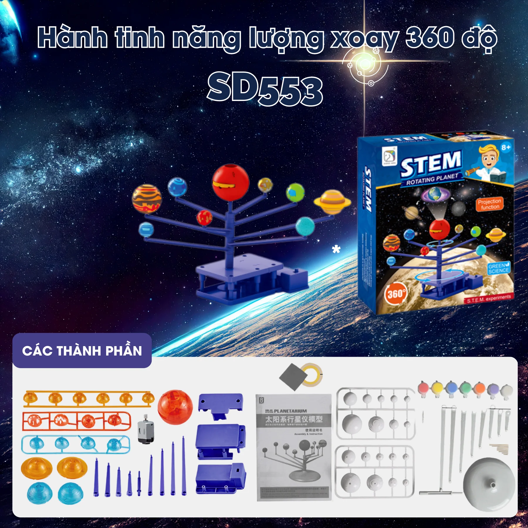 Đồ chơi hành tinh năng lượng xoay 360 độ SCIENCE HORSE SD553 mang đến cho bé trải nghiệm học tập trực quan về thiên văn. Bé sẽ tự tay lắp ráp mô hình với 8 hành tinh và mặt trời trung tâm, quan sát chuyển động quỹ đạo 360° cùng hiệu ứng ánh sáng mô phỏng mặt trời. Sản phẩm đạt tiêu chuẩn an toàn CE – EN71 – RoHS, phù hợp cho trẻ từ 8 tuổi trở lên, theo định hướng giáo dục STEM.