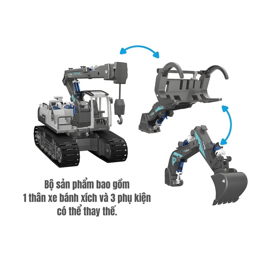 Linh kiện lắp ráp 3 đầu thiết bị: máy xúc, cần cẩu, xe bốc gỗ.