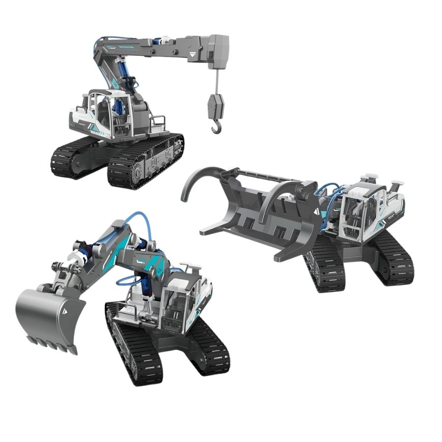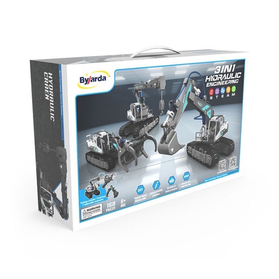 Đồ chơi lắp ráp kỹ thuật thủy lực 3in1 BYJARDA – máy xúc, cần cẩu, bốc gỗ GC0107 gồm 168 chi tiết nhựa kỹ thuật cao cấp, cho bé tự tay chế tạo và vận hành 3 mẫu xe công trình: máy xúc, cần cẩu và xe bốc gỗ. Hoạt động hoàn toàn bằng cơ cấu thủy lực không dùng pin, bộ sản phẩm giúp bé khám phá nguyên lý Pascal, cơ chế truyền lực và rèn luyện tư duy kỹ thuật qua từng thao tác điều khiển.