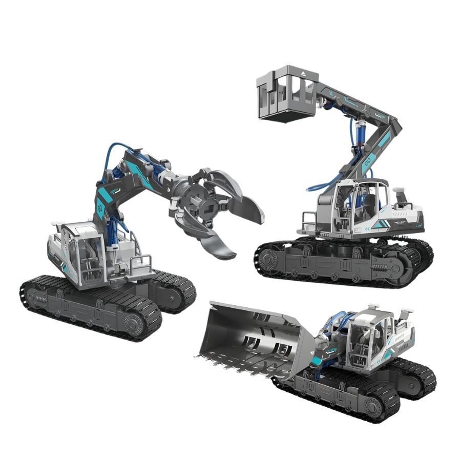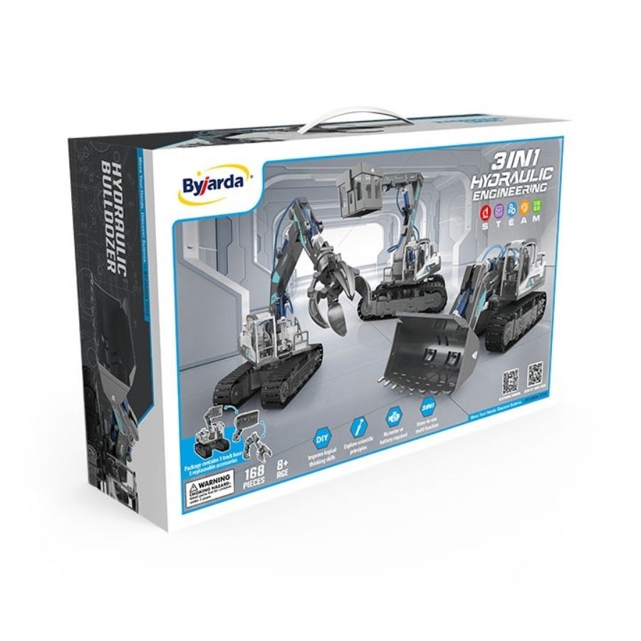 Đồ chơi lắp ráp kỹ thuật thủy lực BYJARDA 3in1 – xe ủi, cứu hỏa, gắp vật thể GC0108 gồm 168 chi tiết nhựa ABS cao cấp, cho phép bé tự tay lắp ráp và vận hành 3 mô hình xe công trình: xe ủi, cần gắp vật thể và xe cứu hỏa nâng người. Vận hành hoàn toàn bằng hệ thống thủy lực thủ công, không dùng pin hay động cơ, giúp bé khám phá nguyên lý truyền lực và cơ cấu máy móc một cách trực quan, thú vị.