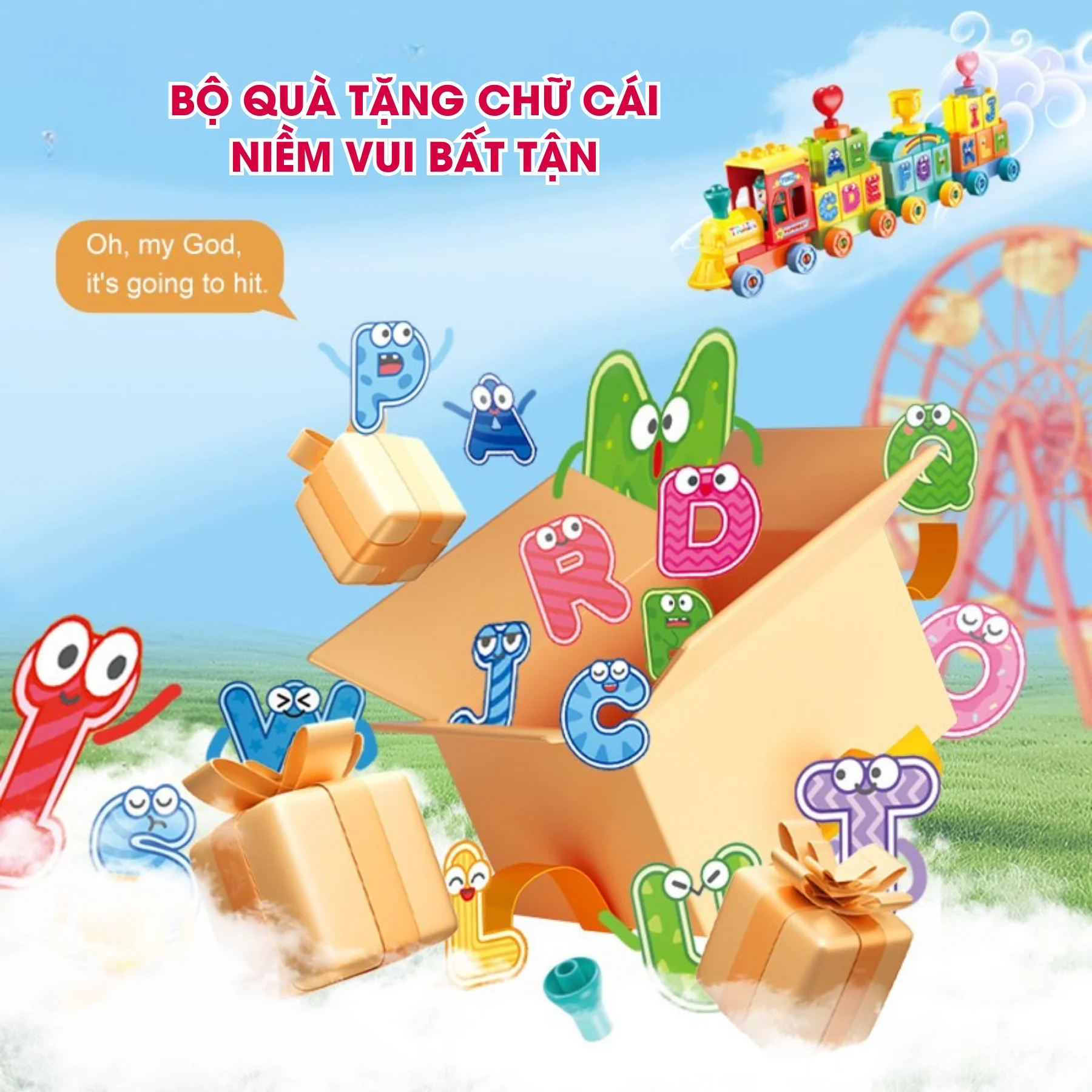 Đoàn tàu gồm đầu máy, nhiều toa nối tiếp mang chữ cái từ A đến Z.