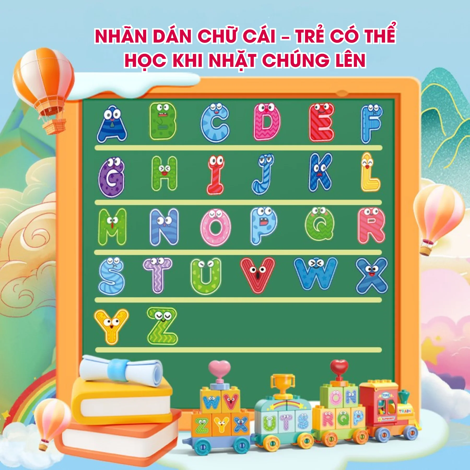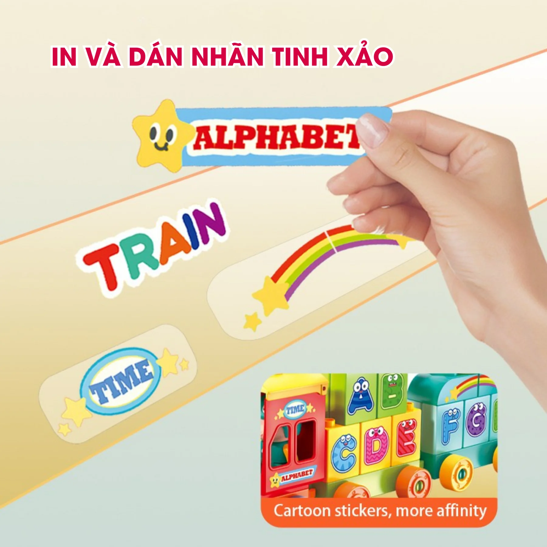 Khối chữ được in màu sắc rực rỡ, sticker sinh động dễ ghi nhớ.
