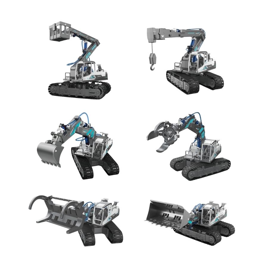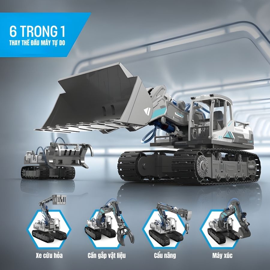 Đồ chơi lắp ráp thủy lực 6 trong 1 BYJARDA GC0109 gồm 223 chi tiết, cho phép bé lắp ráp 6 mô hình cơ khí khác nhau như xe múc, xe cứu hỏa, xe cẩu, xe gắp vật liệu, xe ủi và xe xúc lật. Cơ chế thủy lực mô phỏng chân thực, không dùng pin hay điện, giúp bé vừa chơi vừa học nguyên lý vận hành máy móc. Sản phẩm là công cụ giáo dục STEAM tuyệt vời, phù hợp cho bé từ 8 tuổi trở lên.